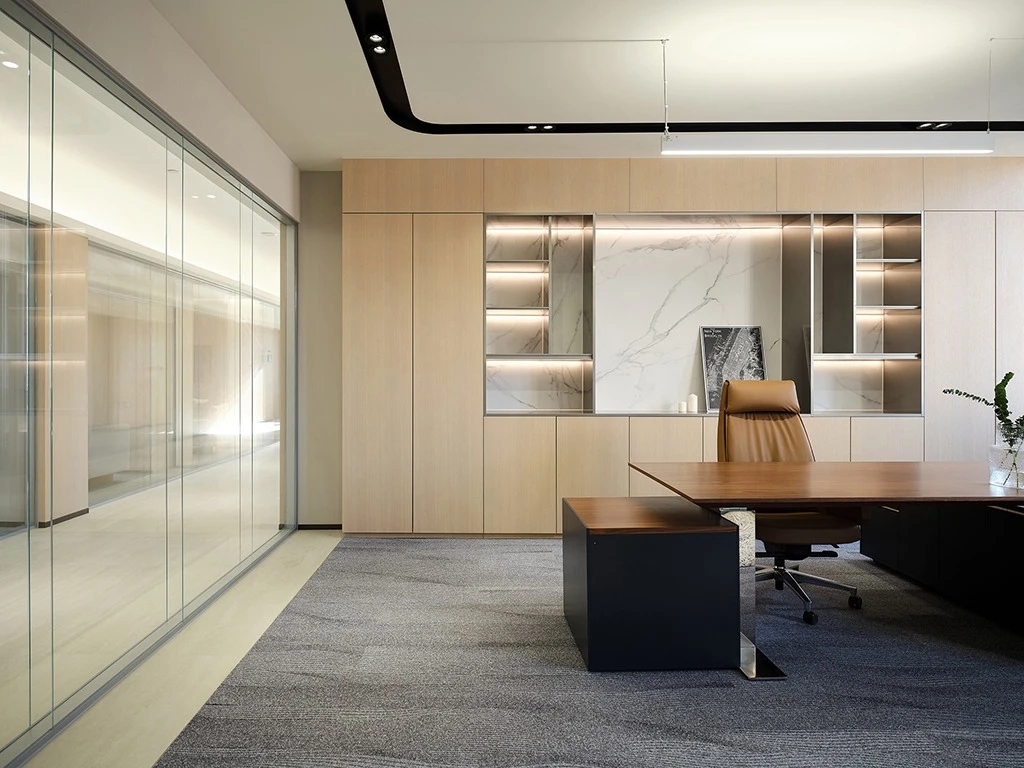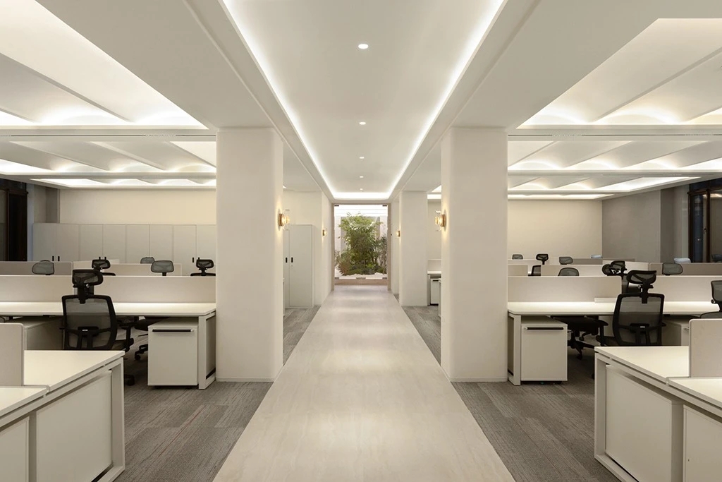 南面办公区设置为临时办公与会议区,属于有对外性质的空间。走道空间作为会议区与办公区间的灰空间,同时兼具了临时等待区的功能,因此在天花设计上,将等待区天花高度适当下降,提供了较为静态的动静区分割。