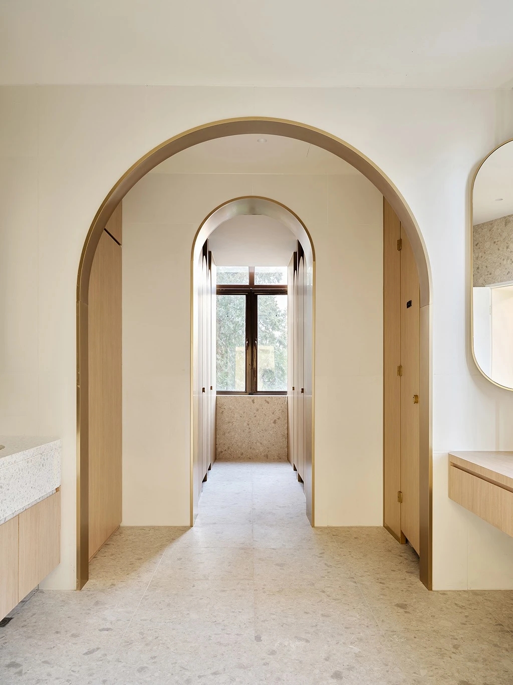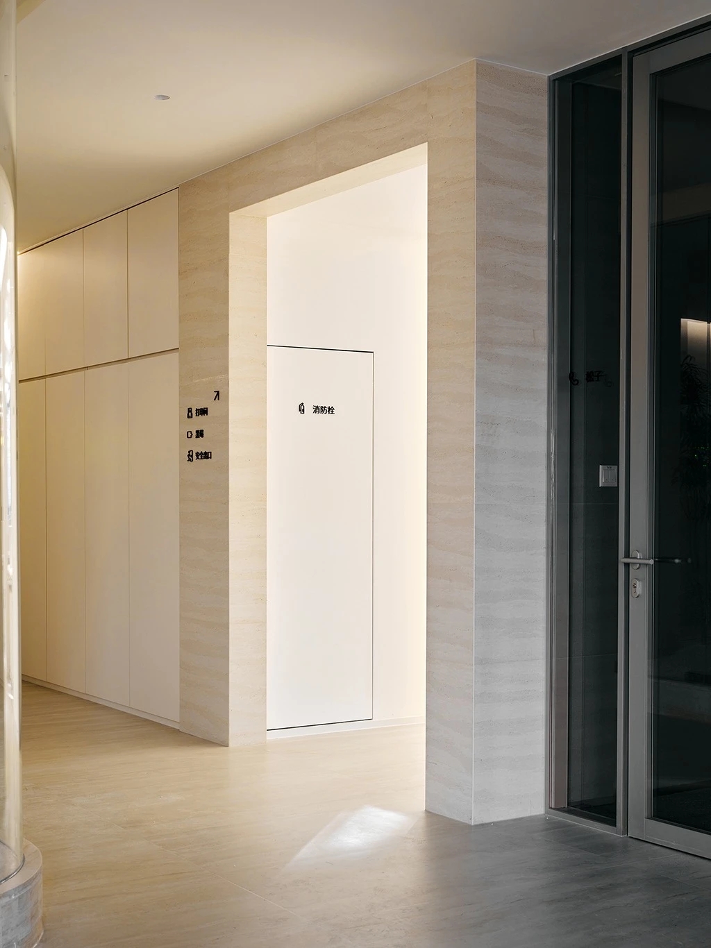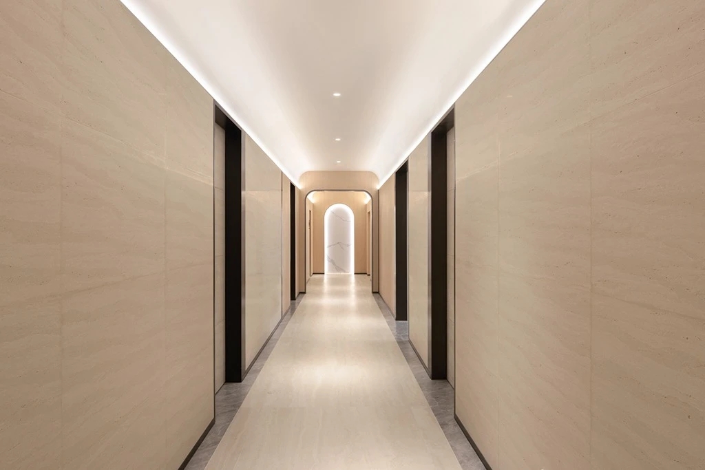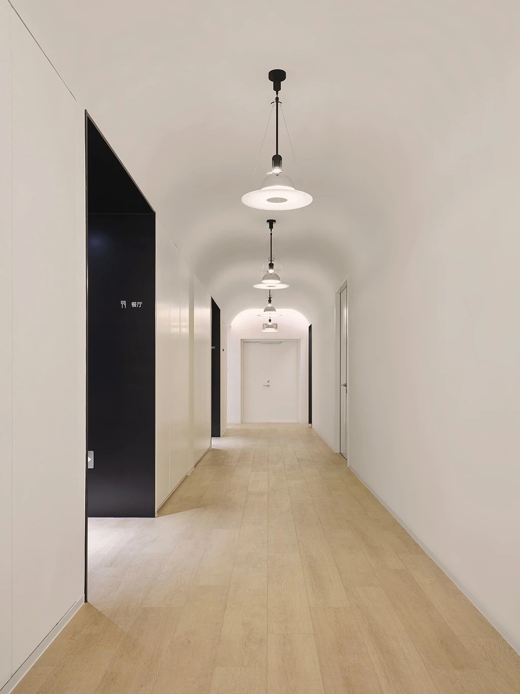 三层南北过道延续了一层与二层的弧形元素,但在设计与材质上有所区别,使三层空间整体材质在统一中,根据细微的差异体现出不同的氛围。