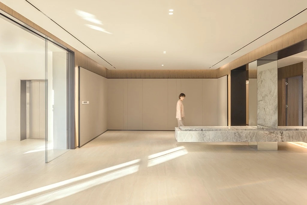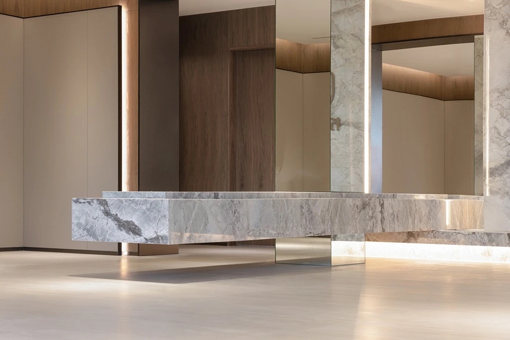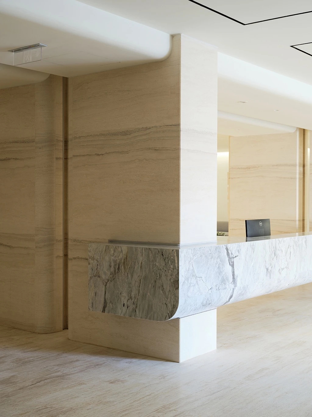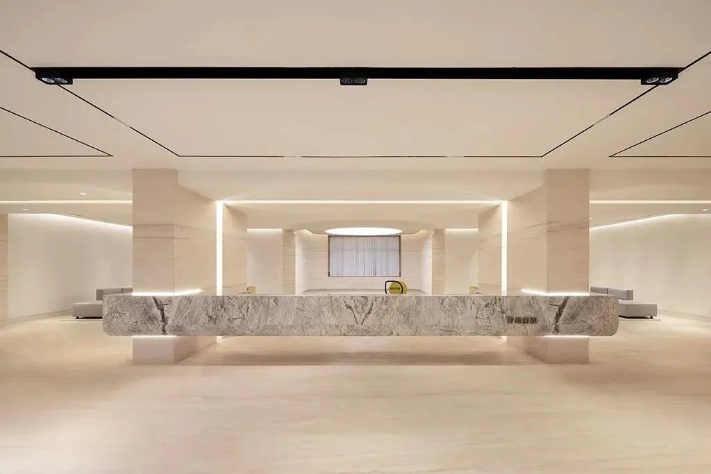 走进室内,先进入到的是一层空间枢纽的接待区,7米2长的悬挑前台首先映入眼帘,石材与石材之间的相嵌关系,将大堂各自为阵的体块关系连接在了一起,并弱化了在大堂视觉中心的四根结构柱。