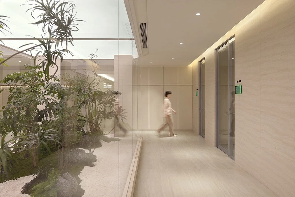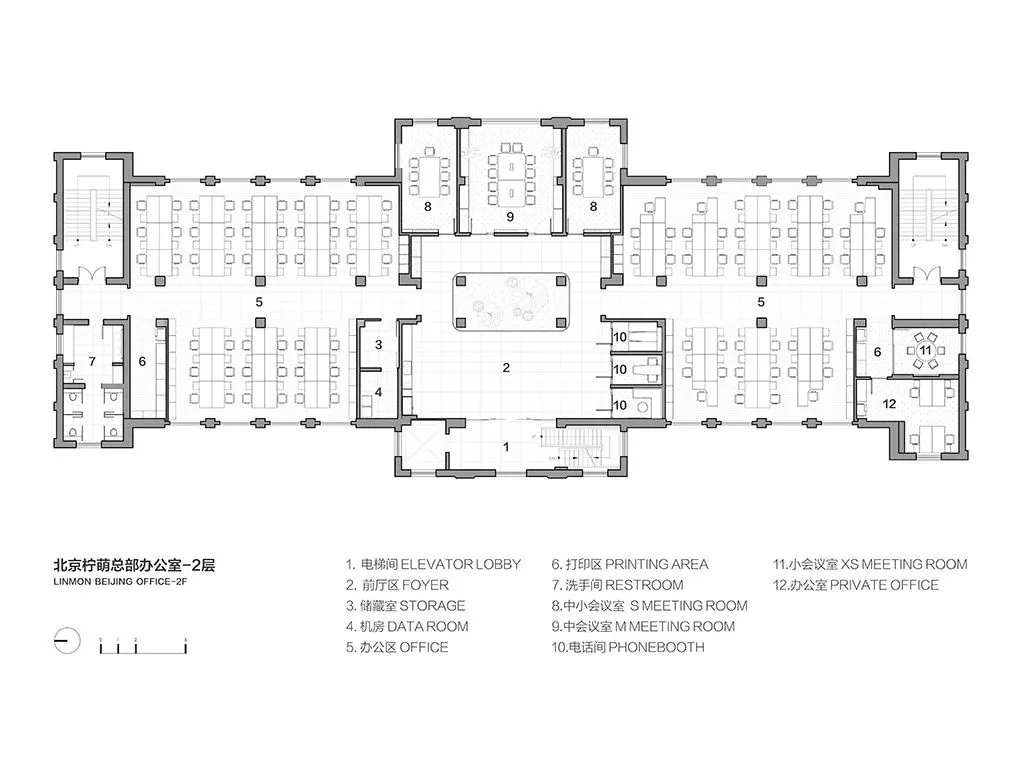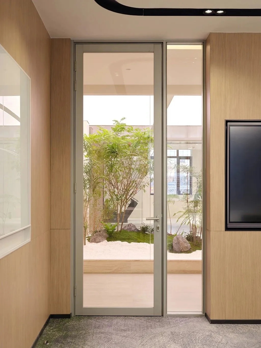 二层的中心区域为前厅区,以玻璃盒绿植区为核心,作为二层空间的主视觉,在二层入口及各个主动线上均能将视线落在绿植区。除此之外,在布局上也模拟了四合院的空间关系,将前厅区围绕著玻璃盒绿植区布置了会议区、茶水区与电话间等人与人交流的空间,利用了二层洄游动线的属性,使之承担了整个办公层的交互纽带。