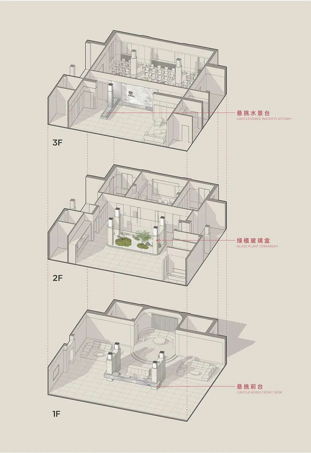 三层区别于一层与二层,材料应用上更为多元与深沉,前厅的悬浮水景台,除了造景的目的外,也同时提供了一个动线导向性,区别于一层与二层的洄游动线,将更多的动线导向南侧,为北侧的接待空间提供了进一步的隐私。