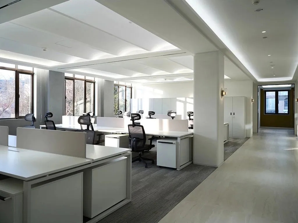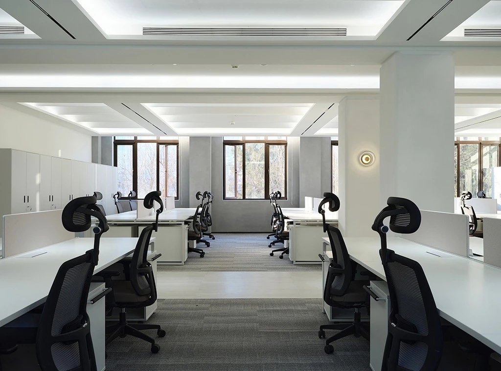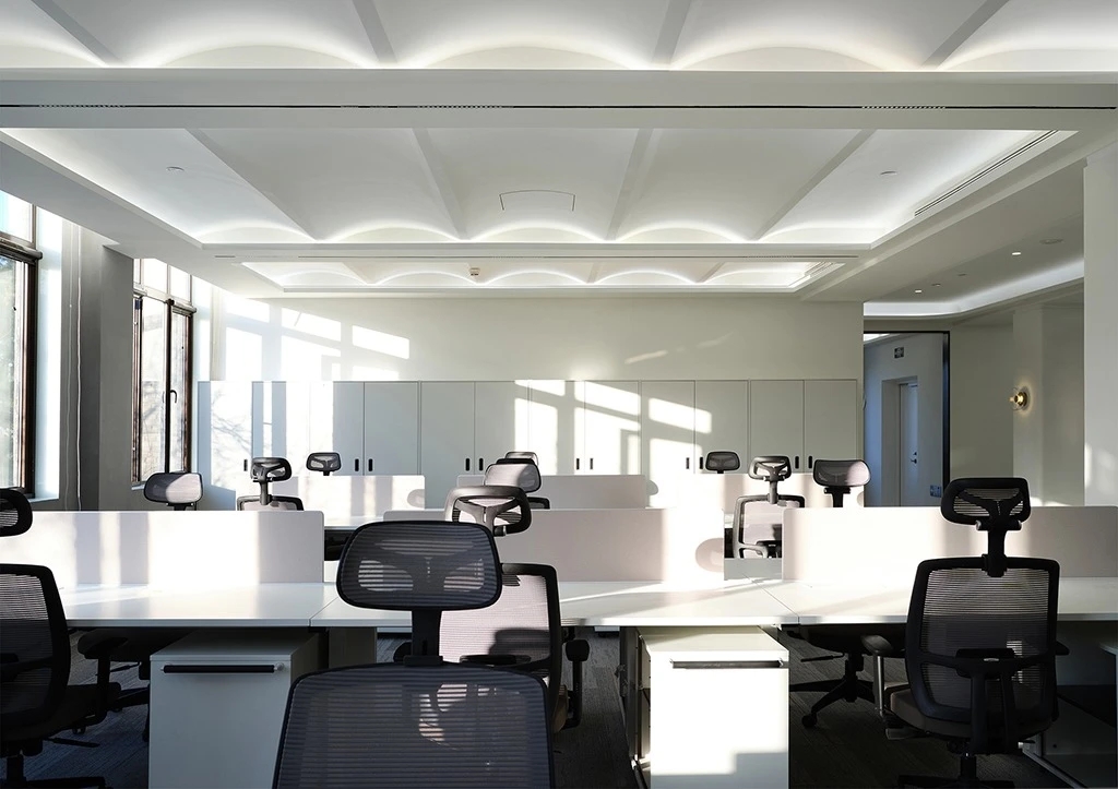 开放办公区呼应了原有建筑结构的秩序与节奏,天花以圆弧造型与间接照明相互搭配,给予办公区更柔和适宜的灯光氛围。间接照明利用了工位线性灯上方的空间配置了灯带向上打光,使圆弧造型光线从边缘柔和的晕染开来。