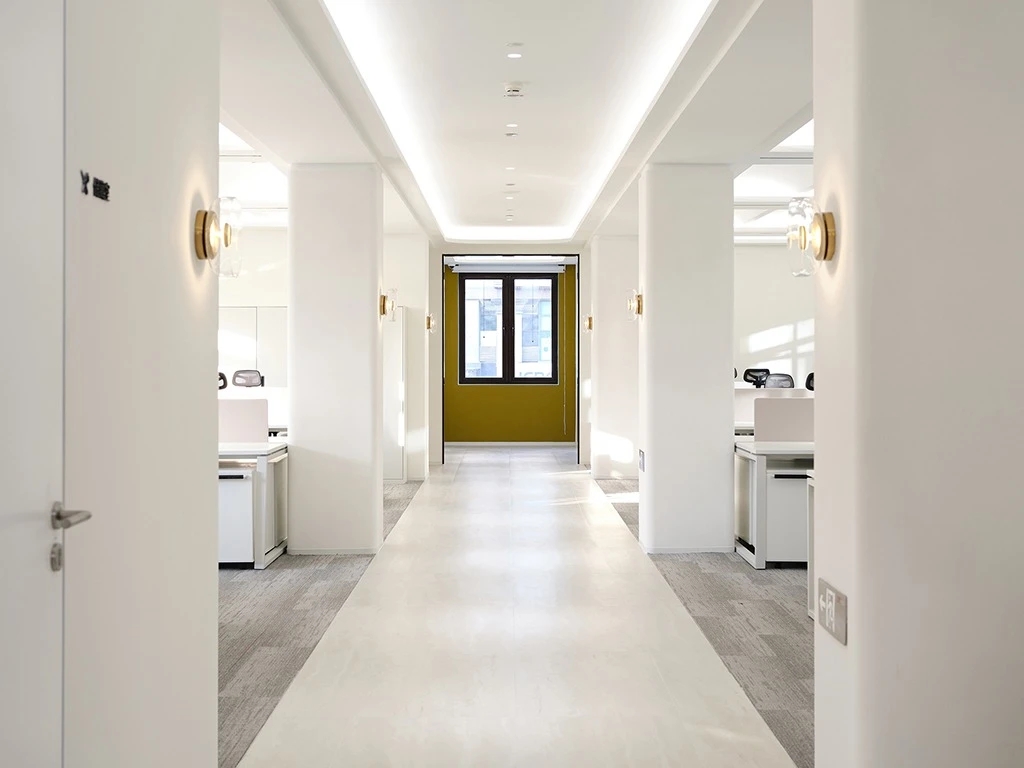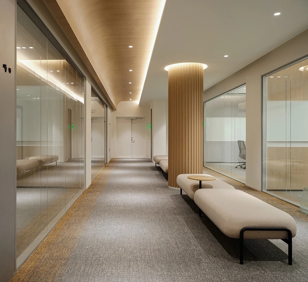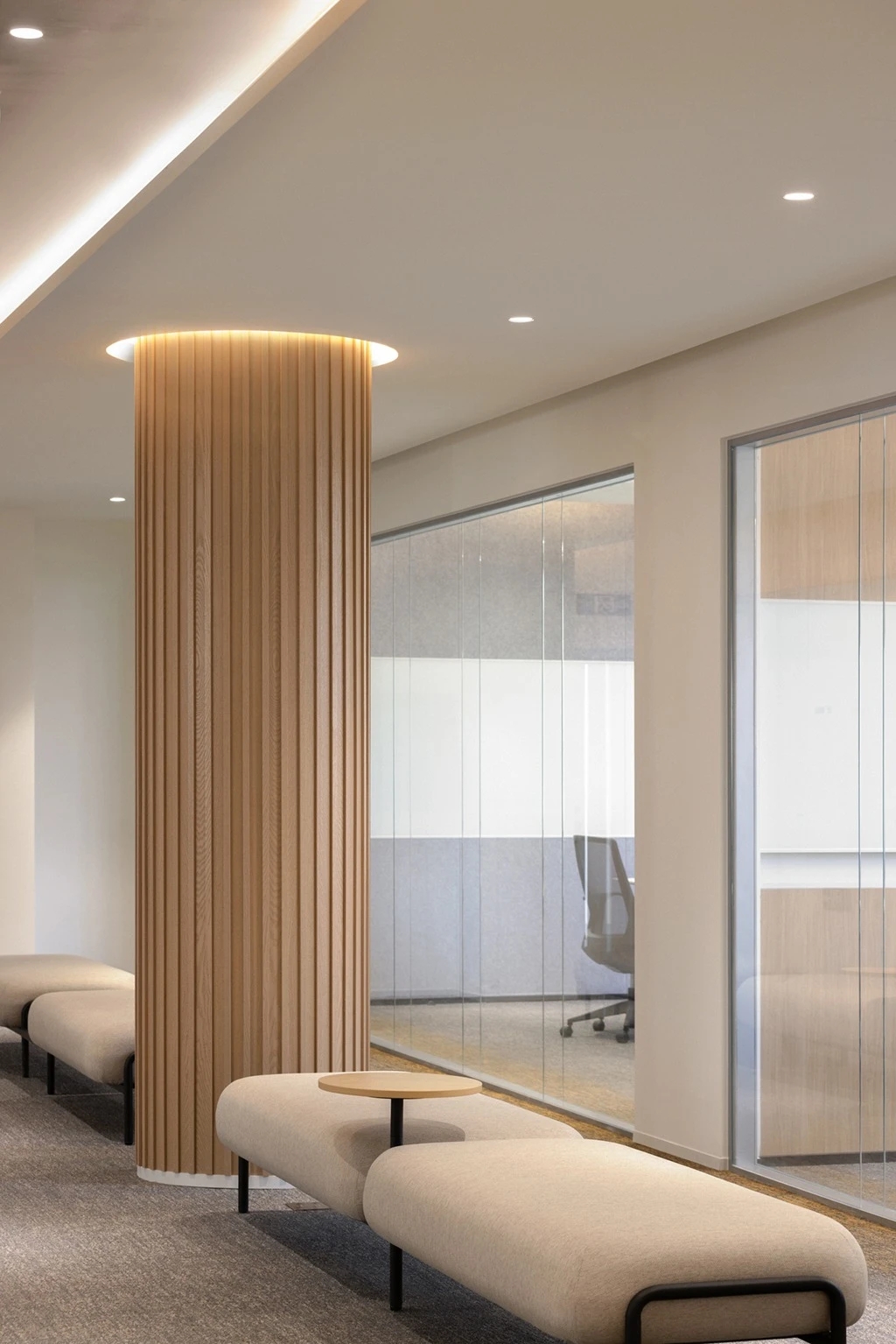 二层作为主要办公区,南北两侧基本为对称布局,过道两侧结构柱以壁灯进行点缀,界定开放办公区空间界线的同时,增添了灰空间的柔和氛围。