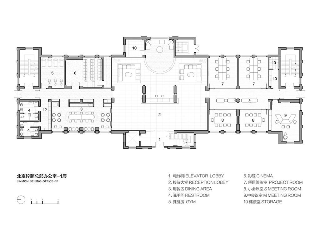 三层楼每层楼平均面积约1200平米,楼层规划上,根据隐私程度不同,由一楼至三楼递增;一楼包括接待大堂、餐厅、影院、健身房、会议室等,二楼为主要办公与会议区,三楼则由办公室 、大会议室与接待空间组成。