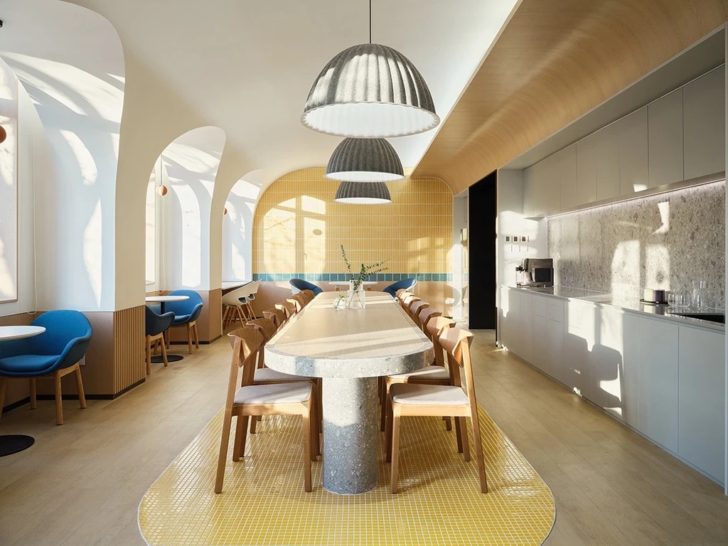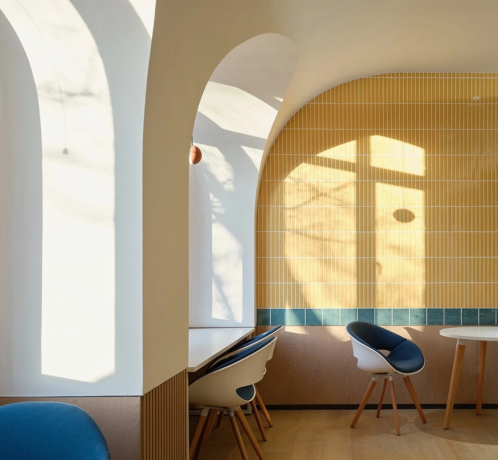 餐厅区以亮黄色强化了品牌形象,与木色搭配的同时,利用拱形造型,将空间氛围区别于其他区域,营造出了较为轻松活泼的用餐场景,希望员工与访客能在用餐时充分休息与转换心情。