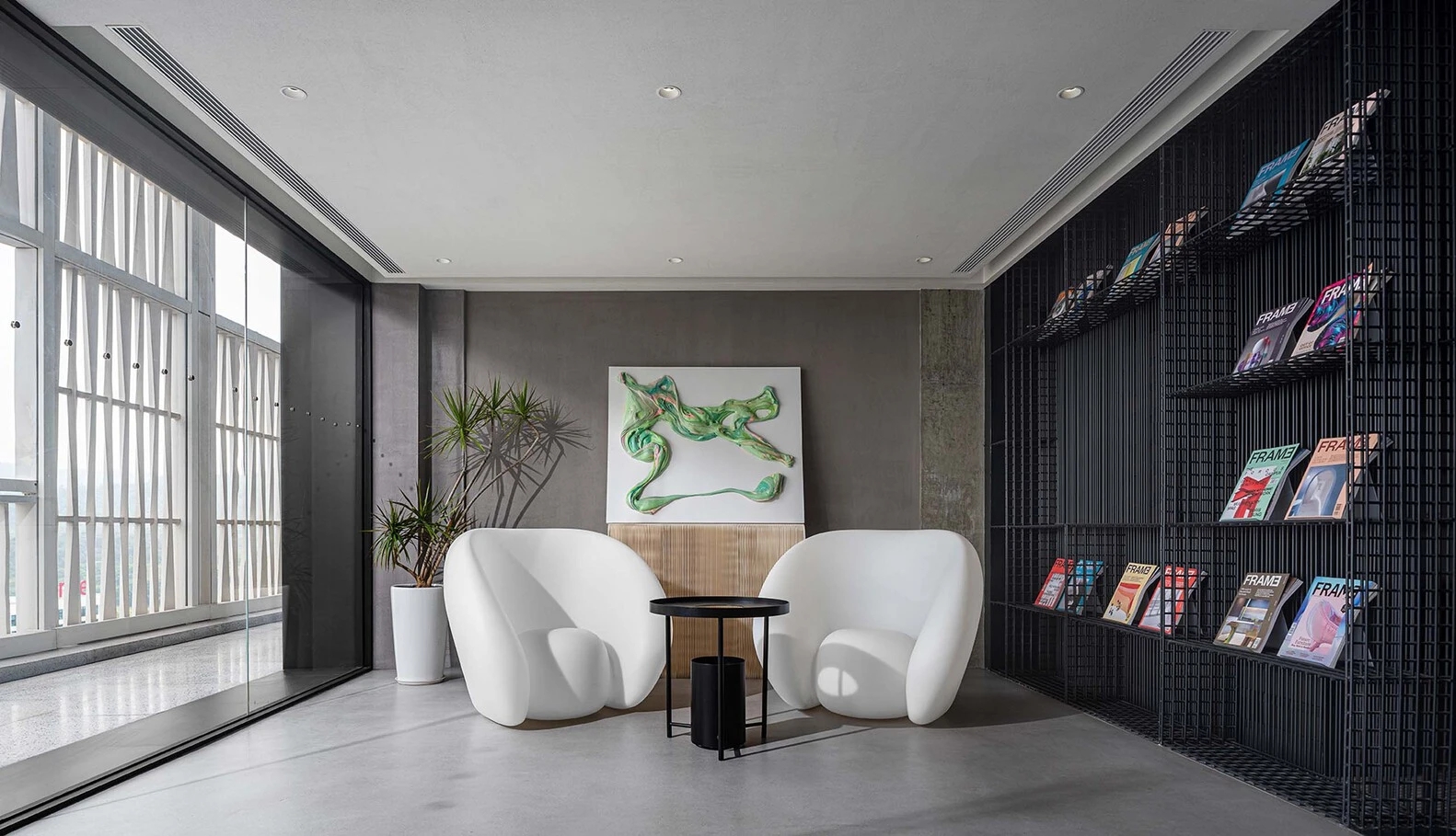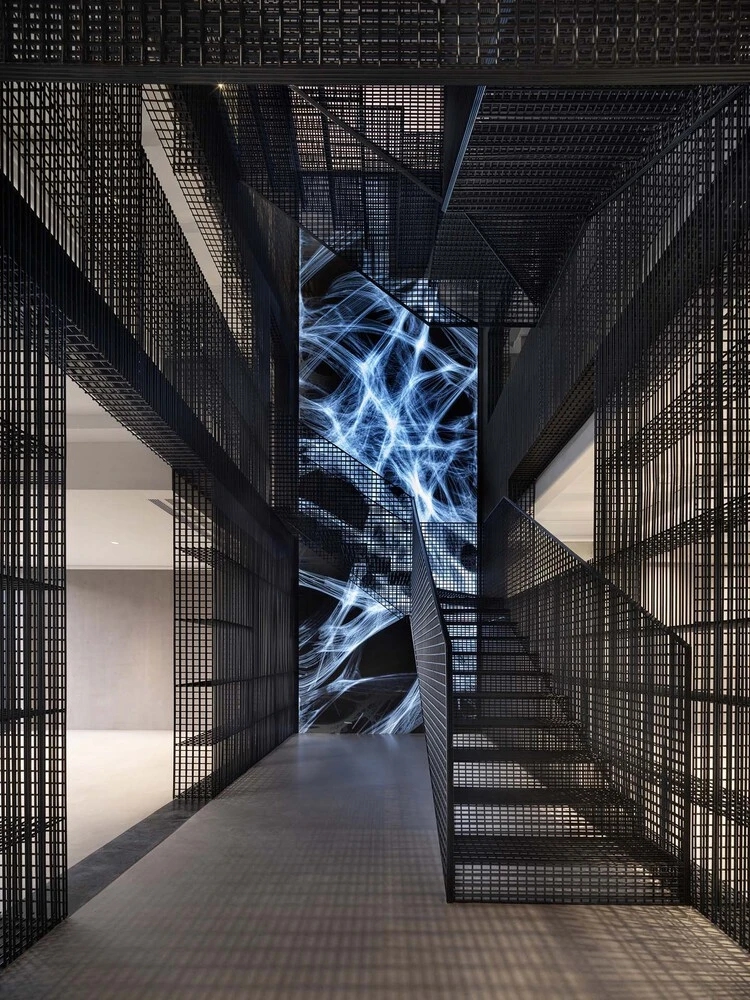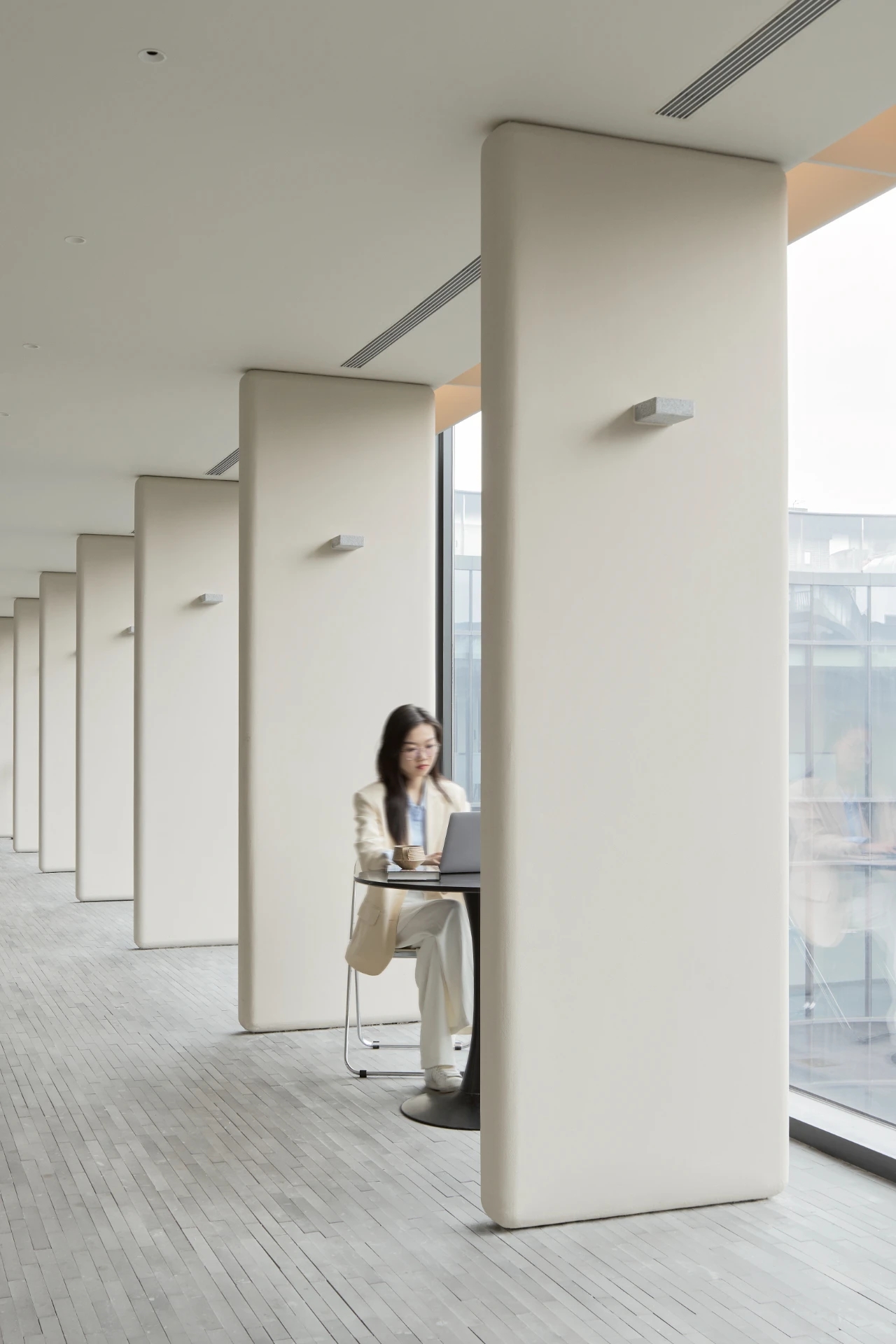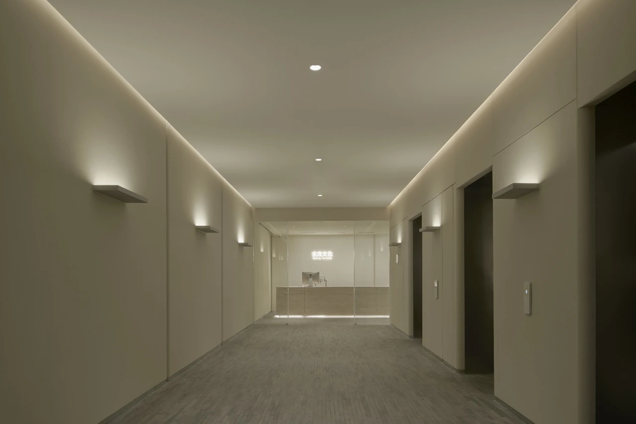 走出电梯厅,即可视作进入了城市的中央广场,对称的路灯引领着人跟着轴线进入到城市中心。墙面灵感来源于旗下的陶陶包,对称且圆润的外形,内折的缝线,暗藏五金件,最大程度消解了人为痕迹,而say将这些包包元素做成了广场中的城市肌理,裁片般的墙体在阴角处平等内收,阳角处圆润打磨,场地生成的逻辑无一不透露着品牌制包的理念。
