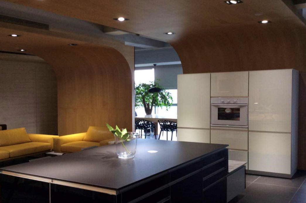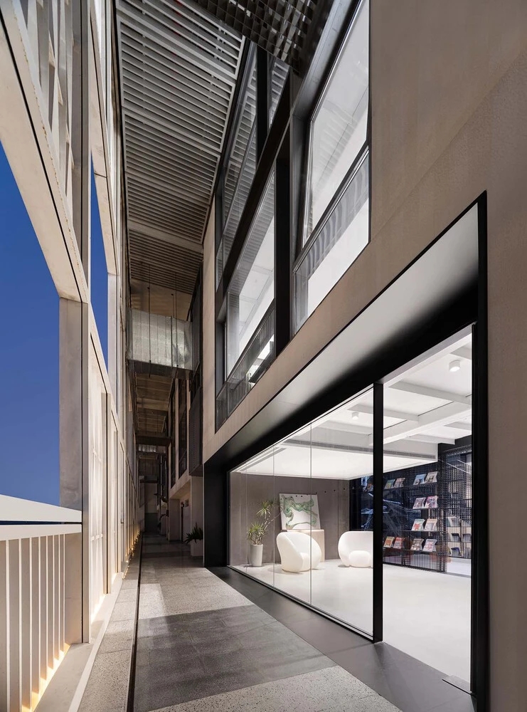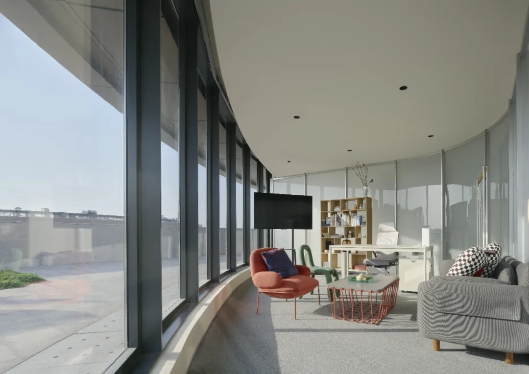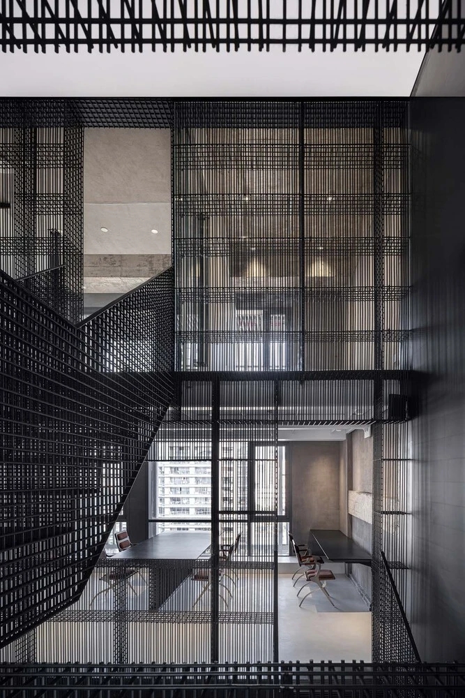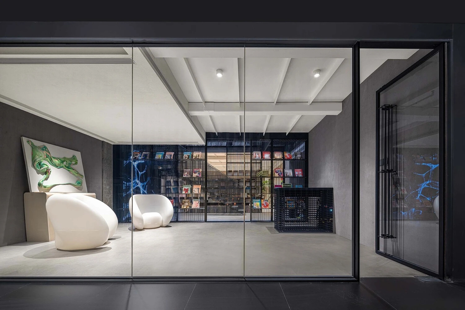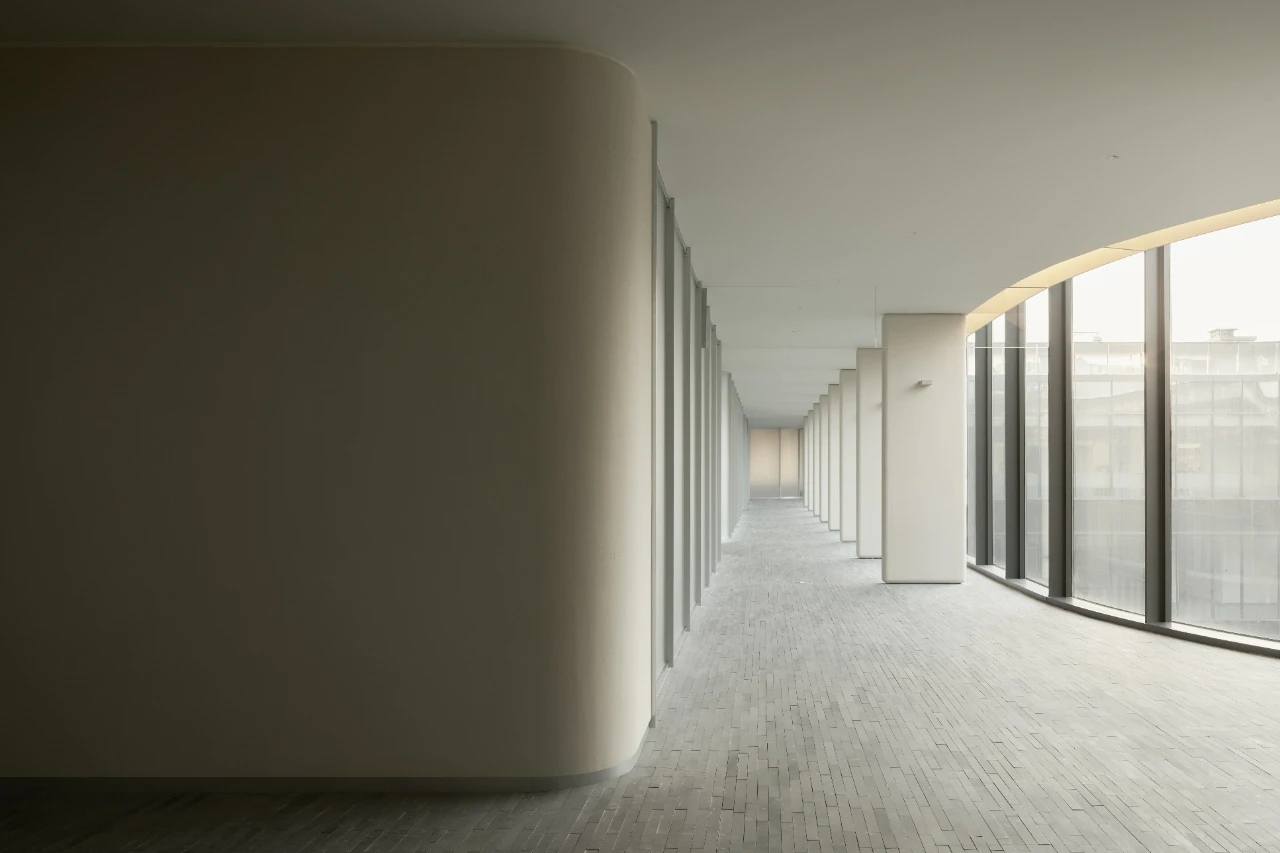 走出电梯厅,即可视作进入了城市的中央广场,对称的路灯引领着人跟着轴线进入到城市中心。墙面灵感来源于旗下的陶陶包,对称且圆润的外形,内折的缝线,暗藏五金件,最大程度消解了人为痕迹,而say将这些包包元素做成了广场中的城市肌理,裁片般的墙体在阴角处平等内收,阳角处圆润打磨,场地生成的逻辑无一不透露着品牌制包的理念。