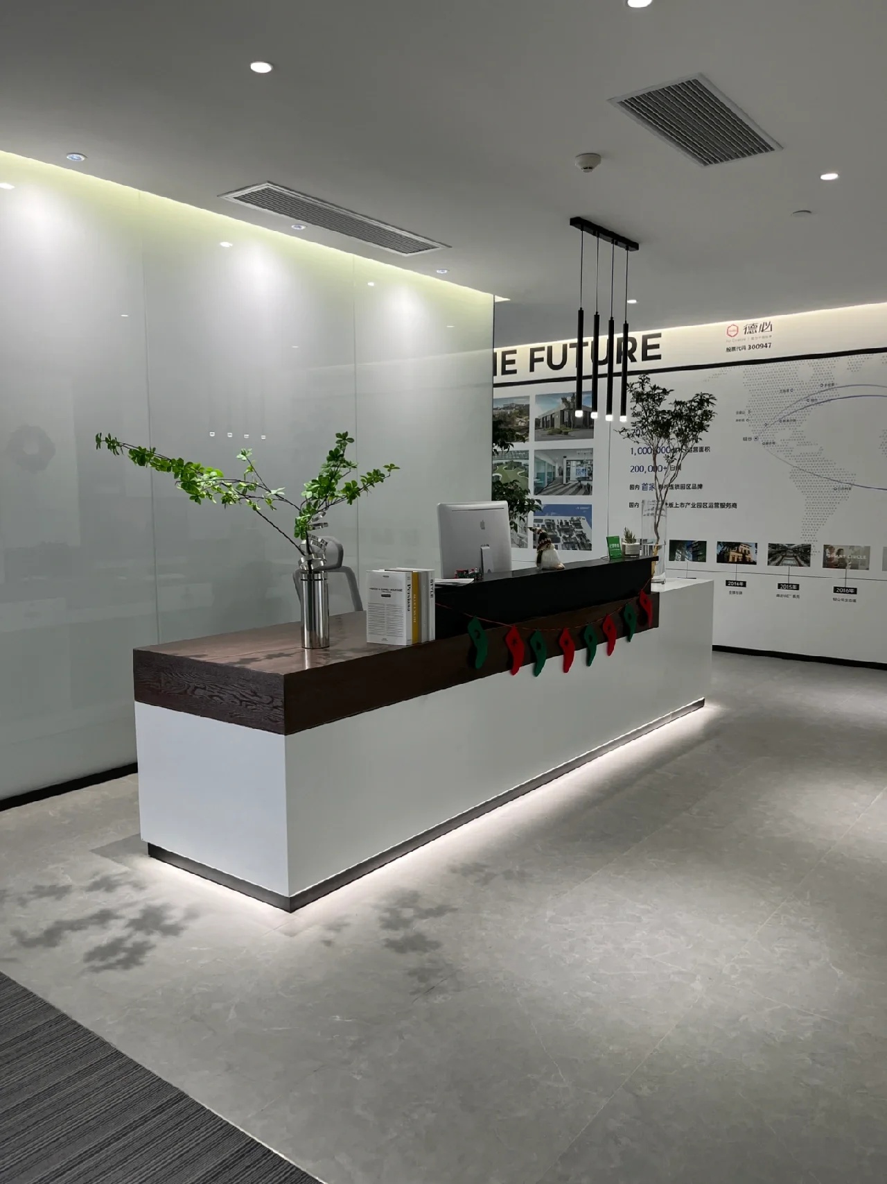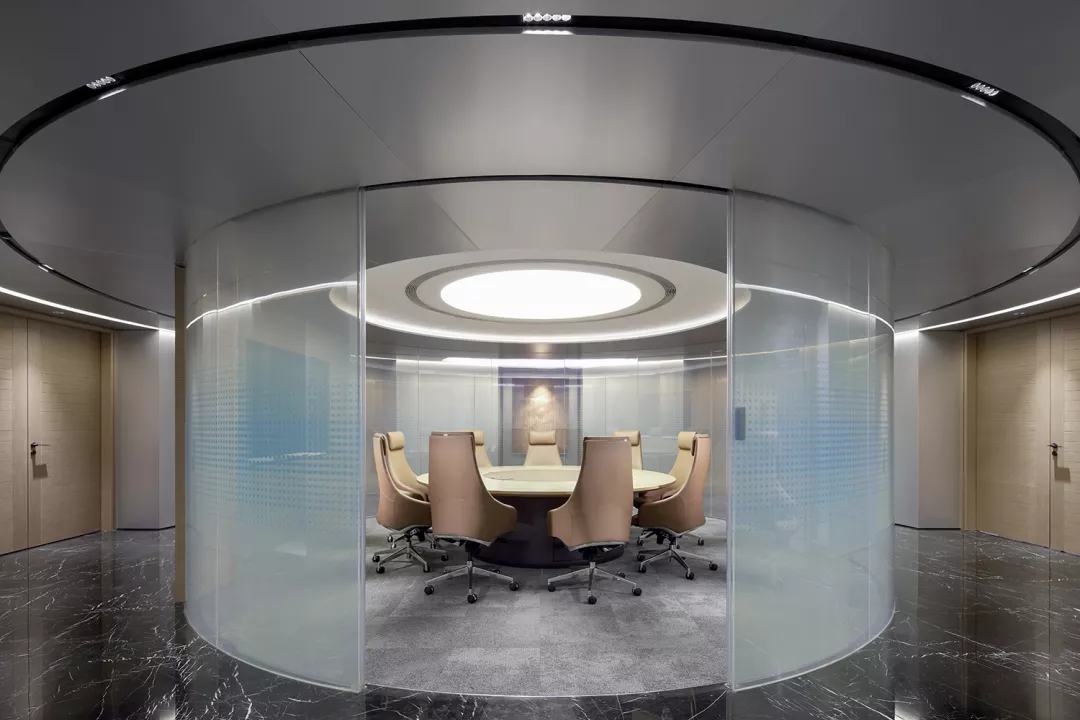 前台接待区作为进入办公室的第一空间,以修长的的线条和银色金属为主要设计元素打造轻盈的第一感。围合的前厅区域,空间形态呈弧形,形成向心聚拢之势。