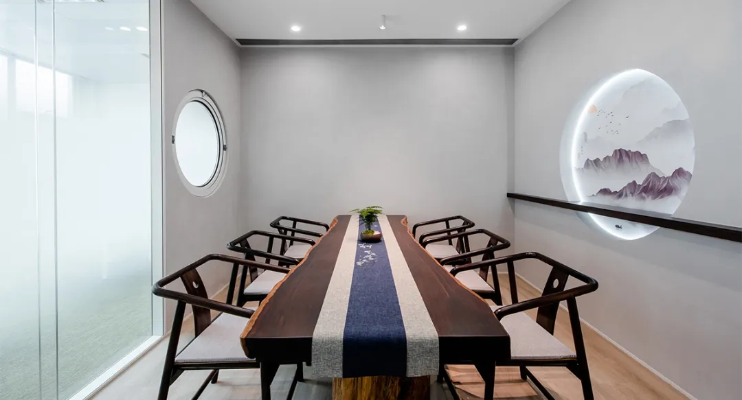 通过对于平面功能的梳理,设计师将会议、洽谈、茶歇等区域作为共享区,局部空间放大作为空间节点,放置艺术装置,把若干个相对独立的功能组团有效地连接起来,为空间增加节奏感。
