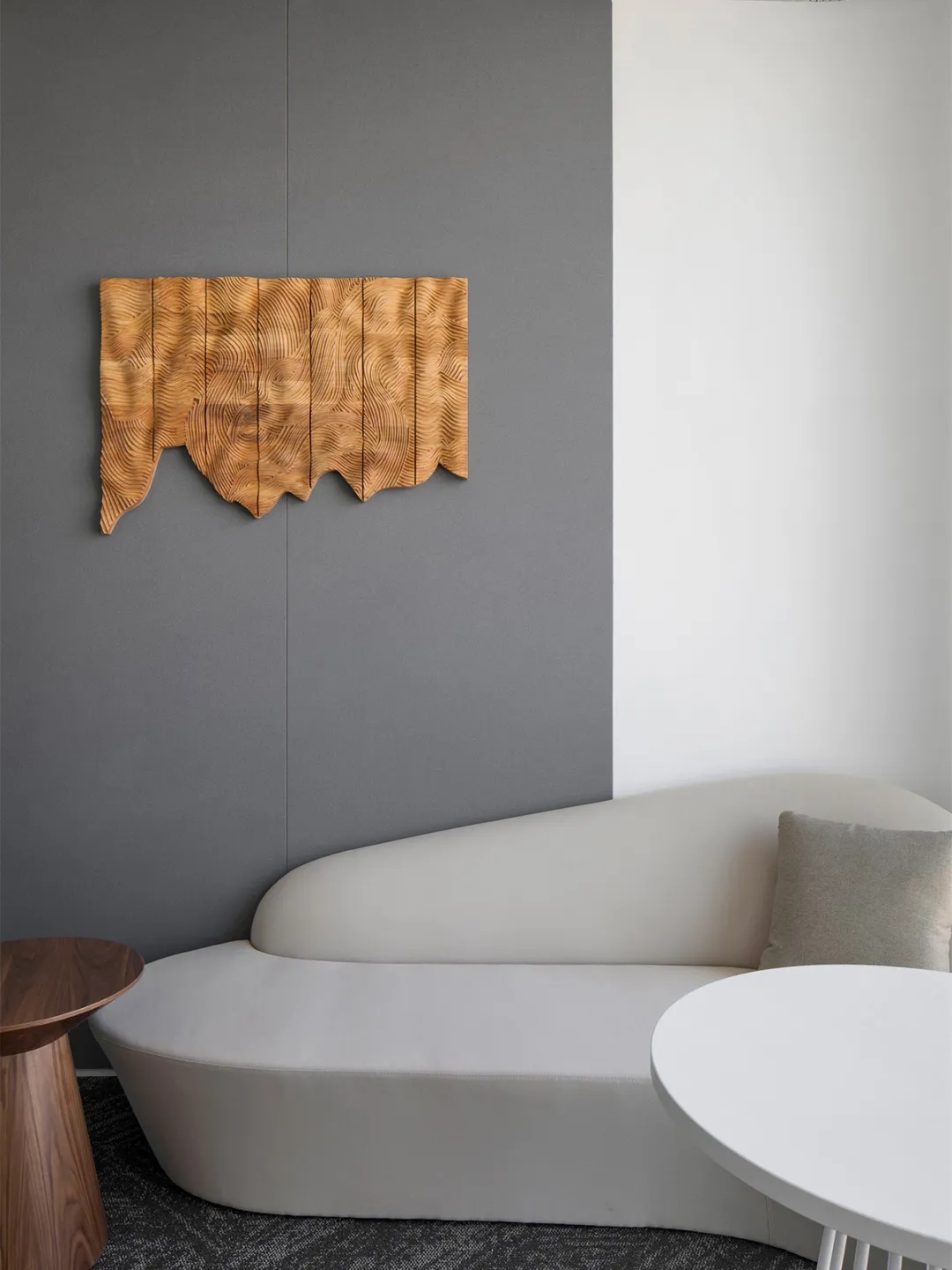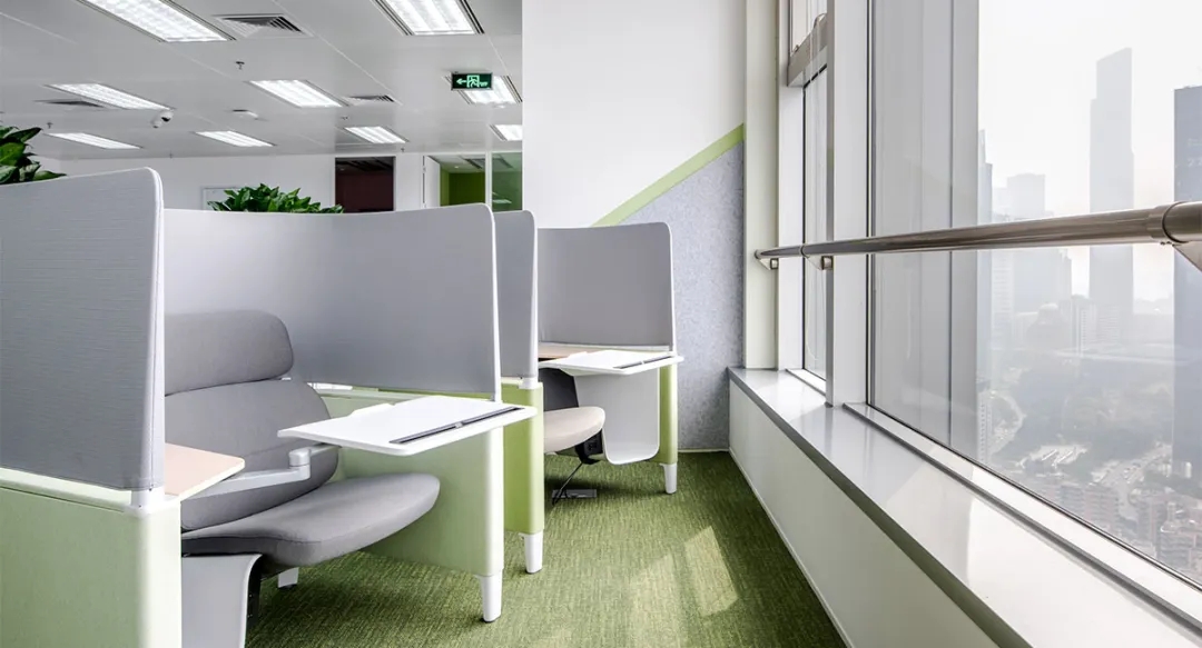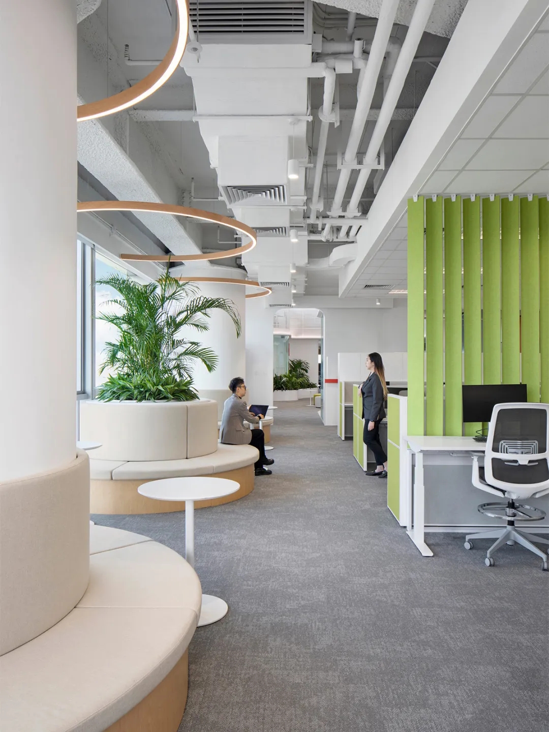 通电雾化的玻璃隔断,让空间形成一个个圆柱形的舱室,既保证了日常的通透,又保证了洽谈期间的隐私问题。隔而不断使通道有空间延伸感,给人们带来心灵尺度的延展。仅这一点灵动,亦让空间舒展,自由和充满了缓释感的浪漫,亦让空间得以舒展。