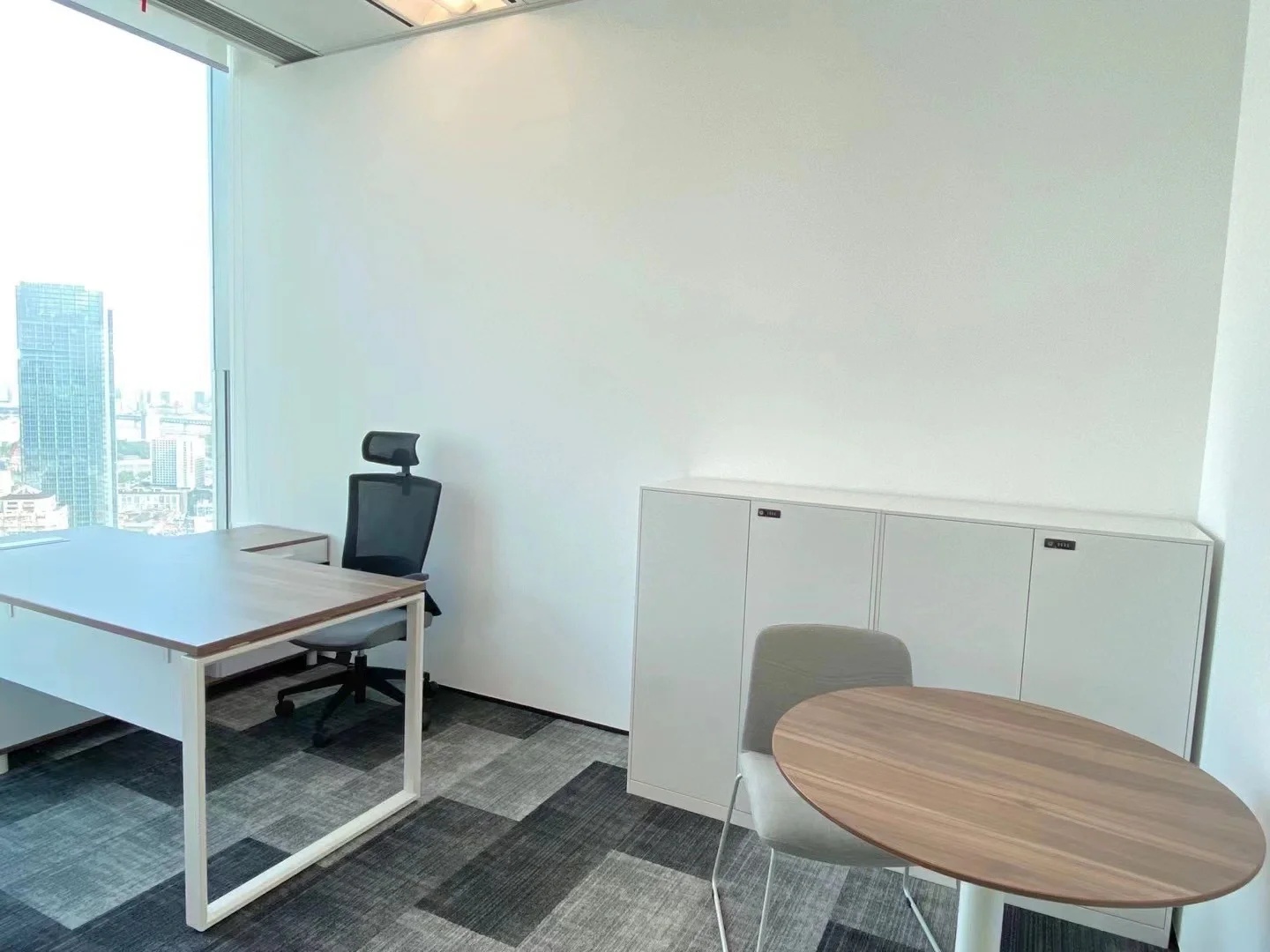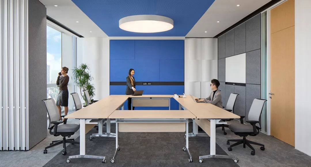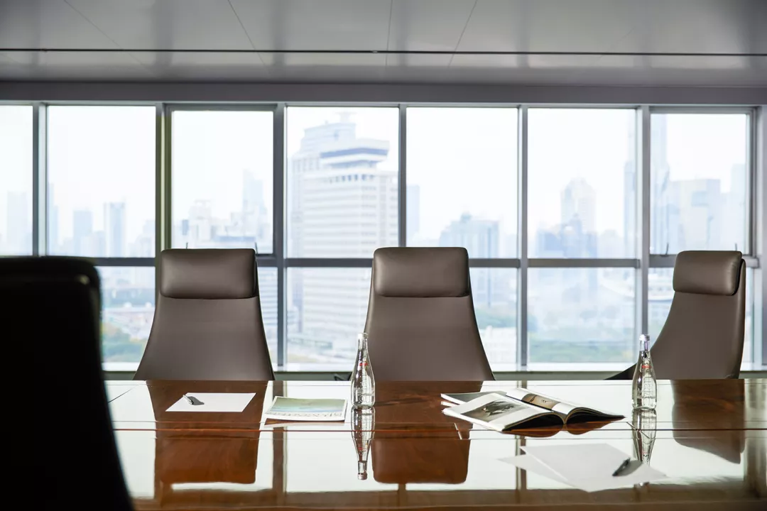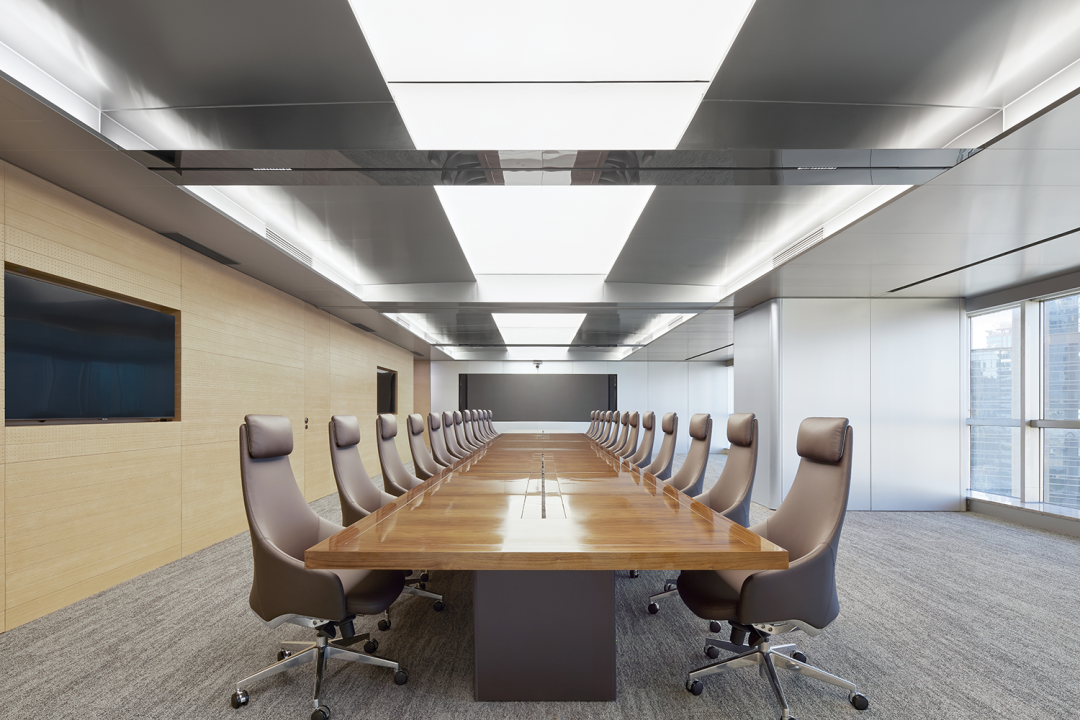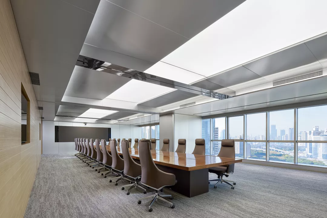 与处于中轴线的会议室的设计策略相反,大会议室被安排在能够俯瞰上海都市美景的地方。落地窗户与白炽灯光形成温和没有攻击性的日常语言,将光影、景色引入室内,视野得以向外延伸,营造轻松的氛围。