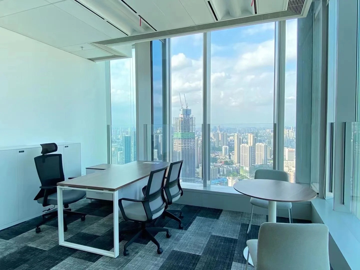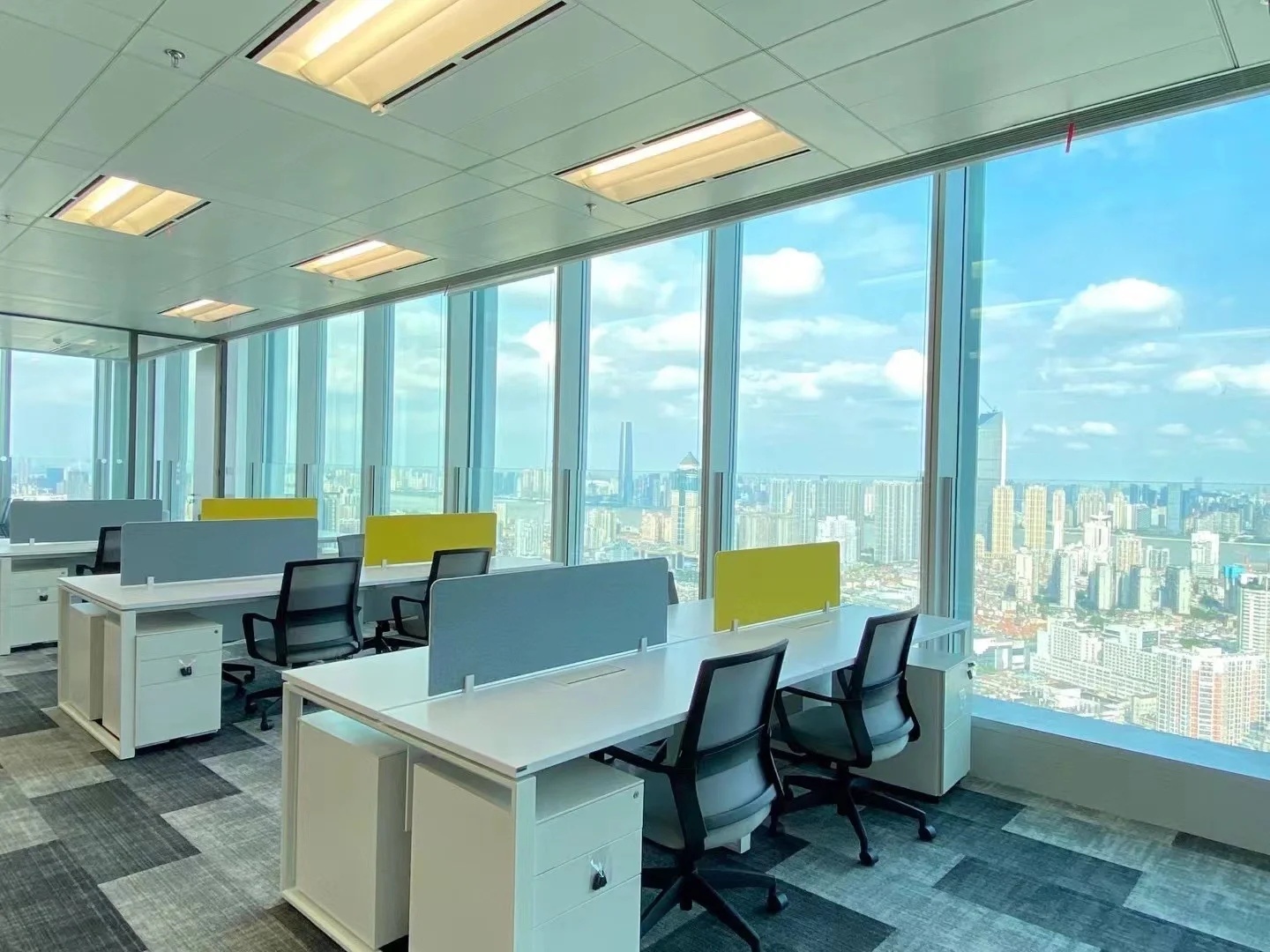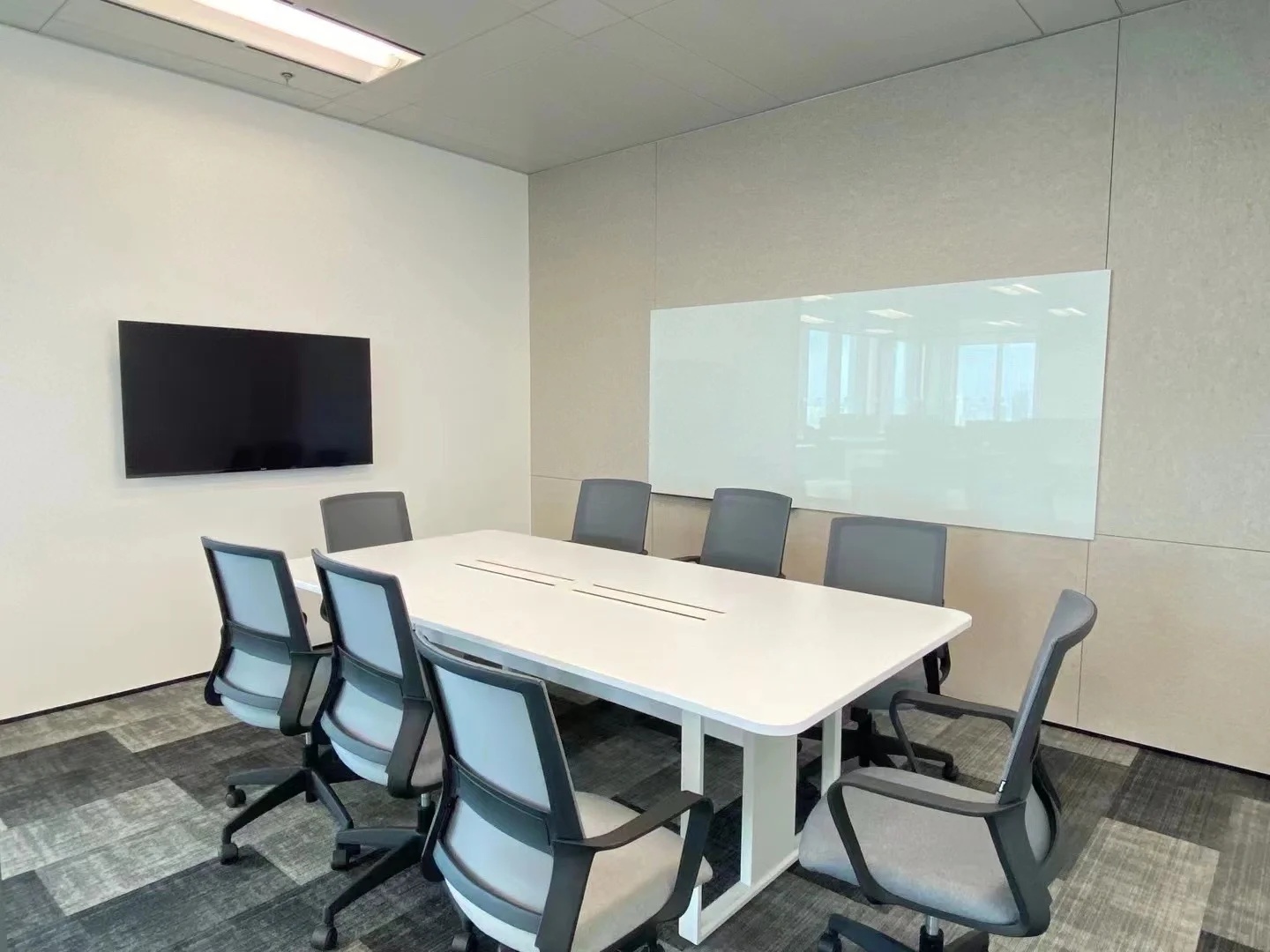 与处于中轴线的会议室的设计策略相反,大会议室被安排在能够俯瞰上海都市美景的地方。落地窗户与白炽灯光形成温和没有攻击性的日常语言,将光影、景色引入室内,视野得以向外延伸,营造轻松的氛围。
