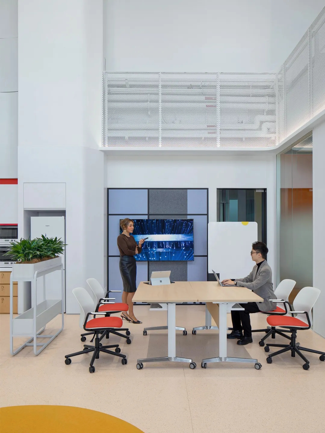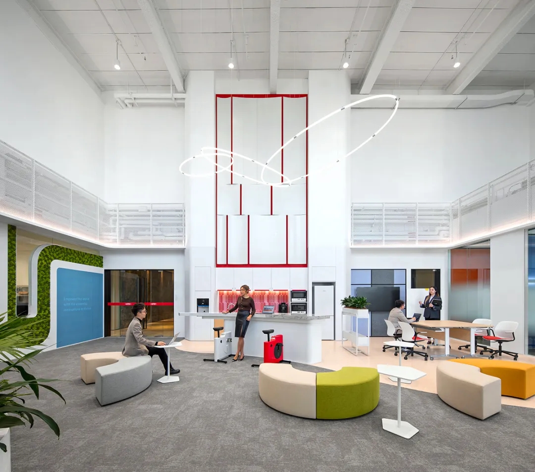 开放式的水吧,多样化的家具以及绿植的导入,将管理层与员工、部门与部门之间的距离拉近,鼓励彼此在舒适自然的氛围中研究与讨论,收获信息,激发灵感,亦可在工作之余放松休憩,享受会客厅般的从容惬意,突出员工关怀及企业文化特色。