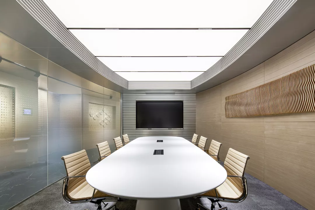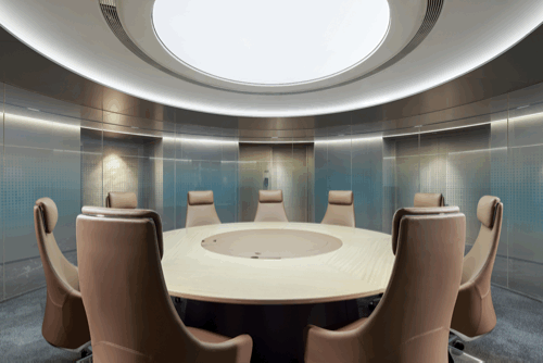 圆形会议室整体充满了未来感,解构元素,星环般的圆环照明置于顶面,以此聚能,呈现出神秘、科幻的空间印象。当电雾玻璃闭合时,有一种瞬间把人带入另一个次元的感觉。