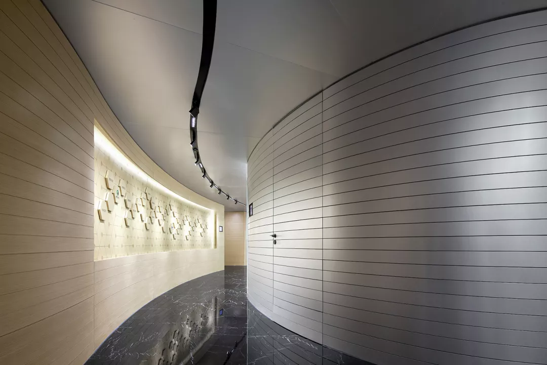 从前端的前台接待区域过渡到开放的会议区,是一条由连续弧形构成的展示长廊,纵深上的灯带效果加强了的空间拉力,人在其中仿佛被吸入一个通往未来的时空隧道。