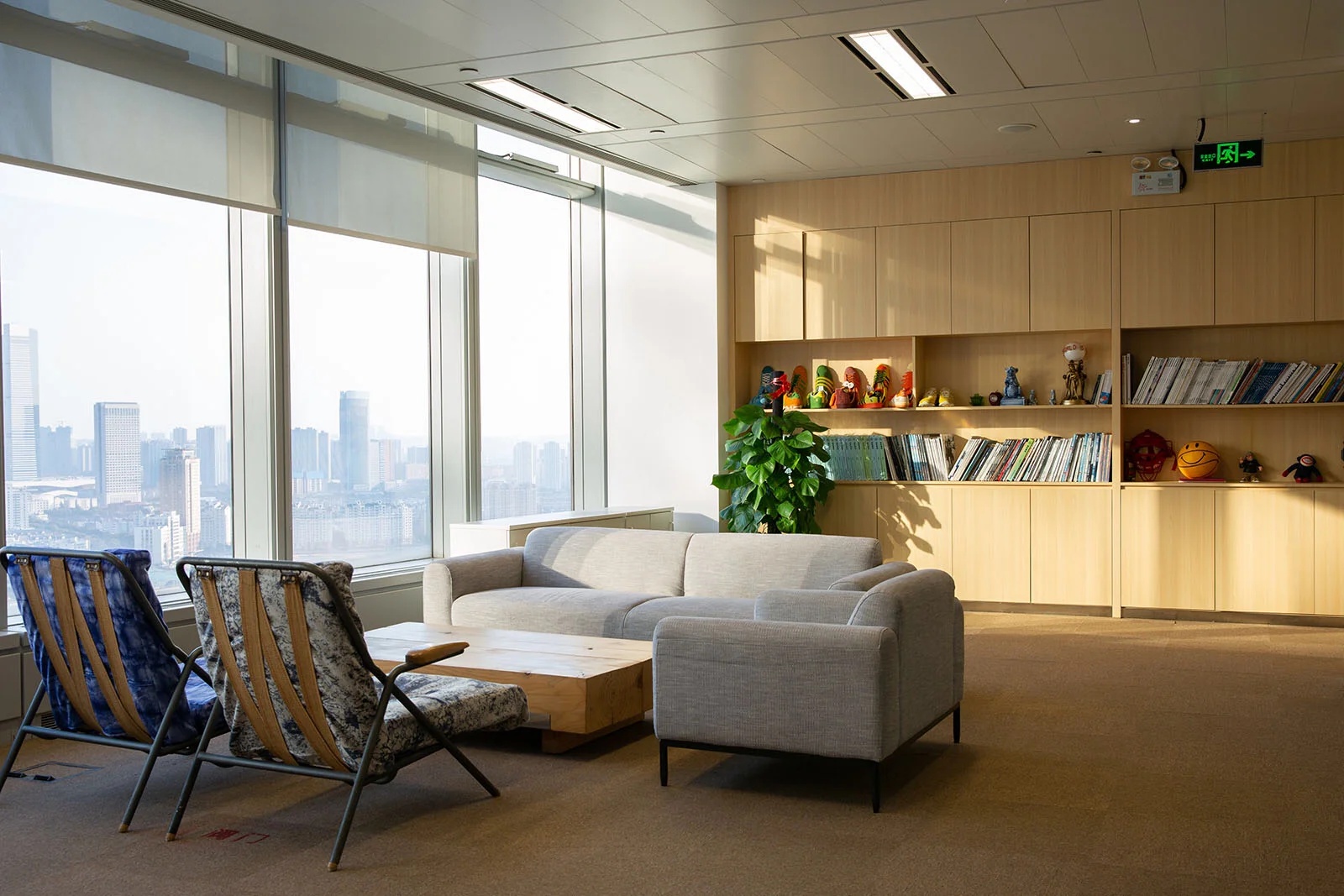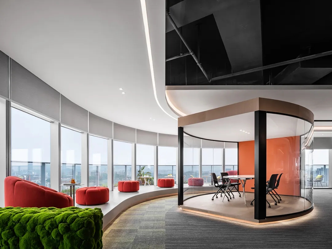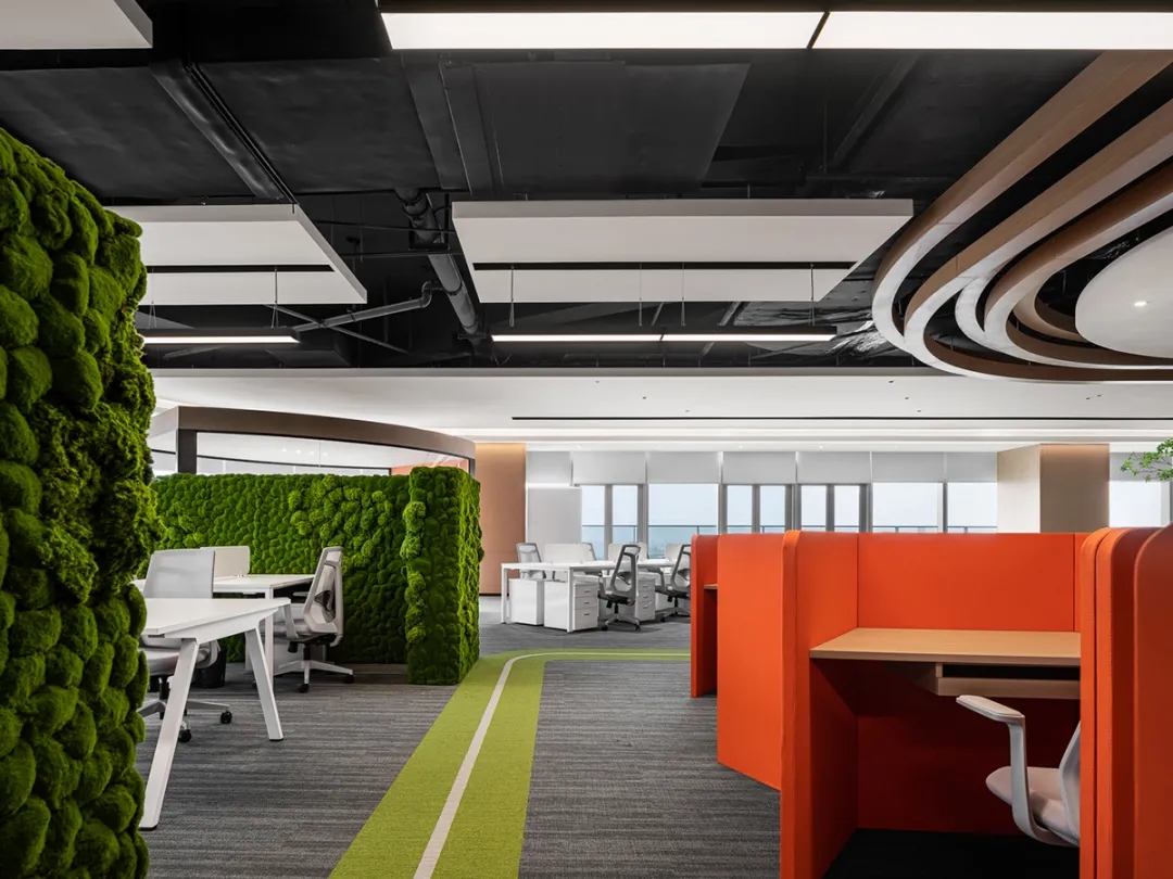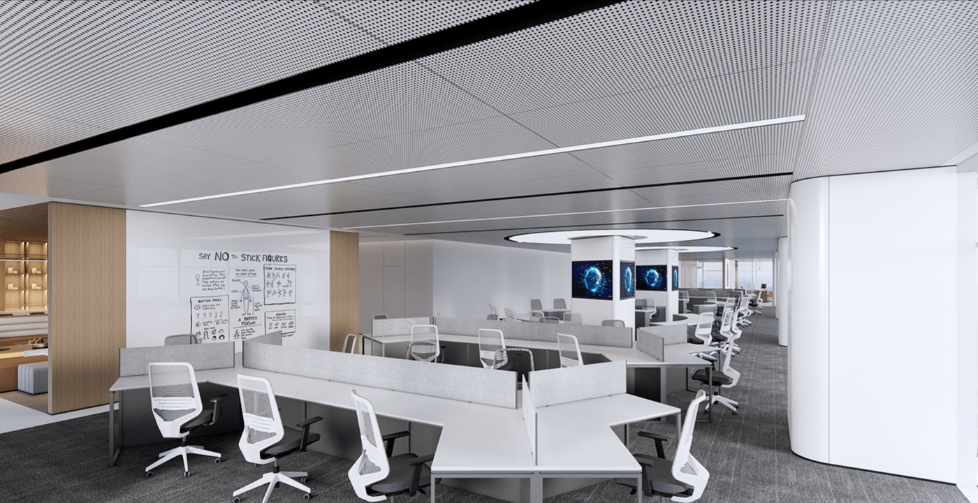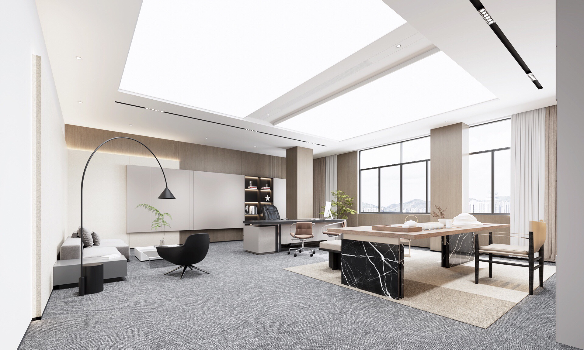 这个办公空间主要为服装材料研发部和设计部,甲方需要在短时间内完成改造,且造价成本不高。对于办公空间设计要求为年轻化、创新同时兼具创意感,空间需要划分出区陈列面料,会客区、会议室,同时大面积用于综合办公,便于团队研讨。