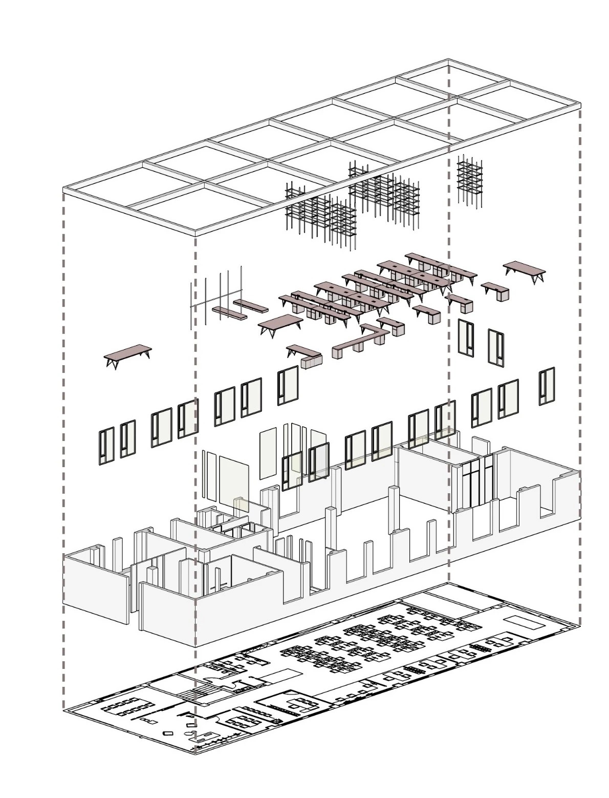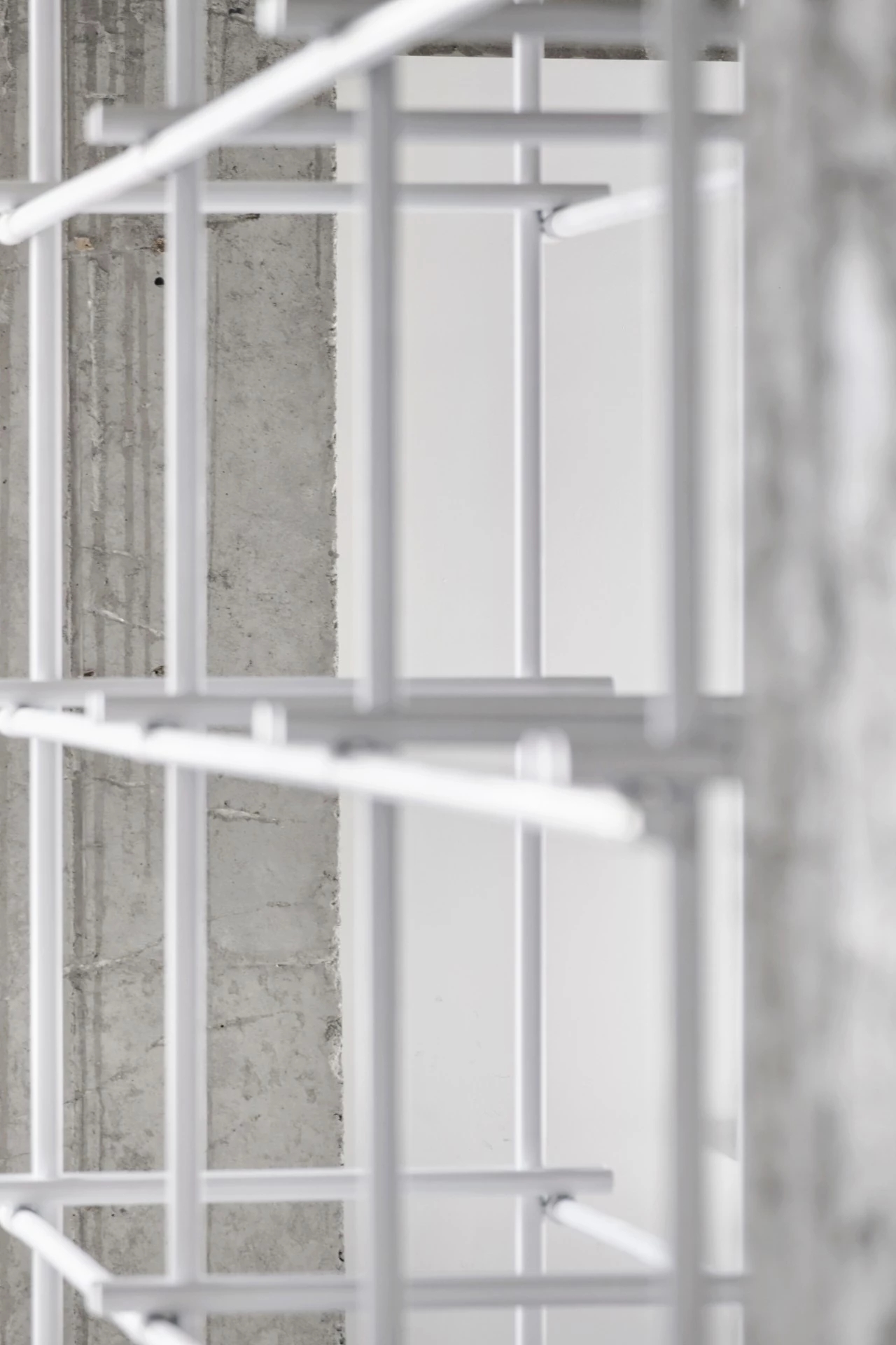 旧房改造工期较短,总工程历时不过30天,现场需全部拆除,且不影响其他楼层办公,二楼厂房消防设施及楼梯位置尴尬,在平面布局中作为重点考虑。地面采用工程地板,墙面保留原始水泥柱和局部墙体,白色钢架方便置物陈列,并且我们在每个工位上方也做了纵横交错的白色架子,作为隔断也方便把面料随手挂在上面,以避免乱堆乱放。这些设计在方便节约成本的同时又起到了装饰作用。