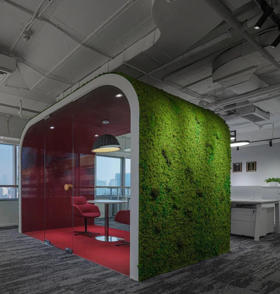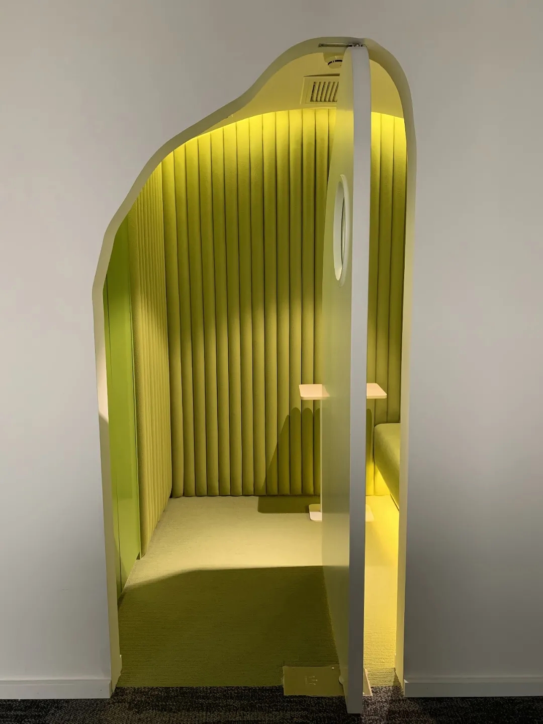山洞是一个神奇的存在,虽然只有不到4平米,却具备冥想、视频会议、更衣、午睡、以及母婴室等多种功能。人在小空间中体会到被包裹的感觉,传递到心理层面是平静与安宁。异形旋转门给开合制造小小的仪式感,带你进入一个绿色的山洞,一个可栖息亦可专注的小世界。