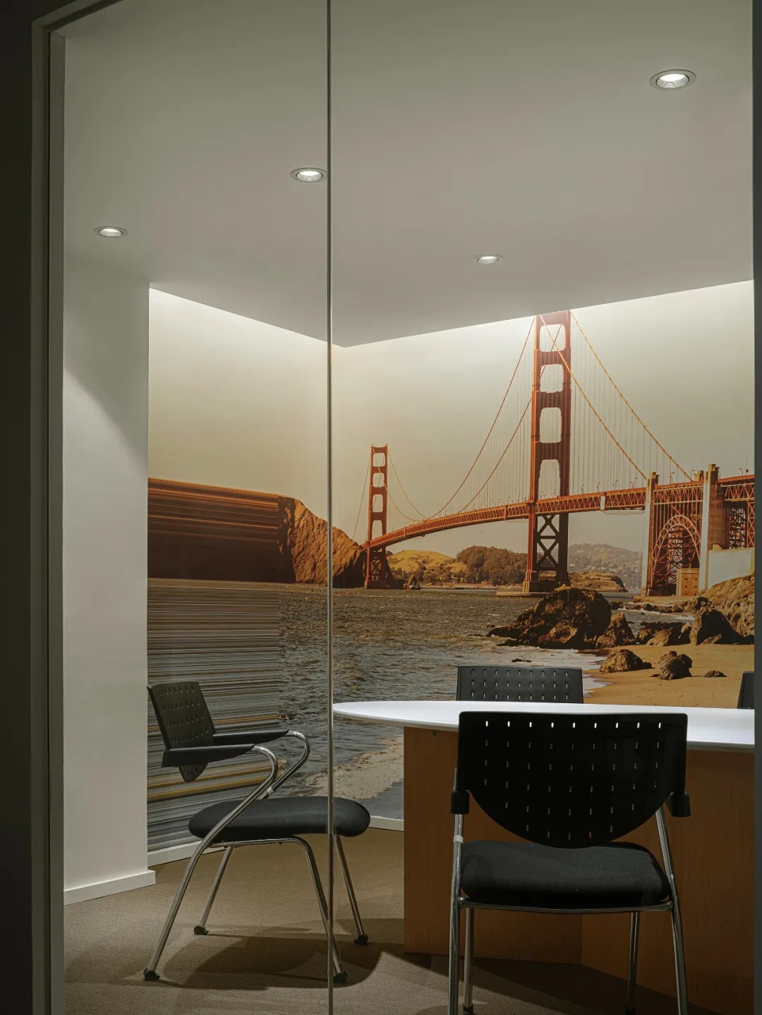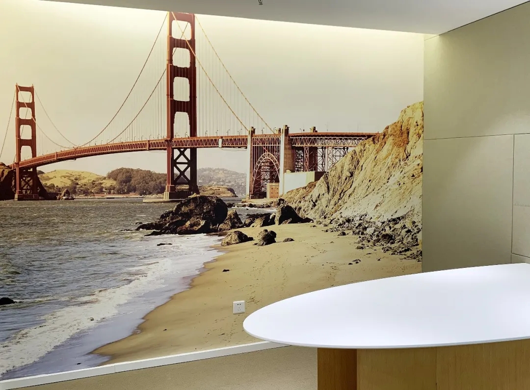 在这个办公空间里,海岸是唯一一间传统意义上的会议室。墙面经过艺术处理的金门大桥景观,不仅在心理上与旧金山总部建立联接,海岸线的延伸还在视觉上增强了空间感,使这间面积不大的会议室显得温暖而宽敞。