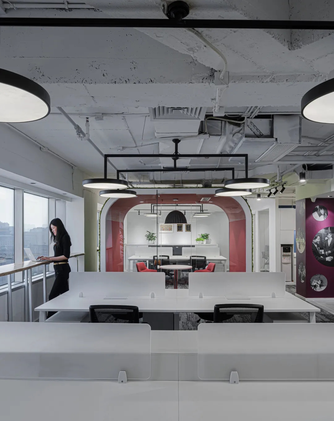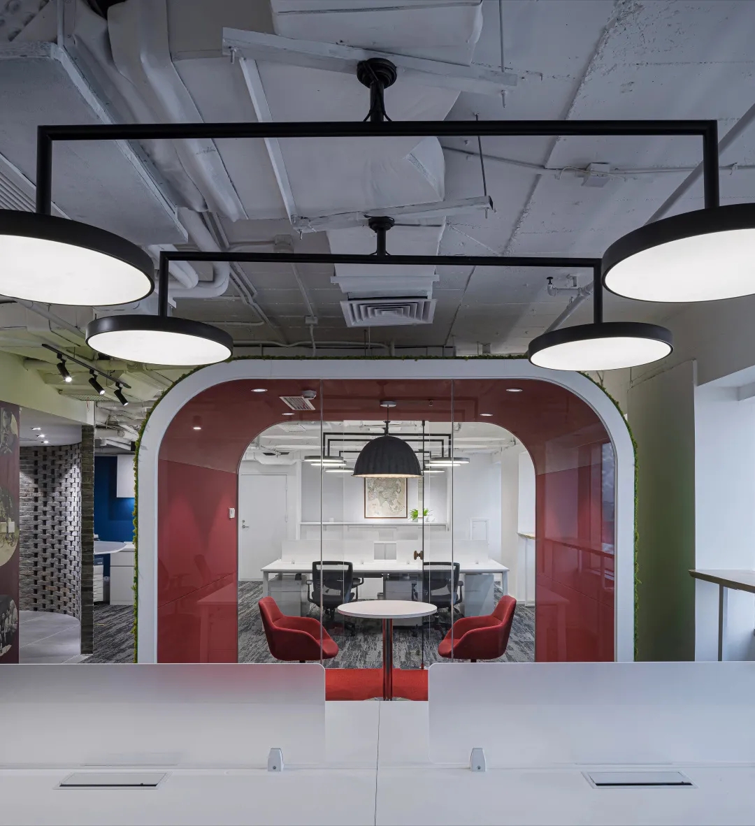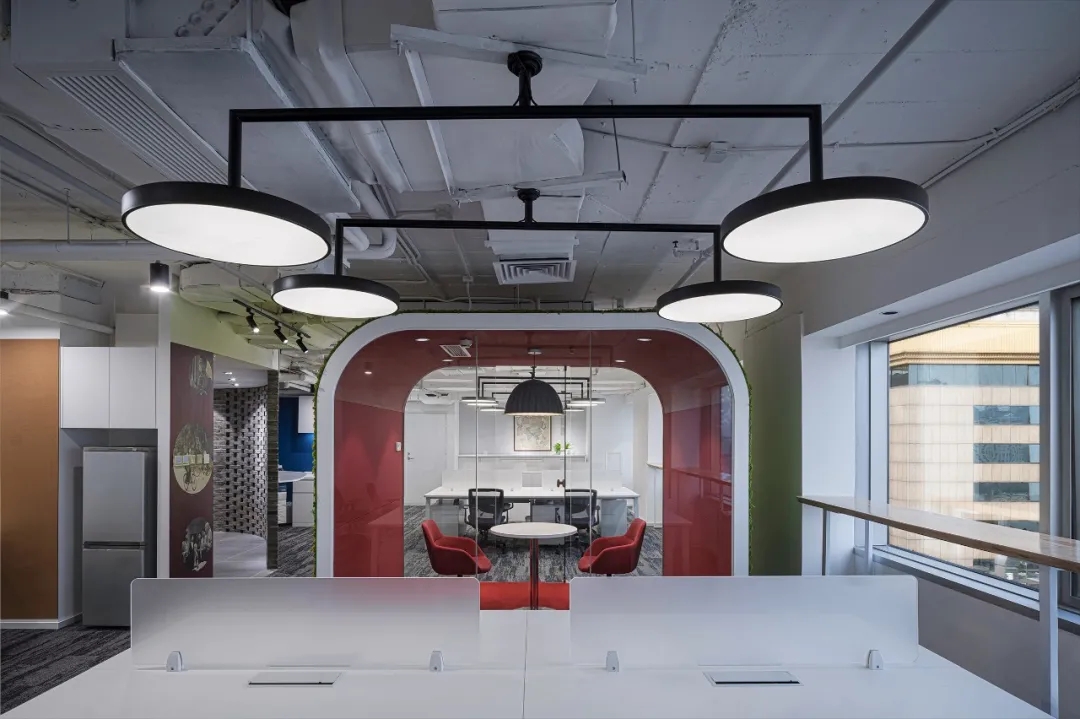 基于以上需求,未来办公空间应该具备灵活性、利于团队合作、促进身心健康以及加强身份归属四项特点。原有的独立办公室及方格子工位的布局明显不符合这一趋势。依据亚基会电话、视频会议频繁的工作特点,我们把空间按开放办公区+多种会议空间+多种工作方式的组合进行布局。