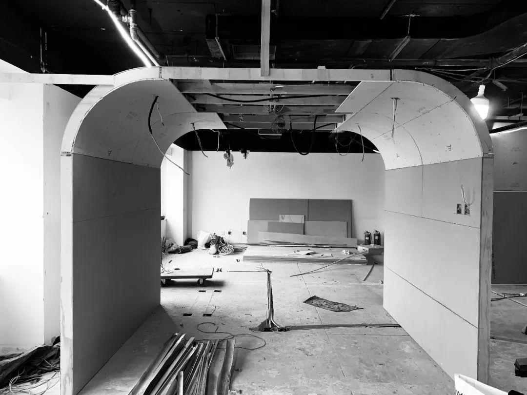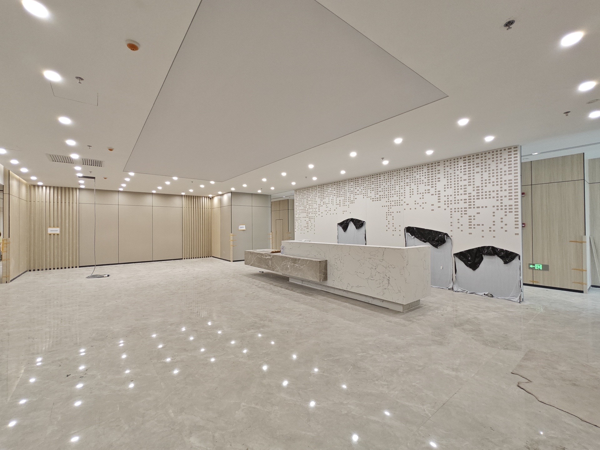 走廊与入口形成的角度使办公区一览无余,我们利用这个特点将一道弧形砖墙设置于此。充分展示公司标识的同时,保护了内部空间隐私。灰砖随着圆弧逐步散开,开合之间,墙便有了呼吸。