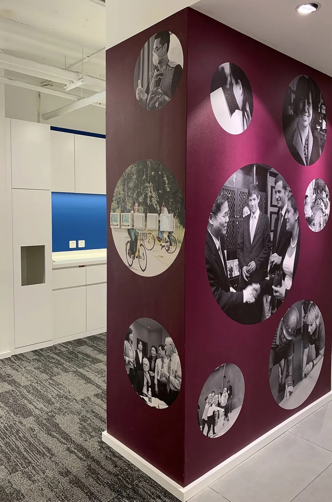 紫色背景墙上的黑白照片是亚基会在中国开展的重点项目留影,一个个定格串联起团队收获的喜悦和携手走过的历程。
