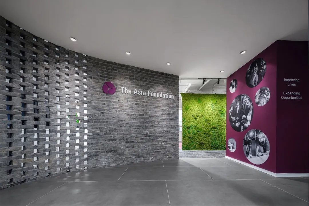 对于国际组织的办公室,体现当地文化是设计时需要着重考虑的要素。灰砖在这里既代表胡同、四合院,也指向园林、长城。我们并不想营造某种具像的场景,所以在对面用同样尺度的玻璃砖与它对话:实与虚,灰与白,阻隔与穿透,传统与现代。