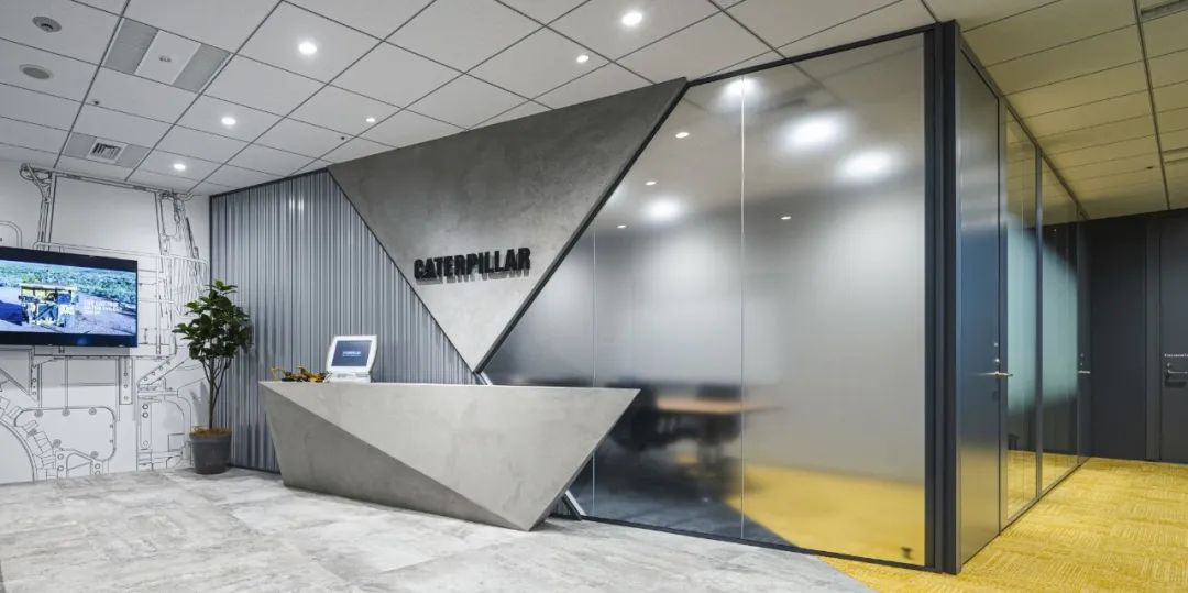 通过改变地板和家具的颜色将该区域分开,设计清晰,设有茶点空间、工作区和集中空间。 入口处的墙壁和建筑柜台使用砂浆,表达了处理重型机械的酷炫形象。