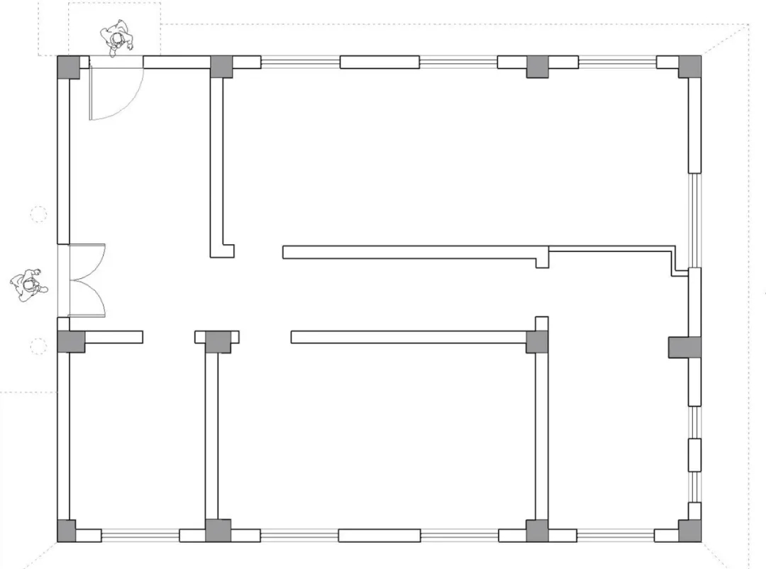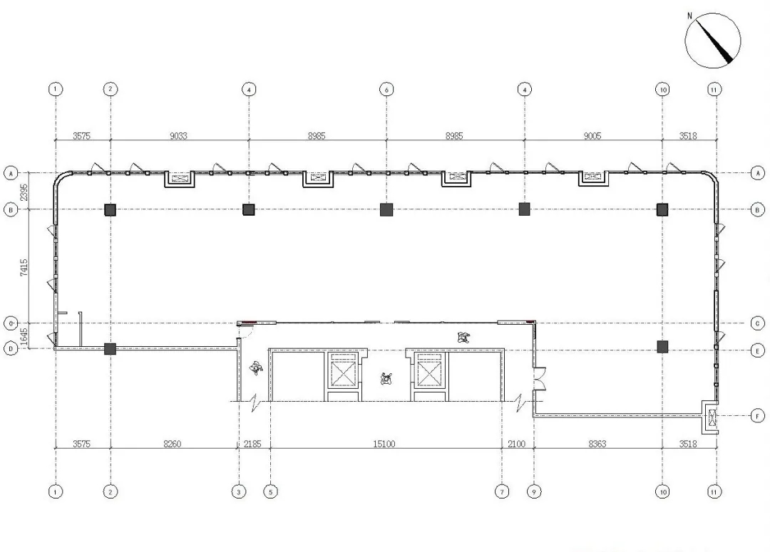 北向入口考虑到有水面及广场,更加符合咖啡、茶饮等业态。同时在确认了室外的污水井位置后,室内的独立卫生间也被确定,兼顾了便利性及后期的维护。