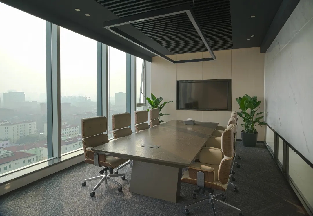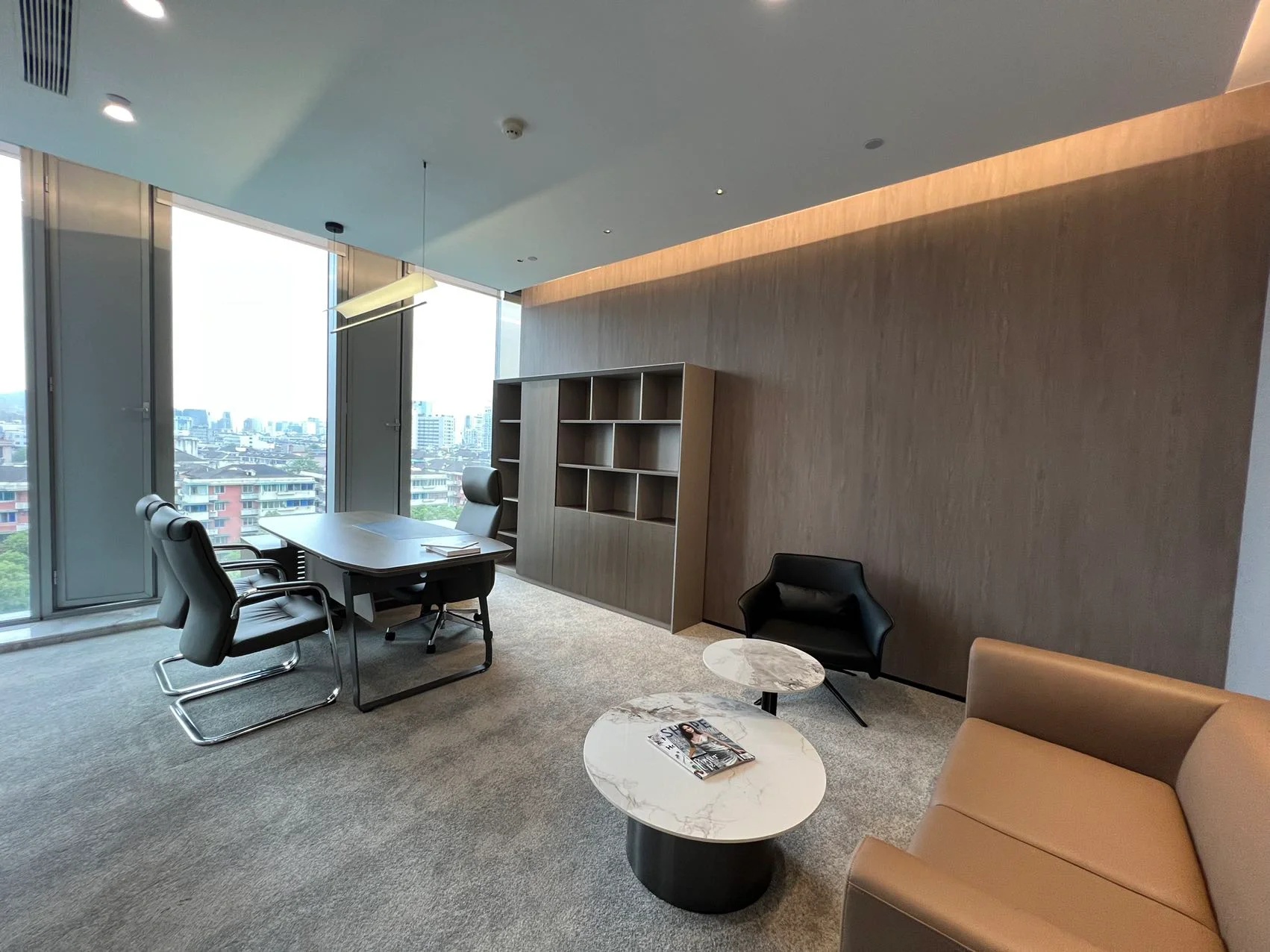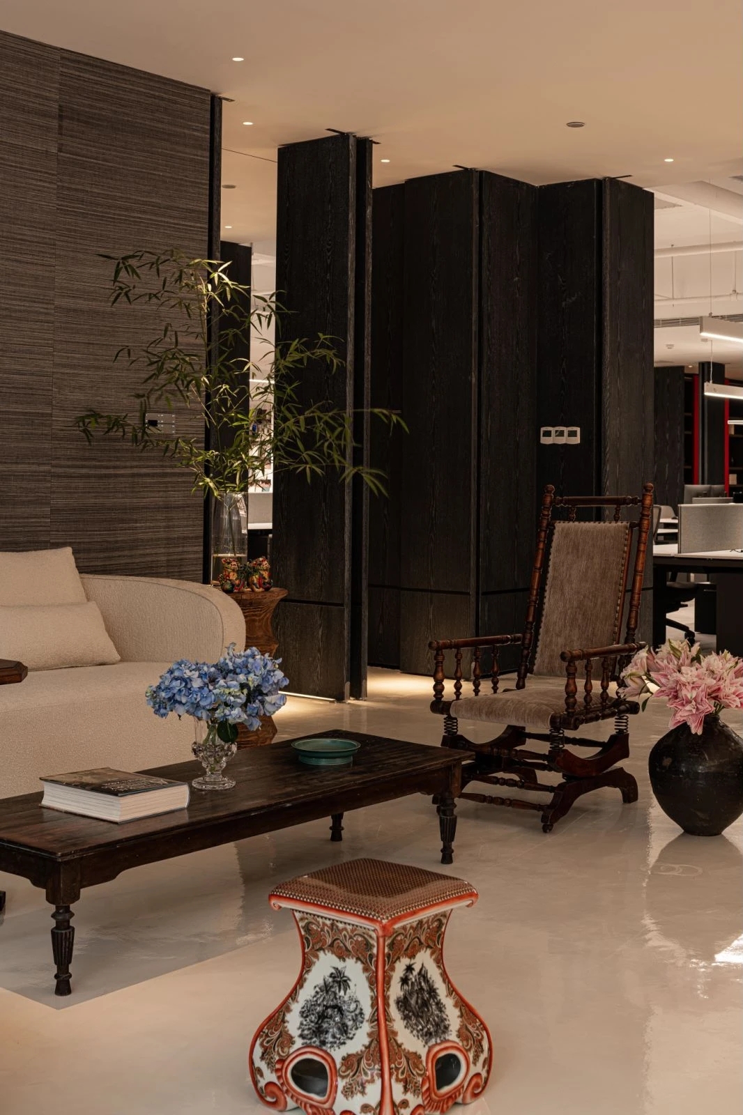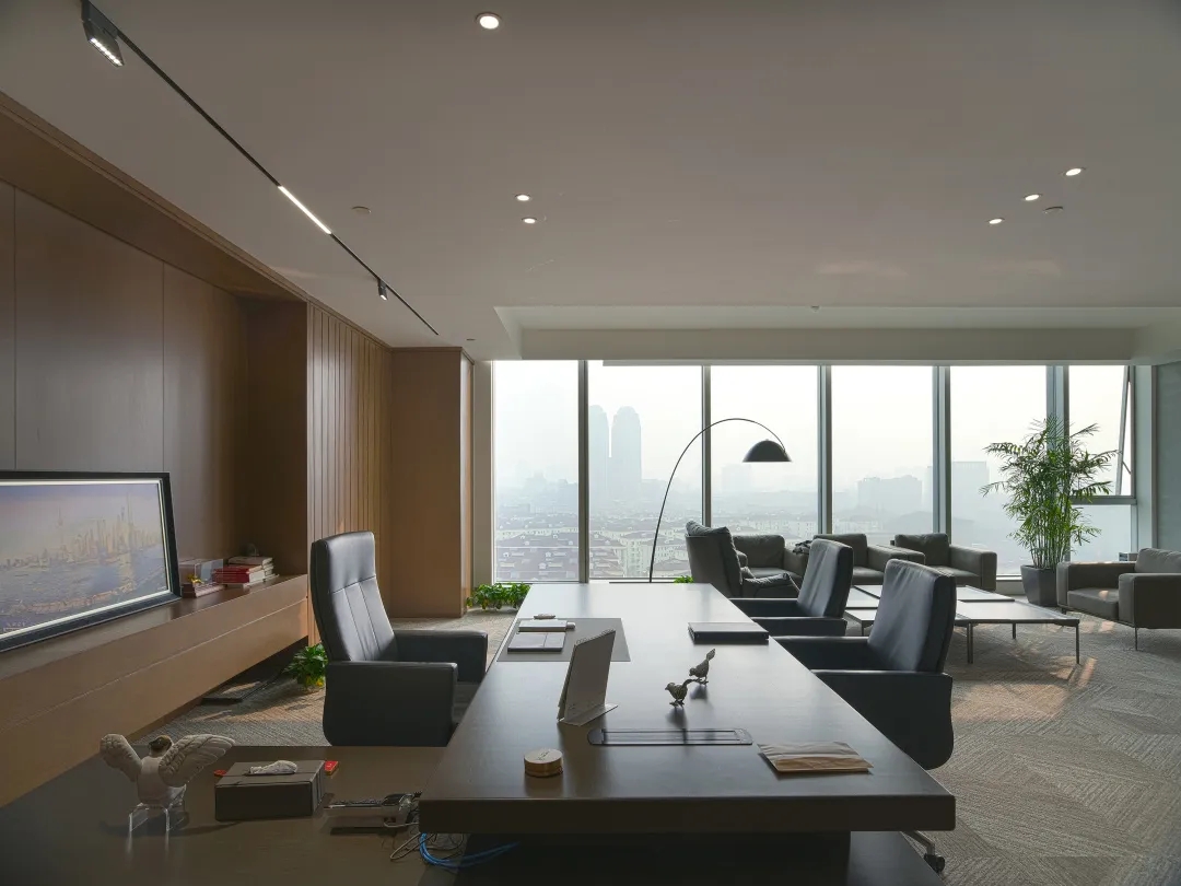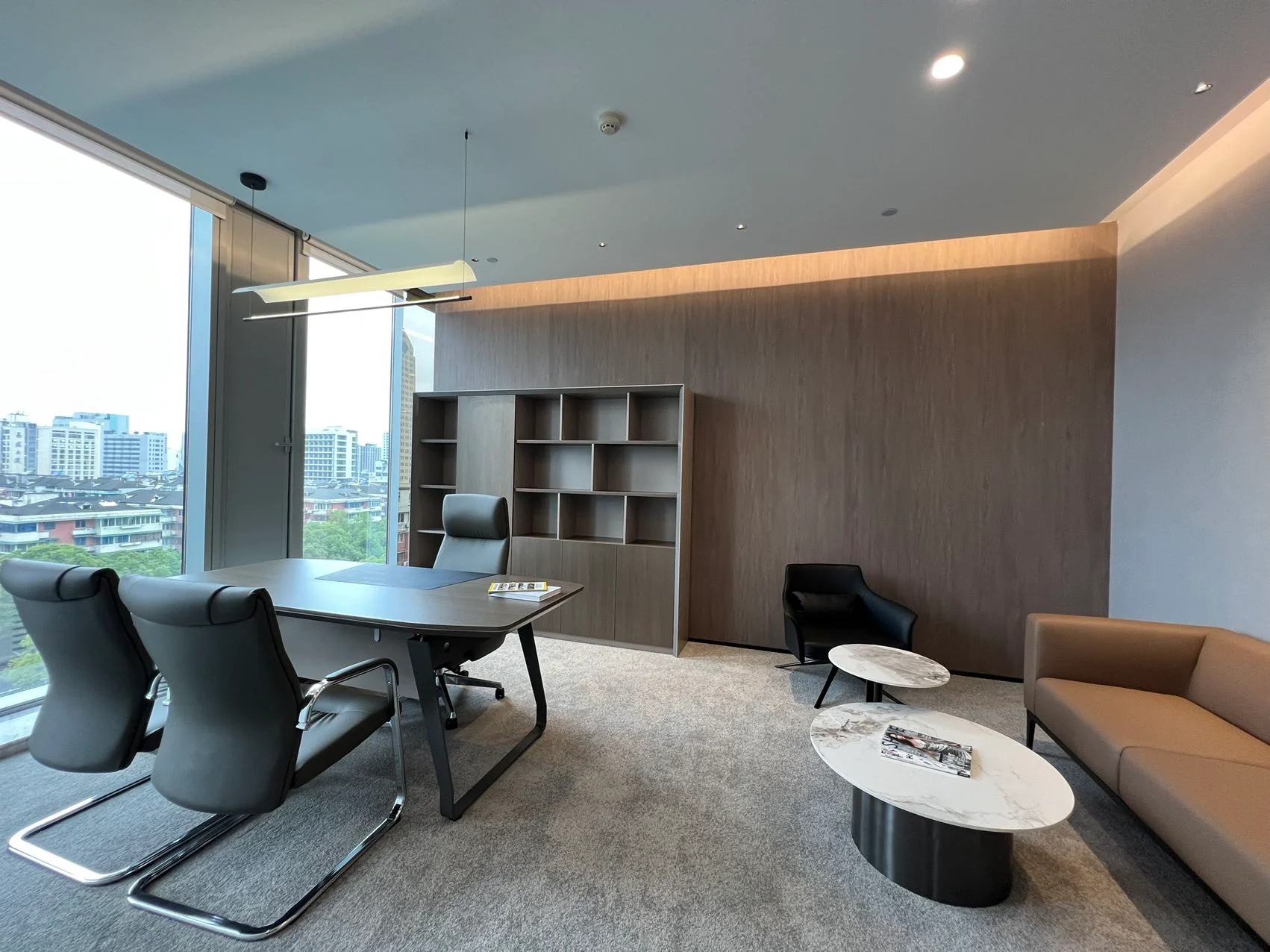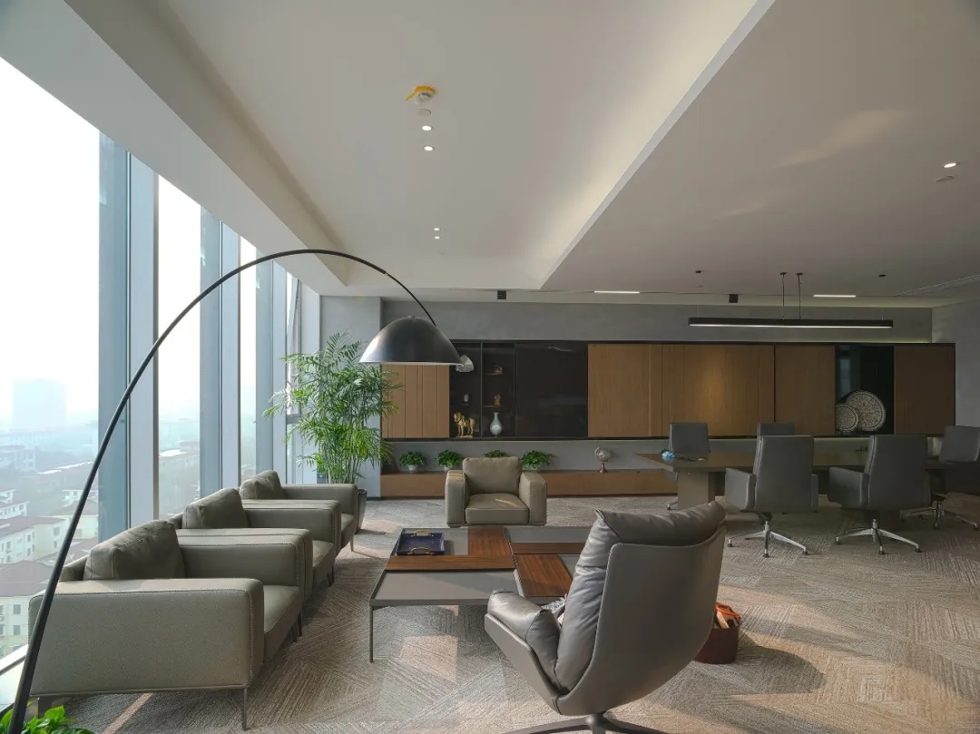 管理者需要更私密的空间以获得更深刻的思考。依照其个人喜好,设计师从莫兰迪画中提炼出一种隐晦的苦灰色调作为主色。将色彩从情绪中抽离出来,就连木质背景墙的色泽也消融其中,一种介于疏离和孤独之间的平和。材料有自己的形式语言,不同材质在空间中兼容并呈现出一种品质。