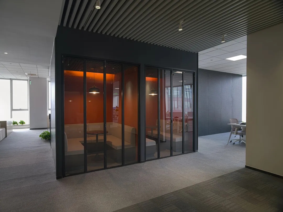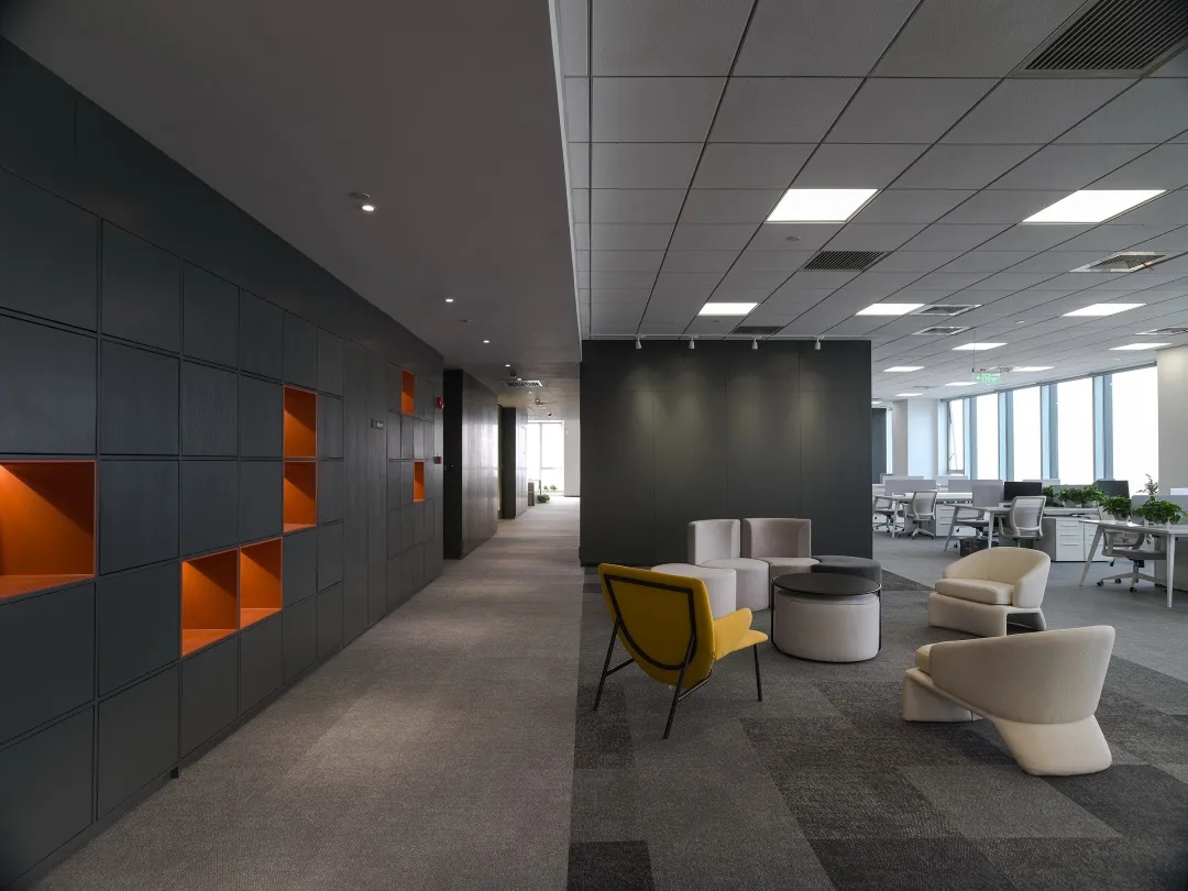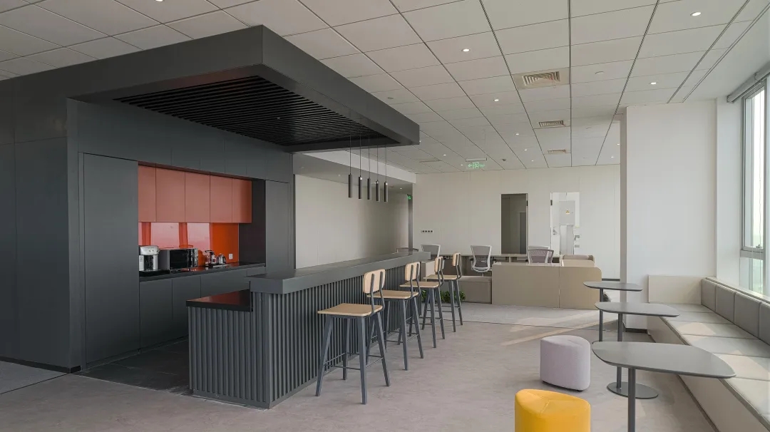 员工办公区坐北朝南,享有整个空间最为充足的阳光,有利于提升办公的舒适度和工作效率。在完全开放的空间中,设计师在其中置入了两个较为私密的“黑匣子”作为功能性的分割,咖啡吧、休闲区、打印区都沿着这一流线布置,能最大程度上方便员工办公和休闲的需求。公司VI色调中的橙色作为极少量的暖色点缀其中,打破了原有的充满秩序的色彩平衡,似乎是一种试探性的召唤,邀请人们加入友好而轻松的交谈氛围,获得片刻的休息和灵感乍现。