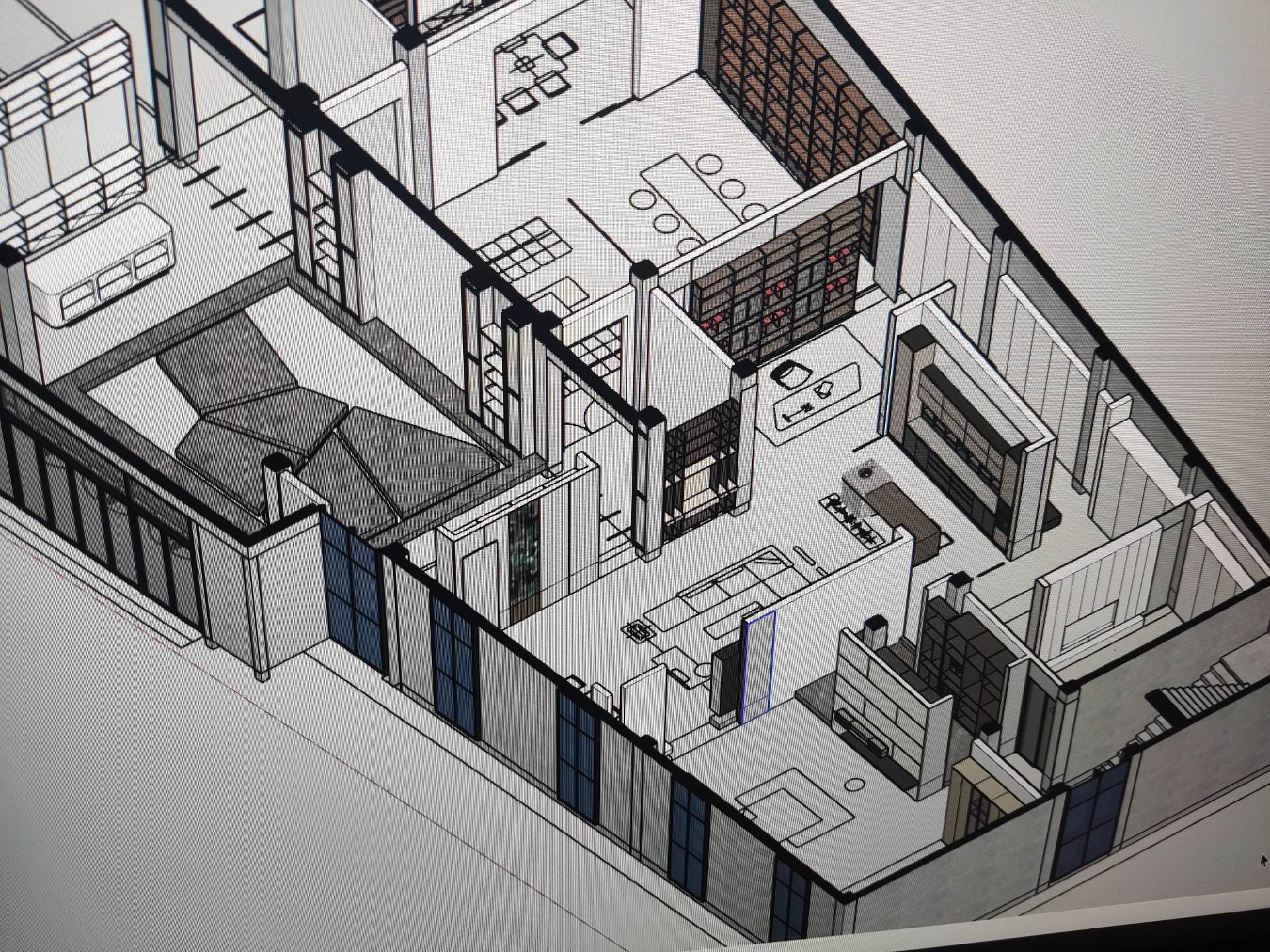 整个空间被划分为两大区块:一个是双层挑高的设计师工作区,一个是位于夹层的舒适的建筑师工作区,这里还有一道长长的背景墙用以展示目前正在进行的项目的草图与图片。除去这两大开放空间,一楼还有接待区、一间会议室、咖啡茶歇、;二楼设有一间办公室、一处休闲区、一处开放的员工休闲会议空间。当然在一楼的开放空间还设有两三人的洽谈小圆桌;在入口处为客户精心准备的衣橱、在会议室还有暗藏的员工衣橱。