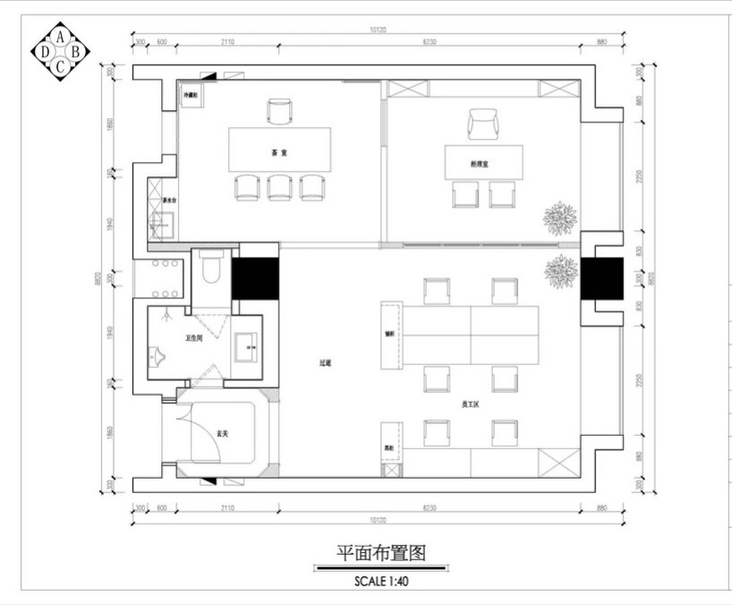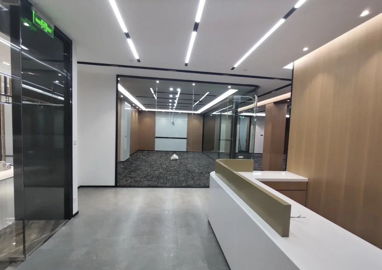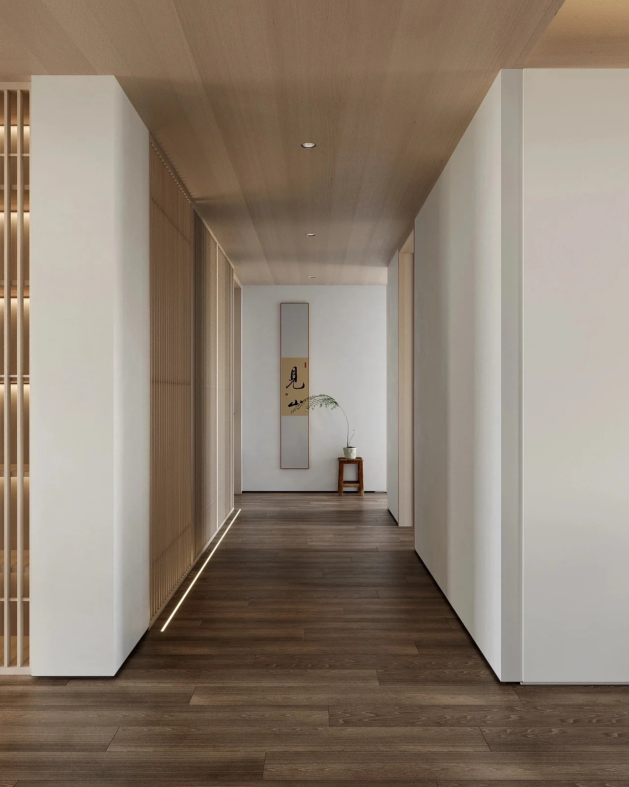 员工区用两侧对称的吧台与公共走廊分割开来,划分干净利落,但不会减弱空间的开阔感。走廊远端再饰以一副与茶歇区背景风格一致的山水画。