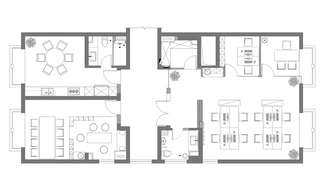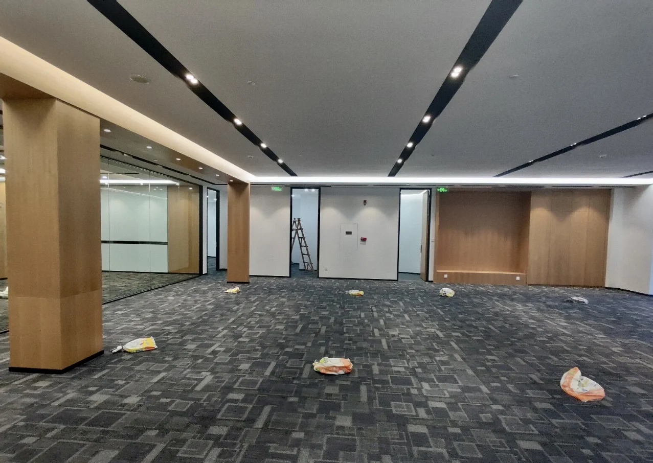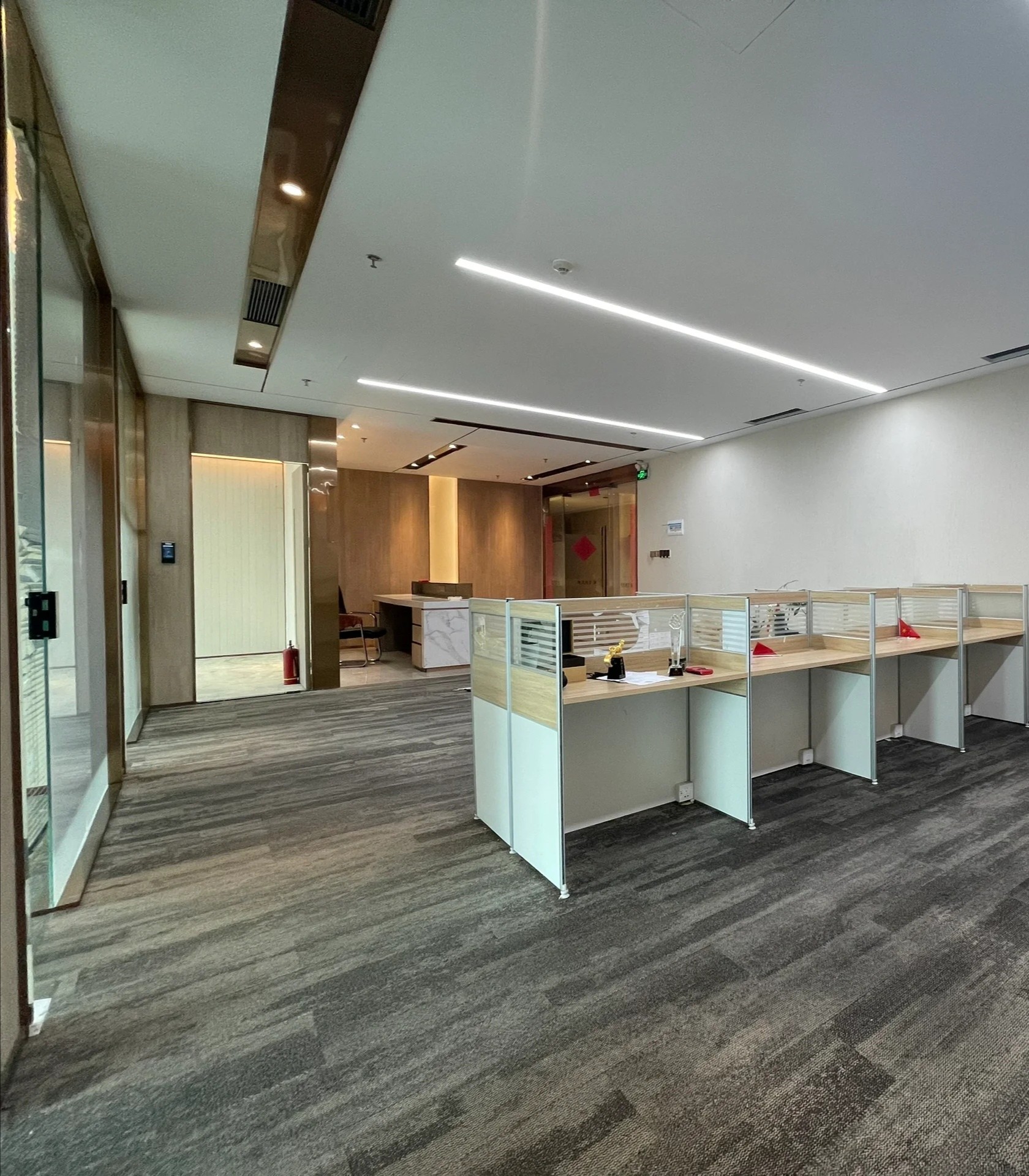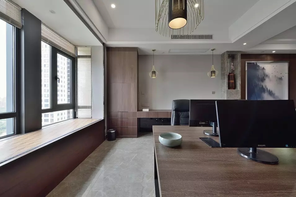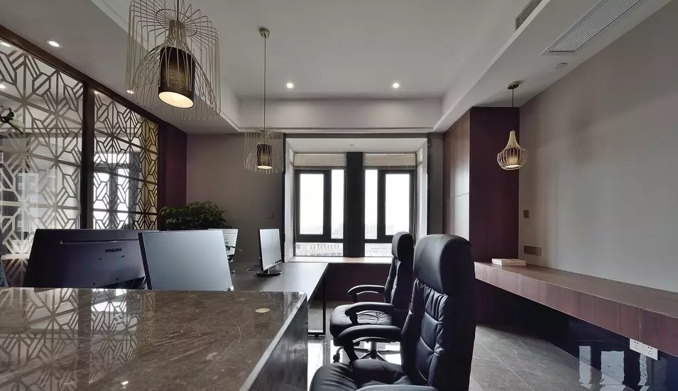 茶歇区和总经理办公室打通,让整体空间更为开阔,不会显得狭隘,墙面背景以及地面铺贴的划分使得空间在融合的同时有了明确的功能分区。