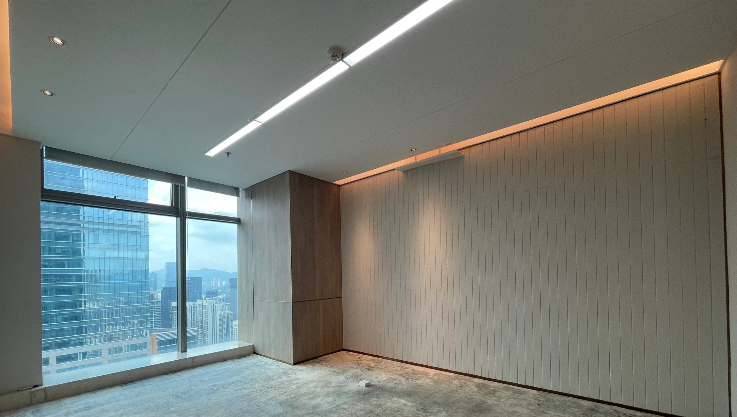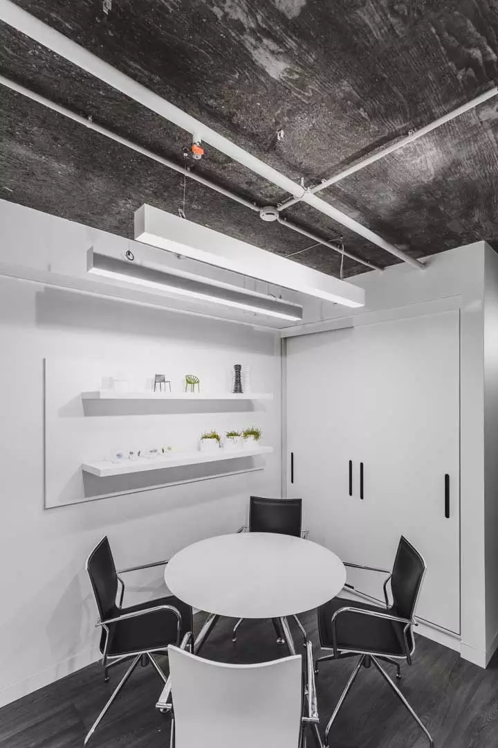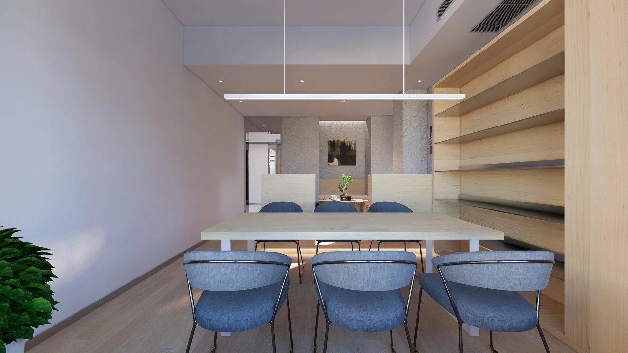 经理室,与开放办公区以一整面顶天立地的玻璃墙(门)进行隔断,通透连贯,后期再装铝百叶,根据使用需要,方便控制空间的私密需求。墙面没有多余的装饰,以硅藻泥一面墙为主要背景,其余墙面则刷白色乳胶漆。地面原木色石塑地板一统跟进。整体空间简约,通透,阳光。