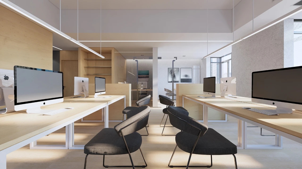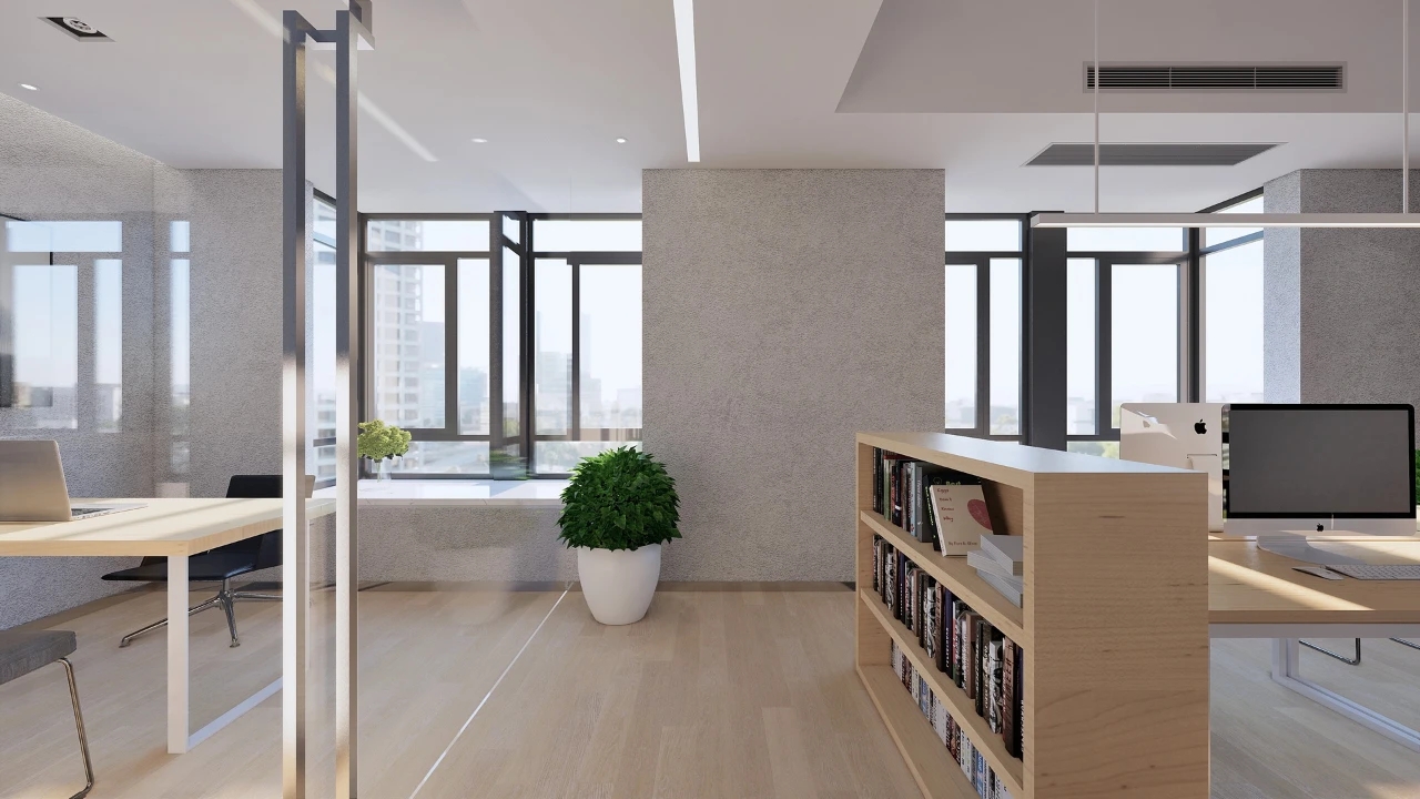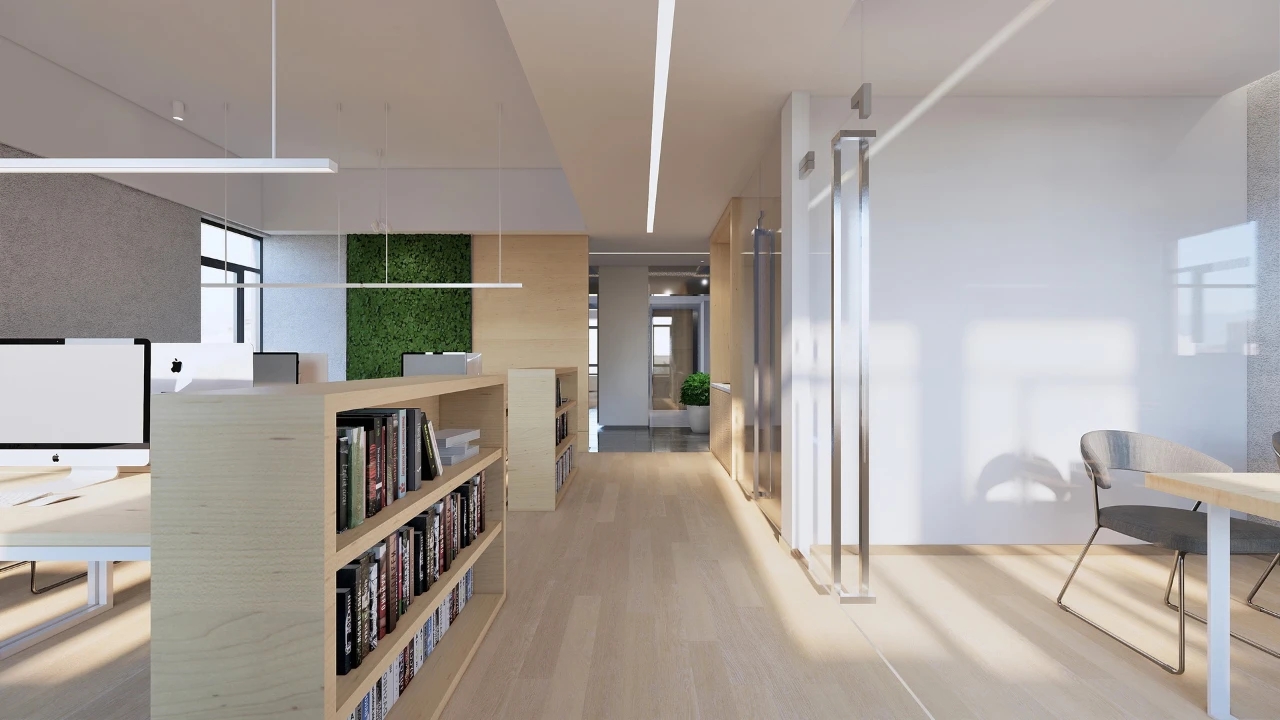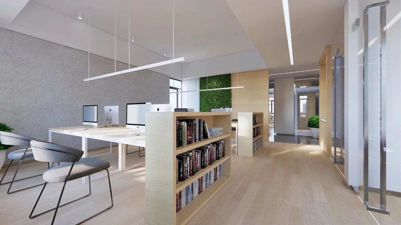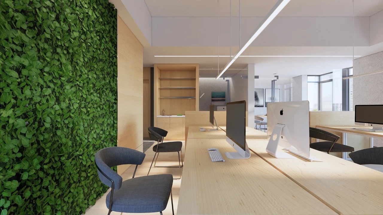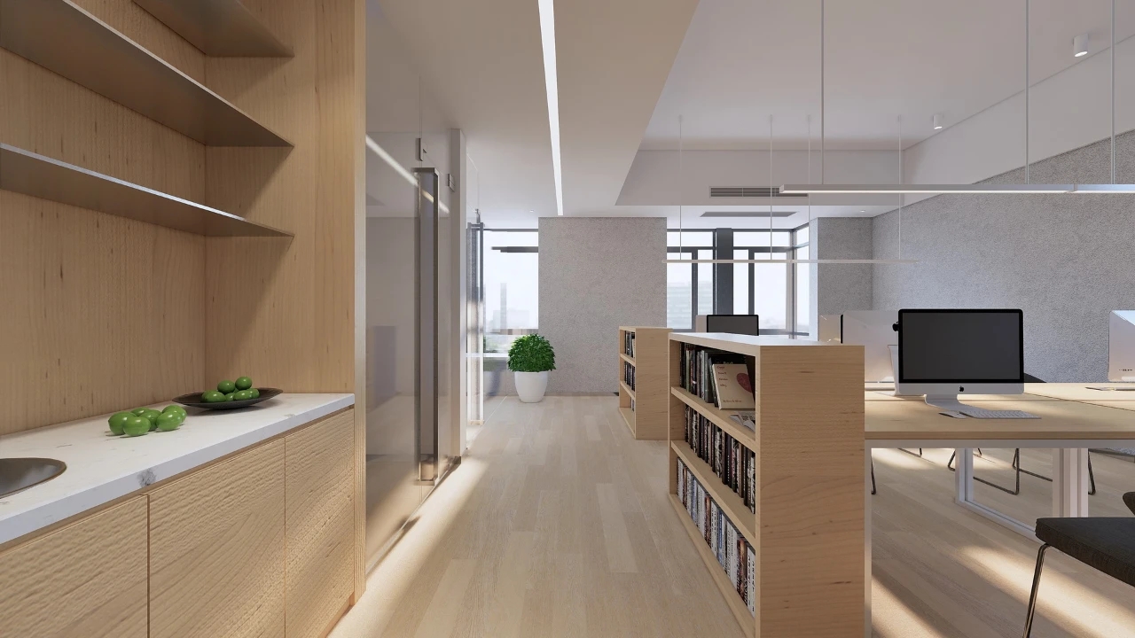 开放式办公区域,功能上主要为:水吧台、阅读书柜隔断、以及八组办公桌椅。地面,原木色石塑地板,看着自然,用着则硬度更高,静音效果也更好。墙面大面积以浅灰色硅藻泥为主,绿色环保;logo背景墙反面,则木饰面跟过来一段,然后以一面绿植墙面收掉,前后呼应,自然而清新。