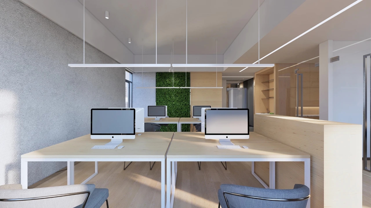 我们就决定围绕其产品诉求来展开空间设计,努力通过办公环境的营造,来衬托呼应其产品的定位和公司的立意。保健品的目的是让人更健康,更有活力;因此“绿色”、“阳光”、“健康”成为我们本次空间设计的核心要义。