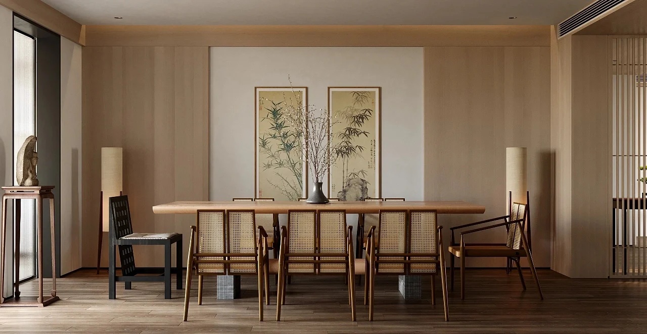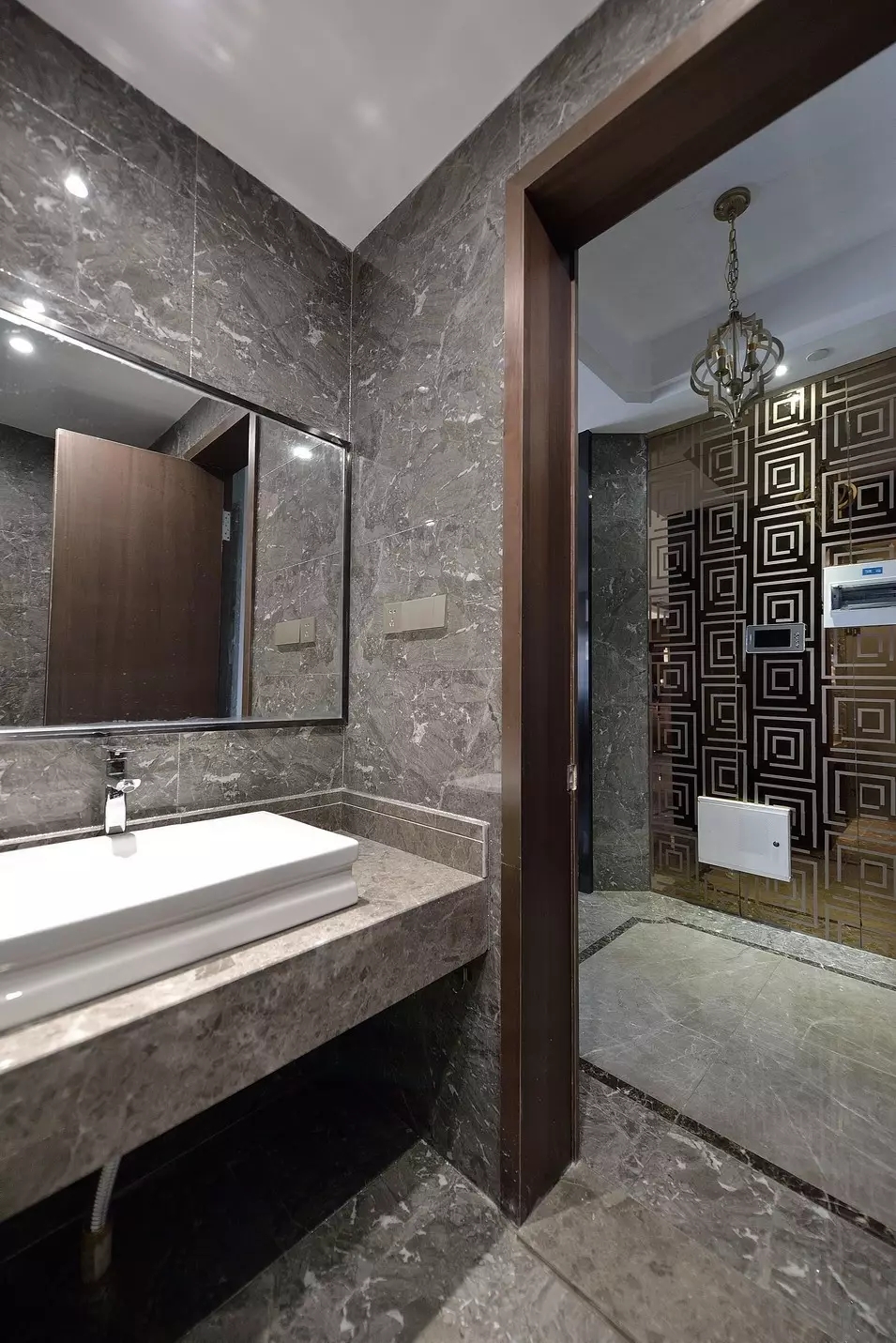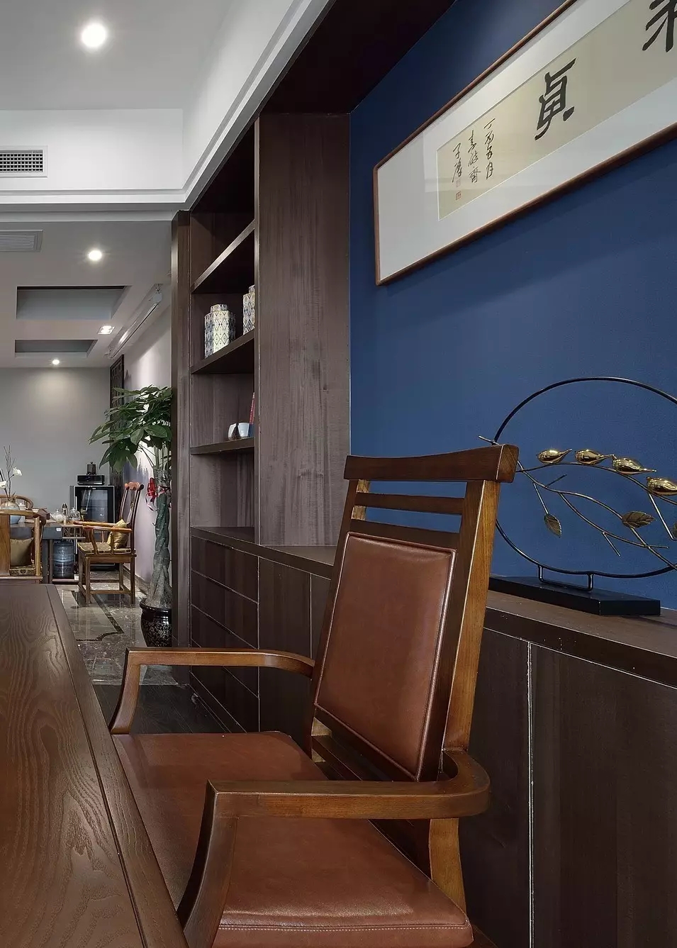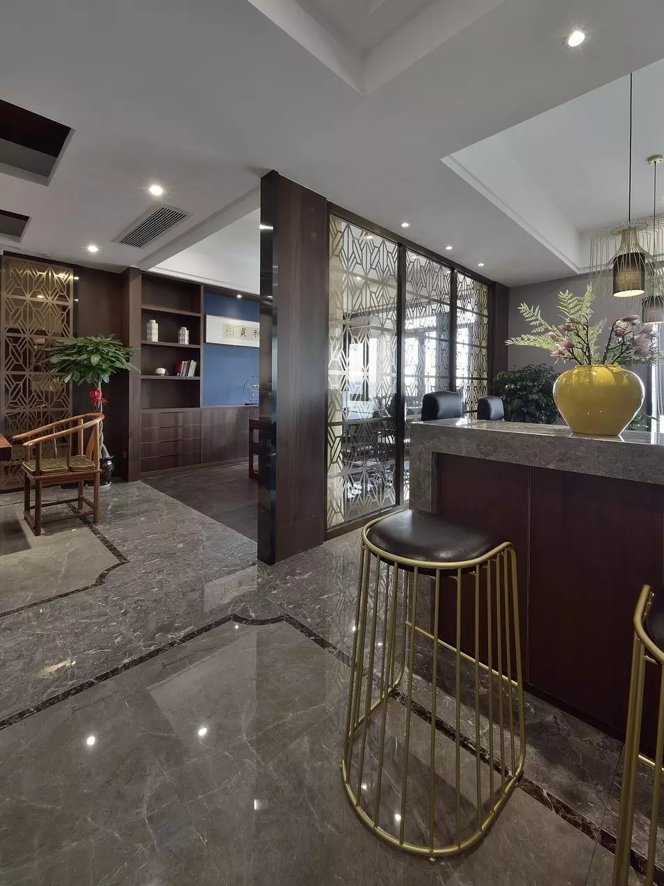 茶歇区,新古典风格的金属花片与充满意境的山水画背景搭配,给整体营造了一种高山远水的禅意氛围,忙余时与两三人来一盅清茶,享受一份悠然。