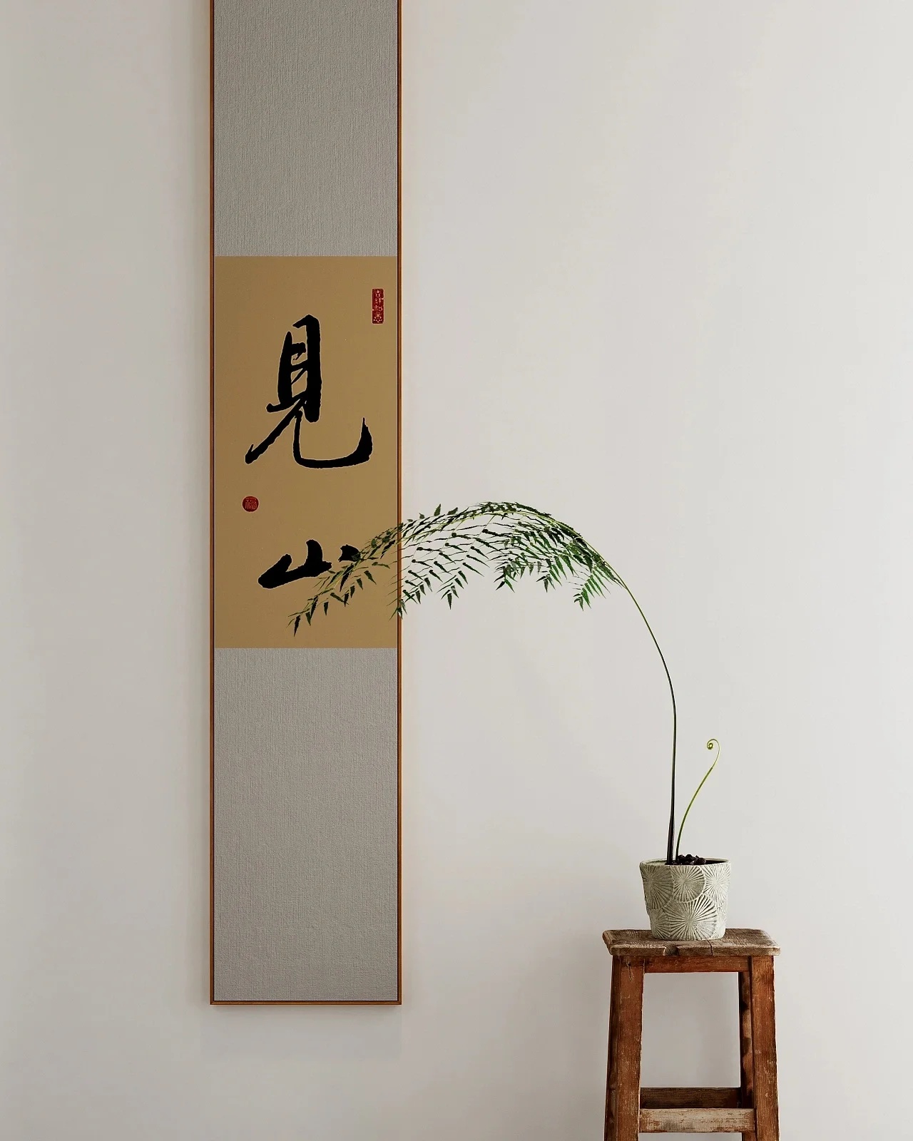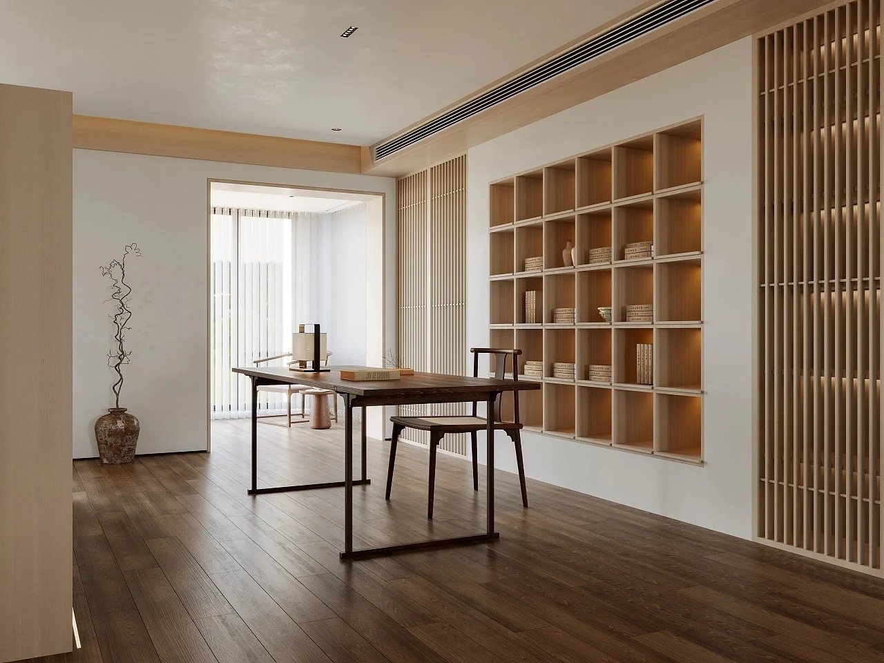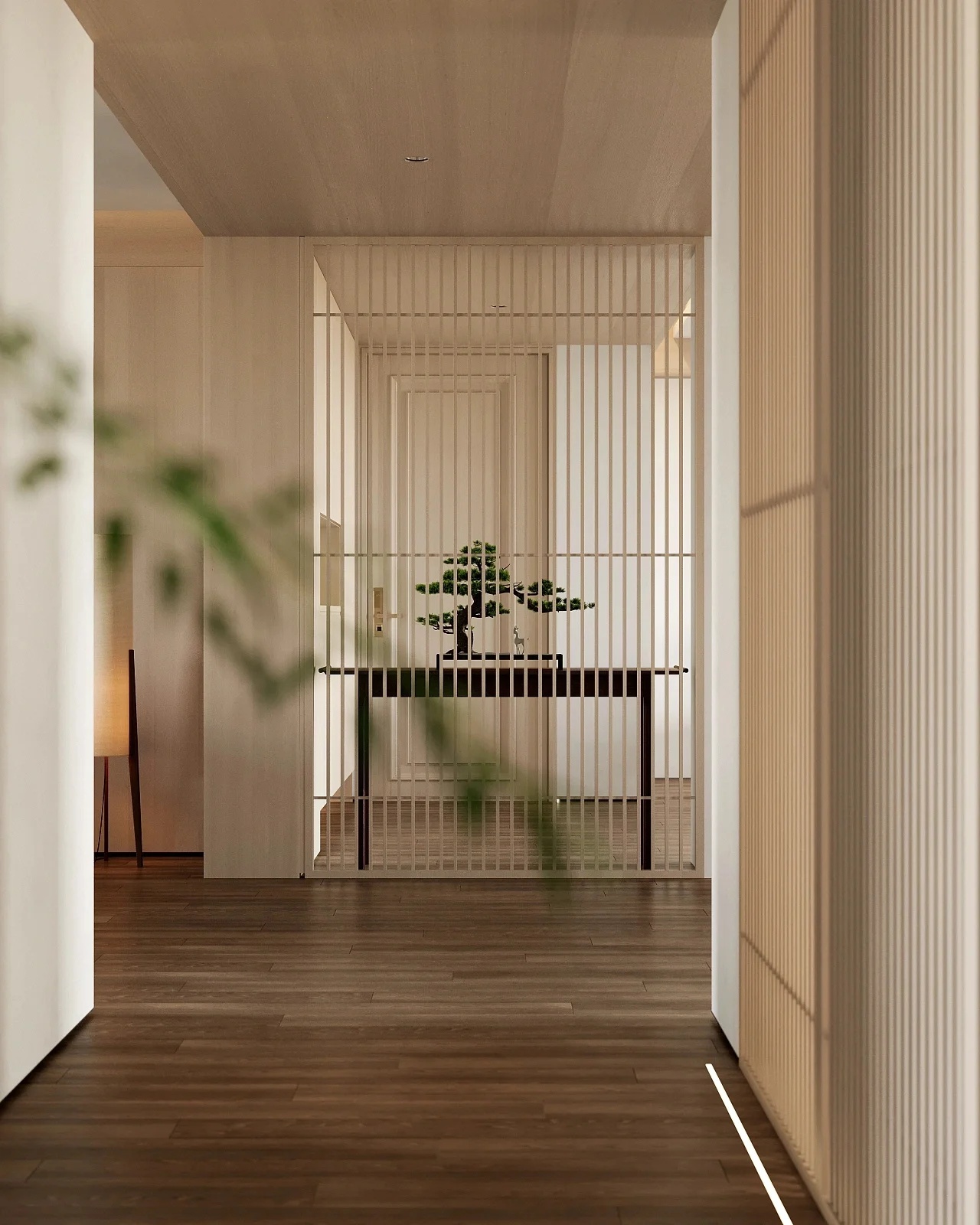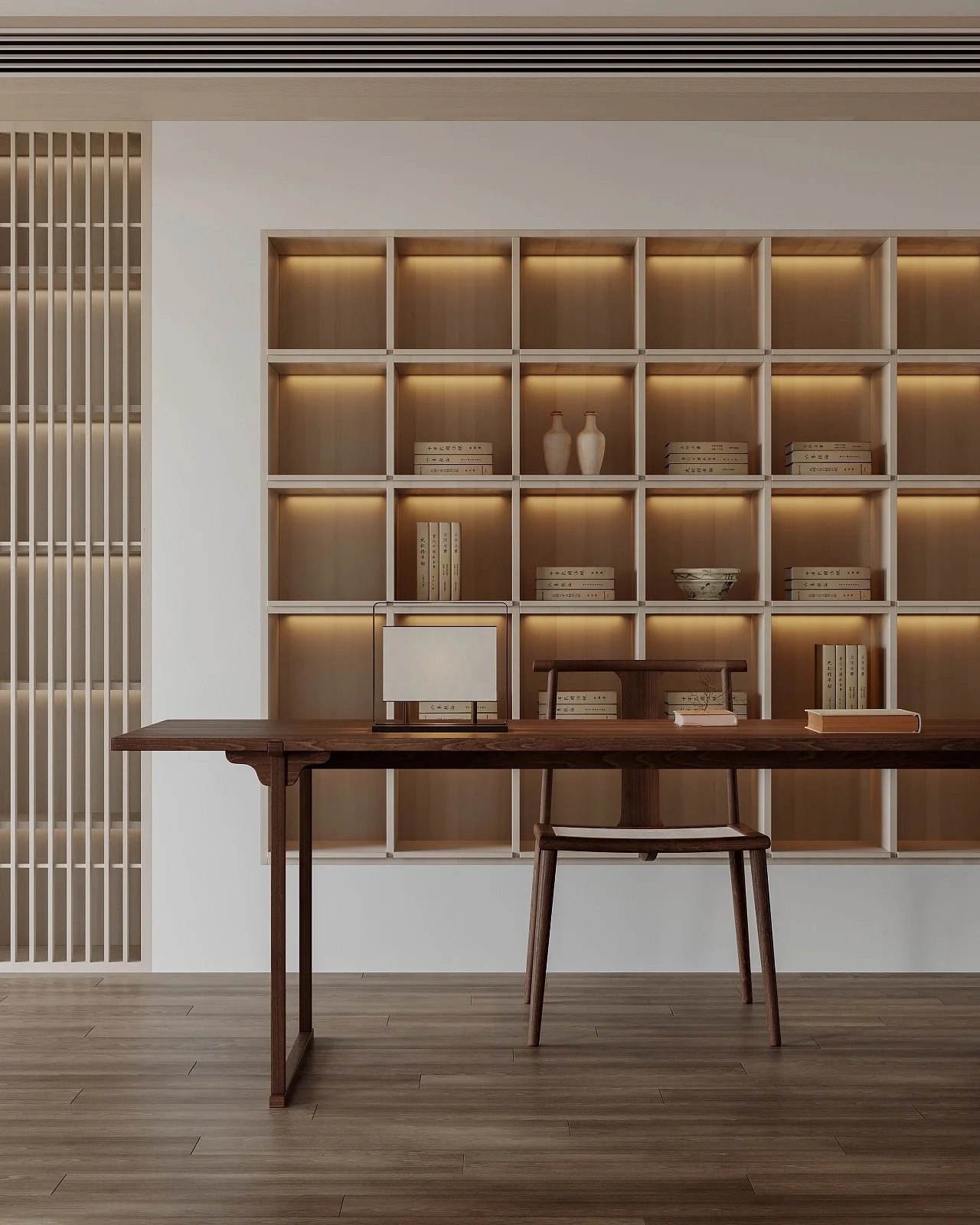喝茶区域,主要用来接待客户和朋友。半高的方格木作隔断,让这个区域有一种明显的围合感,但由于这个空间总体不大,因此半高,可以让视线继续延伸,有围合不局限,坐着安定,看着则相对开阔些。