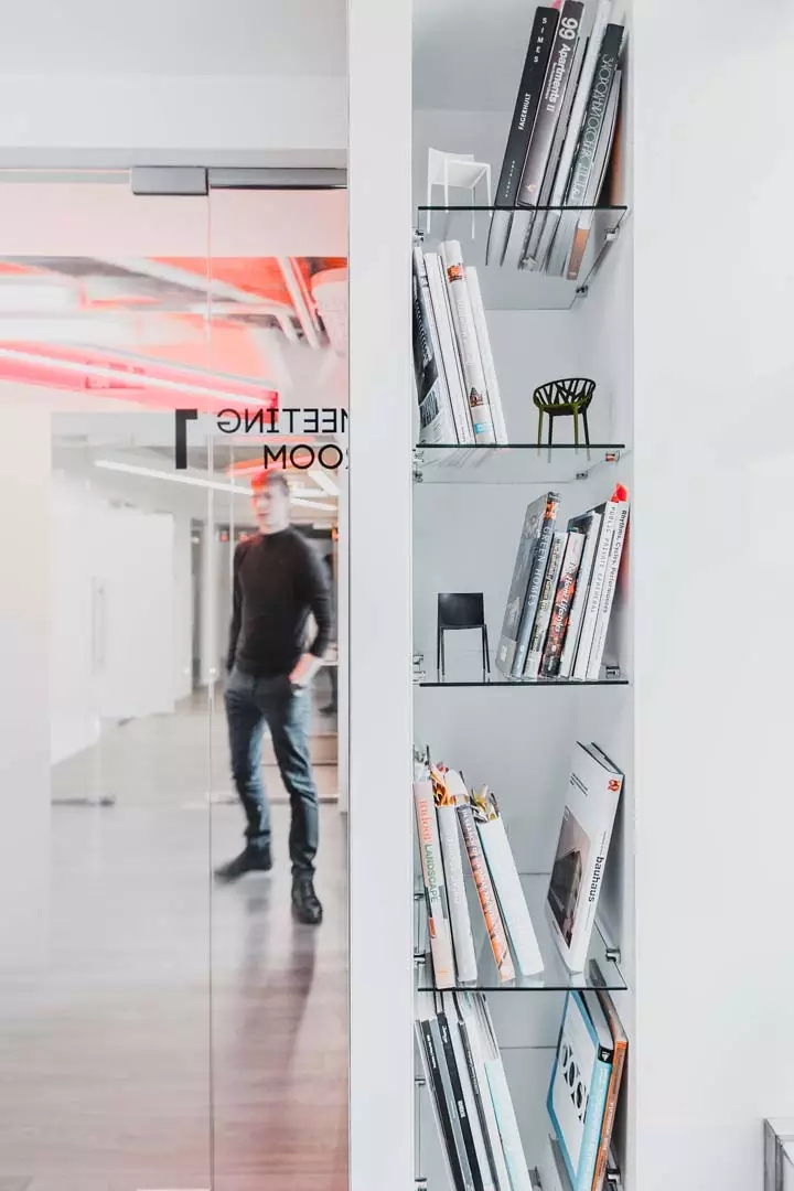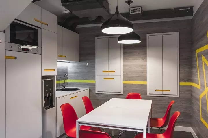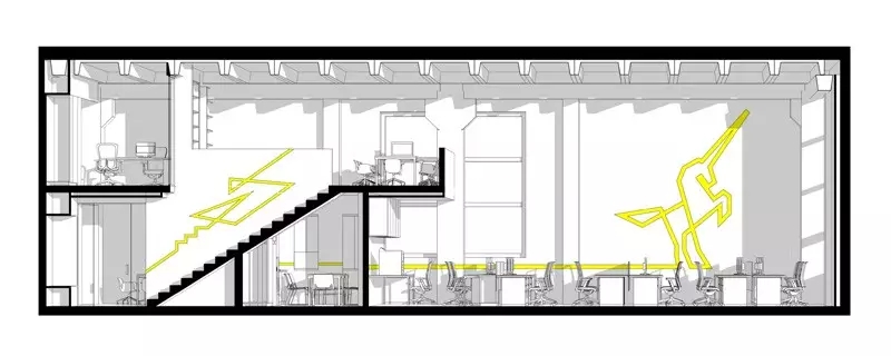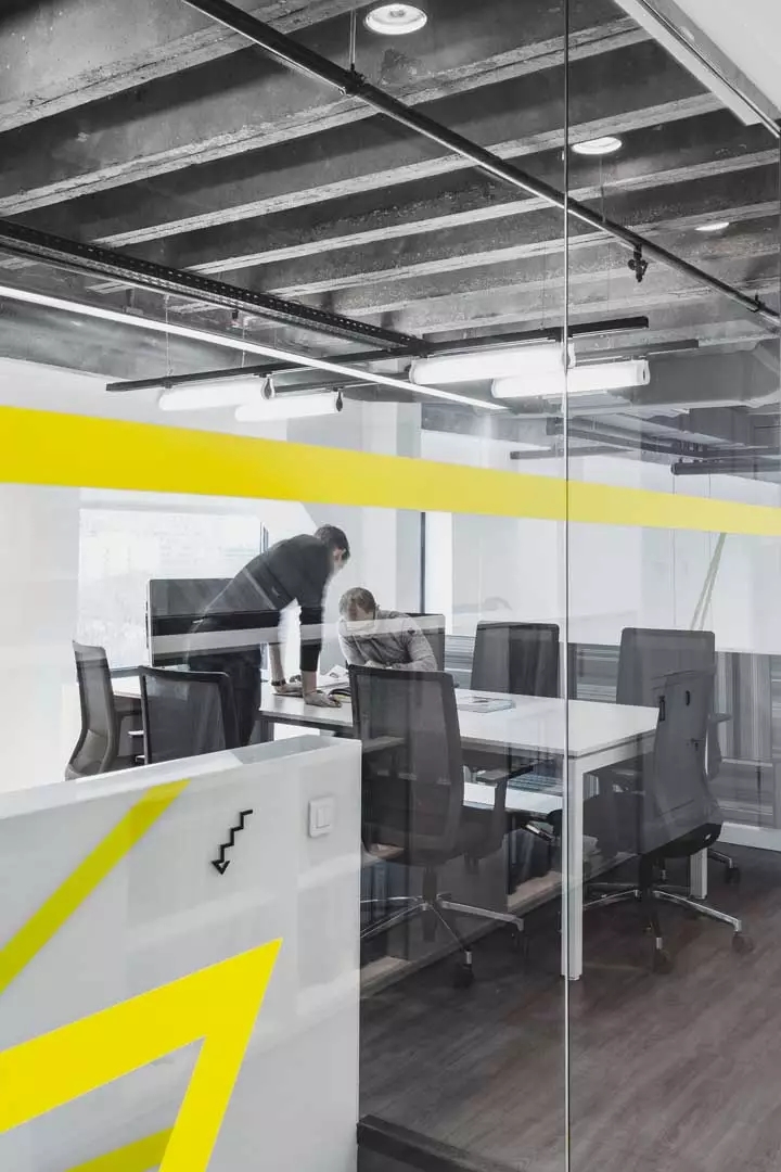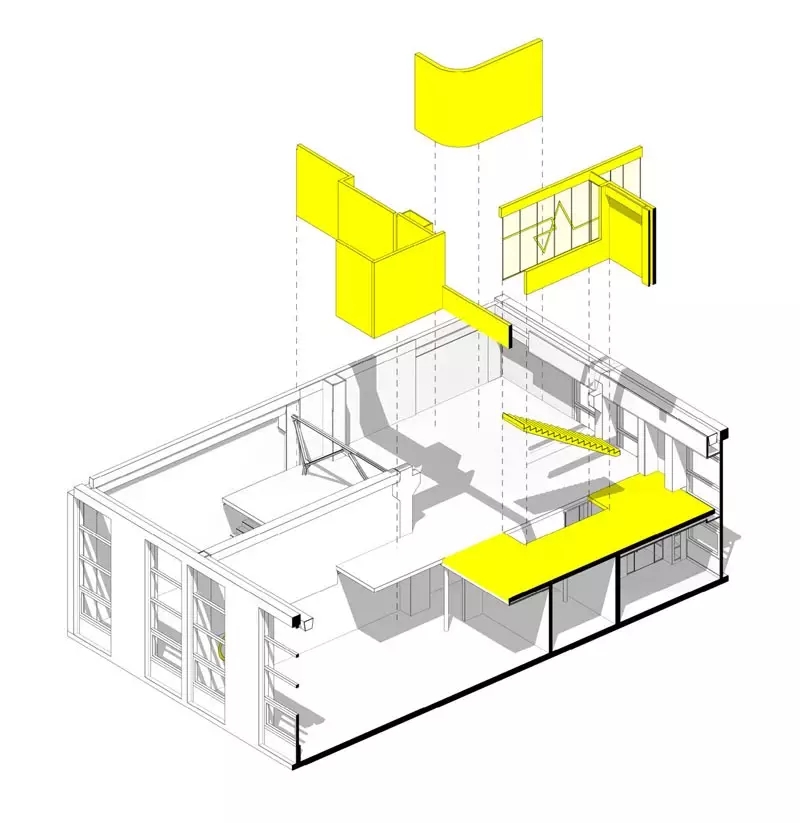 灰色与白色是空间的主调。设计巧妙的加入明黄色标志色,如一楼开放工作区墙面上创意独角兽图形设计、桌面上精心置放的花盆和文件夹,一抹亮黄划过冷峻静谧的空间,犹如创意灵感霎那闪现。独角兽的创意图形设计已经成为IND Architects工作室的新标签。