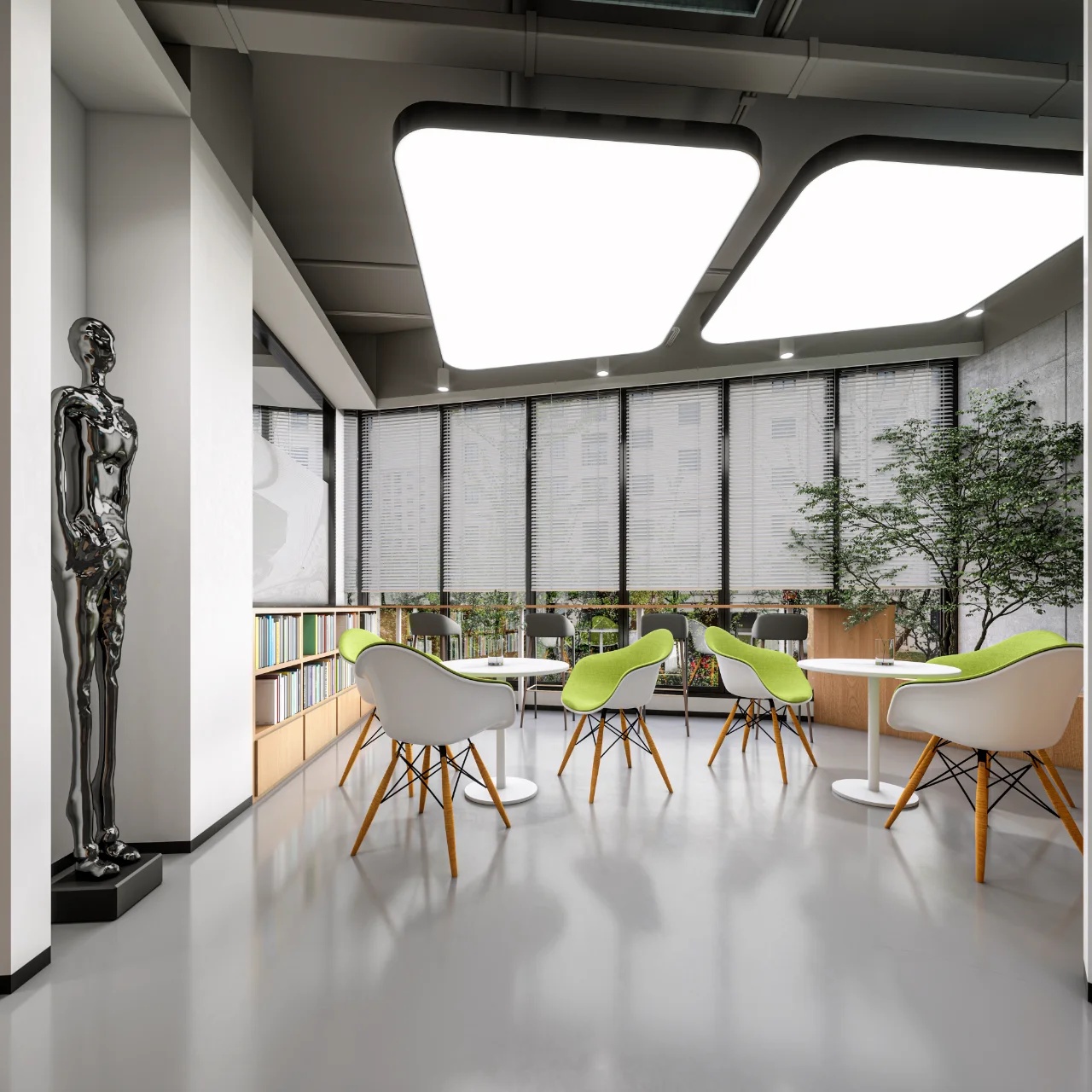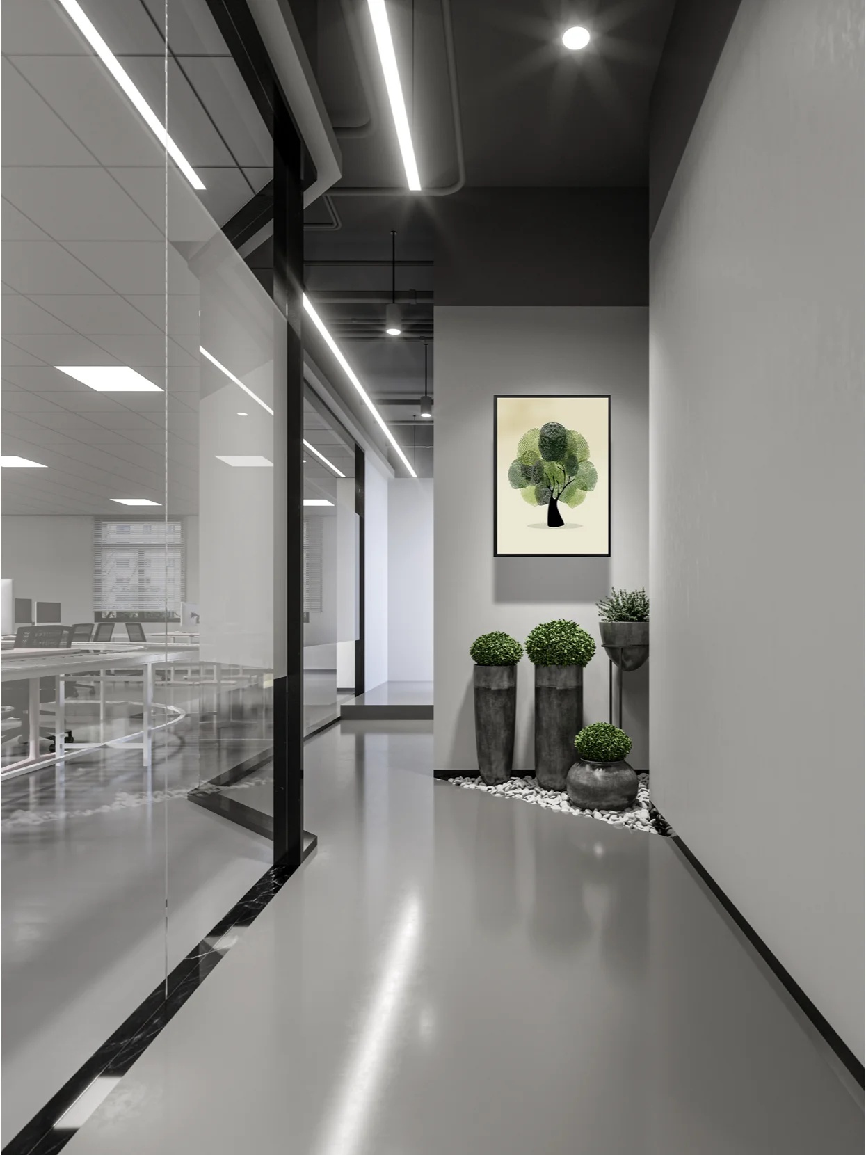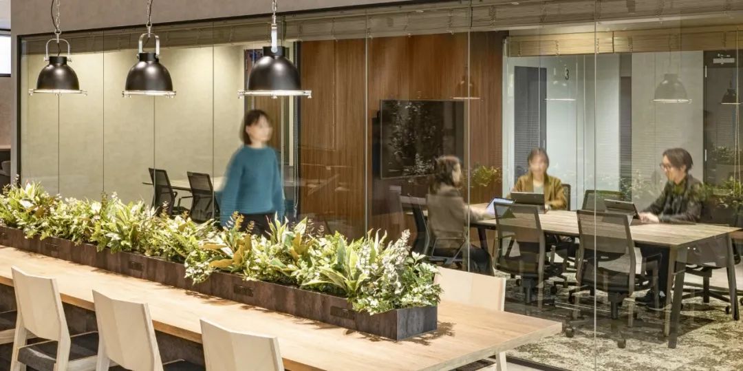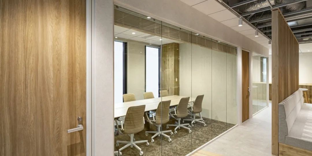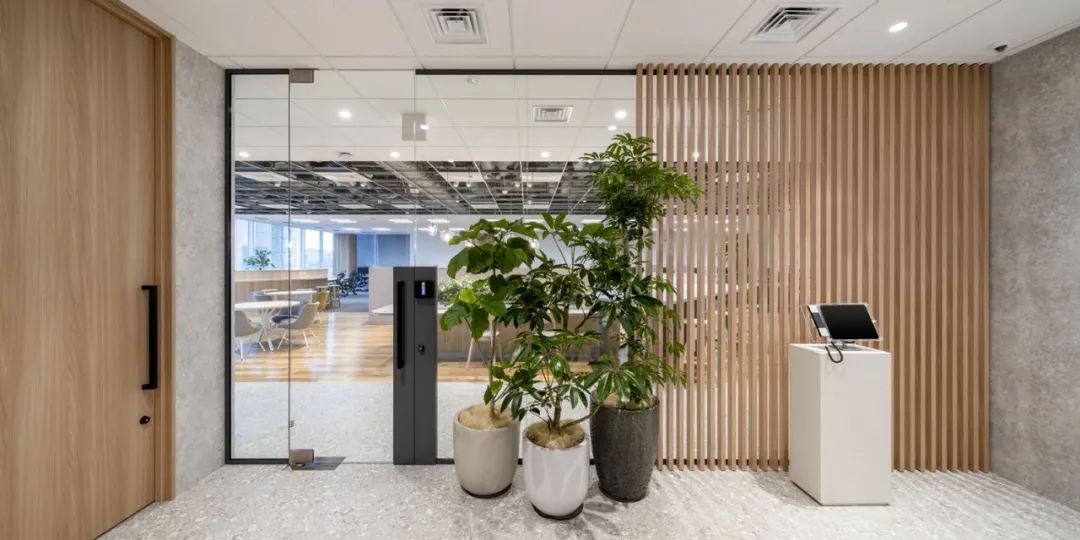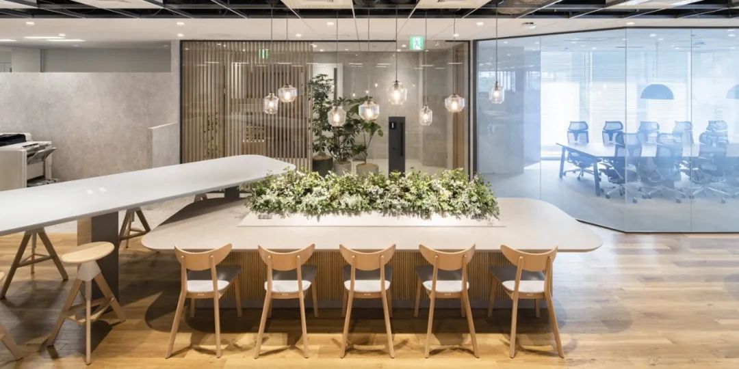 对于新办公室,我们着重强调了聚集在办公室的意义,如提高生产力、沟通的数量和质量、培育公司文化等。 入口设计有高天花板和玻璃墙,营造出宽敞的感觉。 另一方面,为了保持私密性,用木百叶和绿植来阻挡视线。