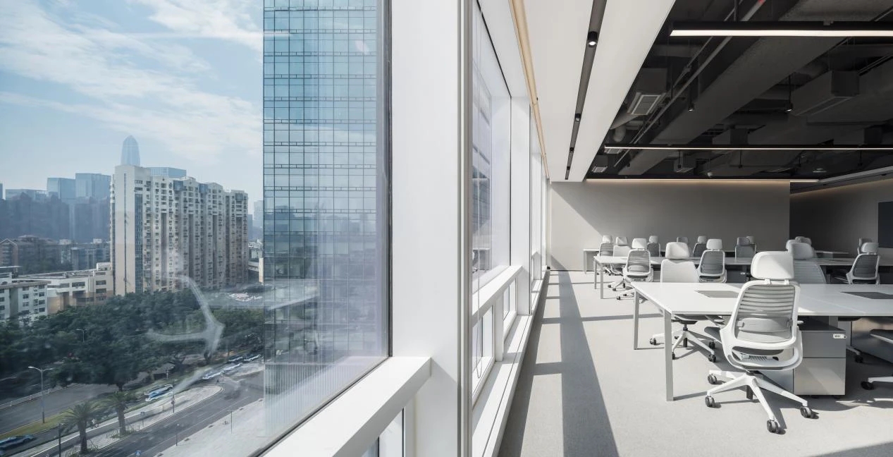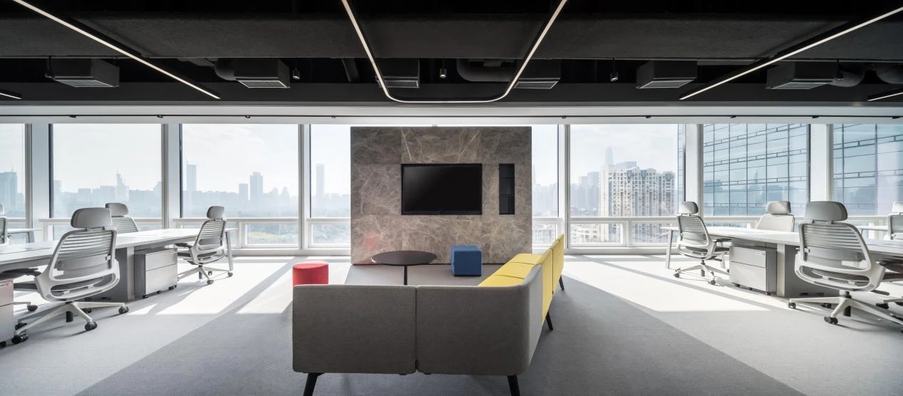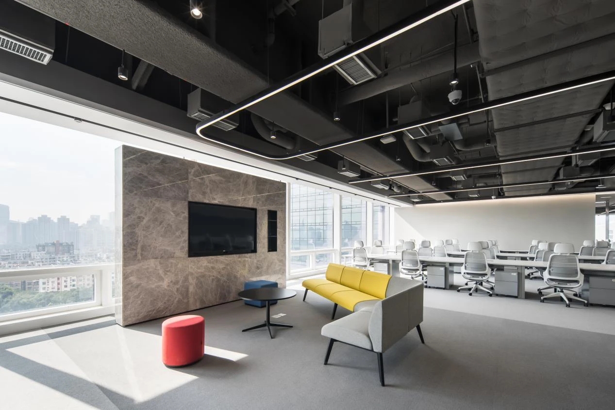 一整排落地窗,接受着阳光的照射,空间大气通透。倚坐在蒙德里安三原色的定制家具,远眺繁华的城市胜景,工作之余,纵享轻松。