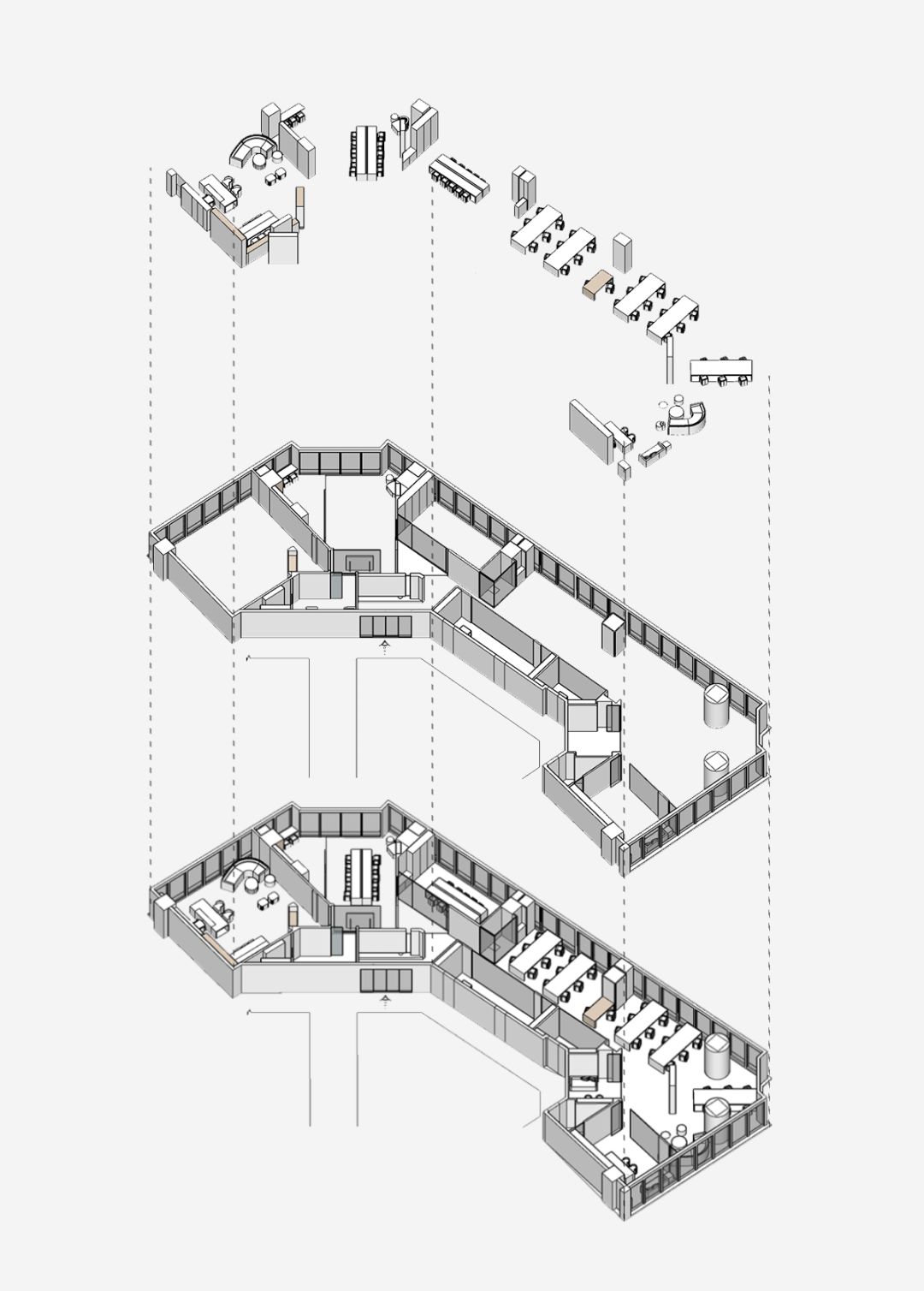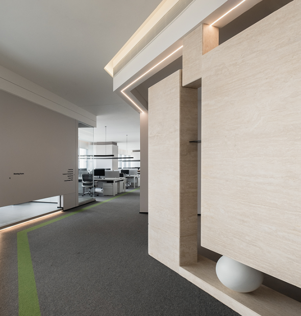 整座办公室不以隔间划分界线,不以尺寸衡量大小,打造独立又不疏离的空间感。人可以在自己喜欢的区域停留,也会把停留作为自己高效的时段去完成工作。从这里出发,企业墙上传递着功能空间的信息,导向着过去的印记,当下的发展,未来的愿景。