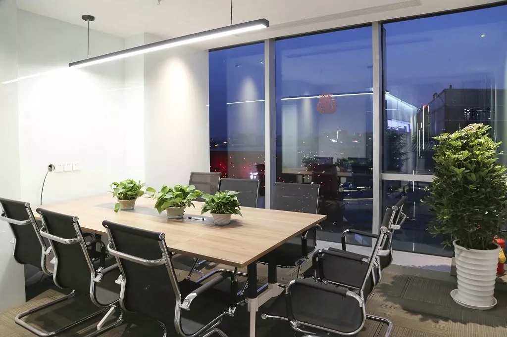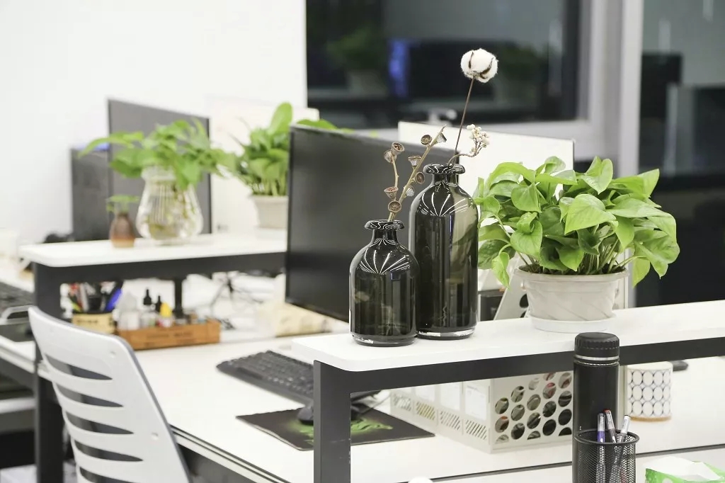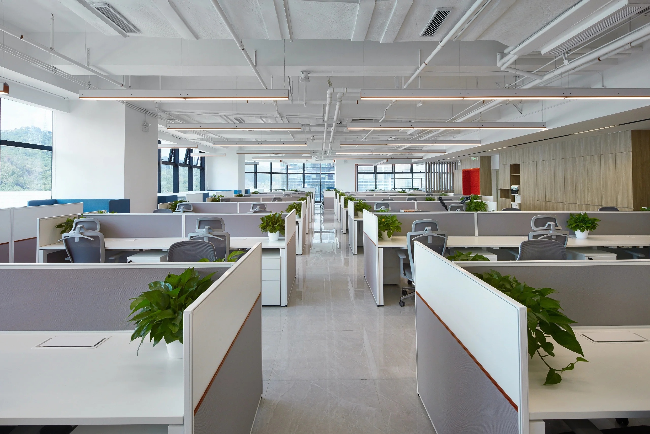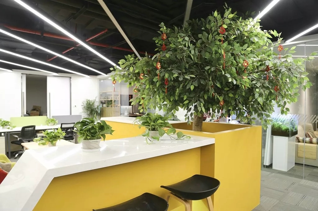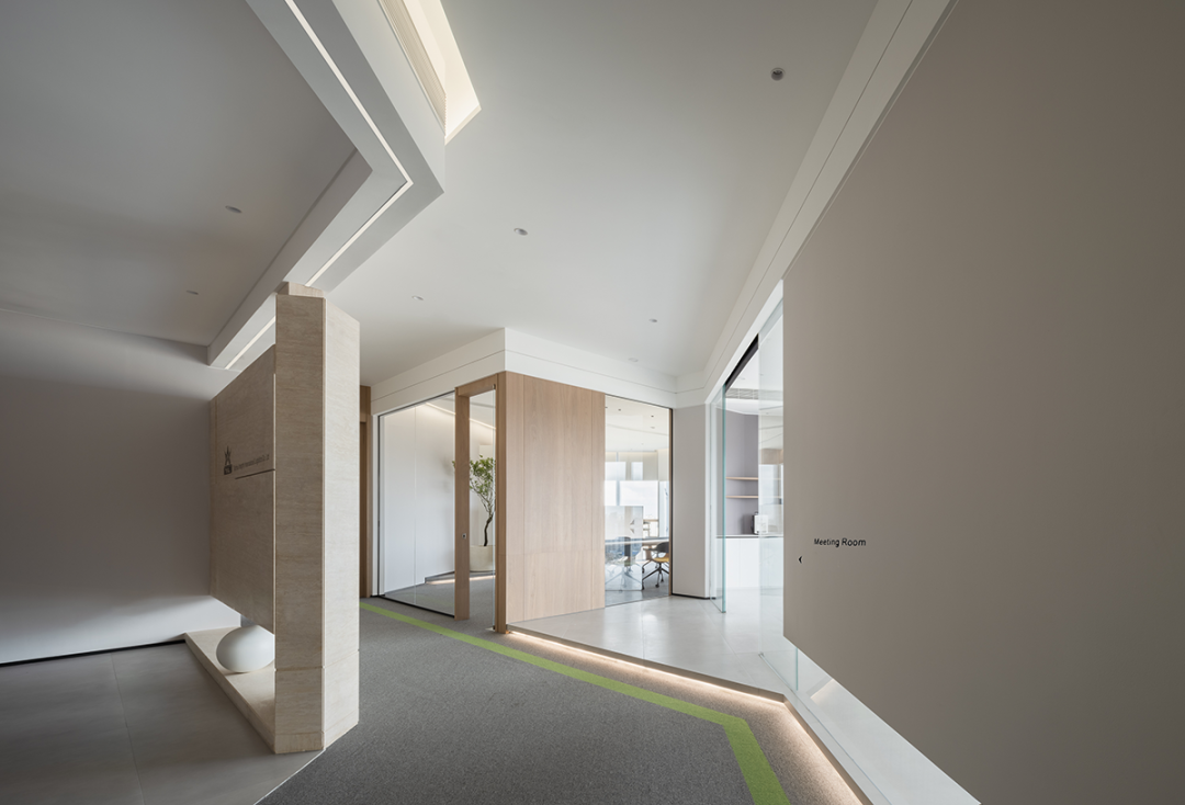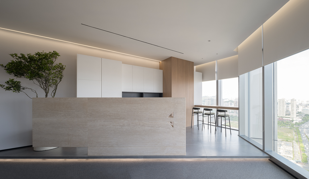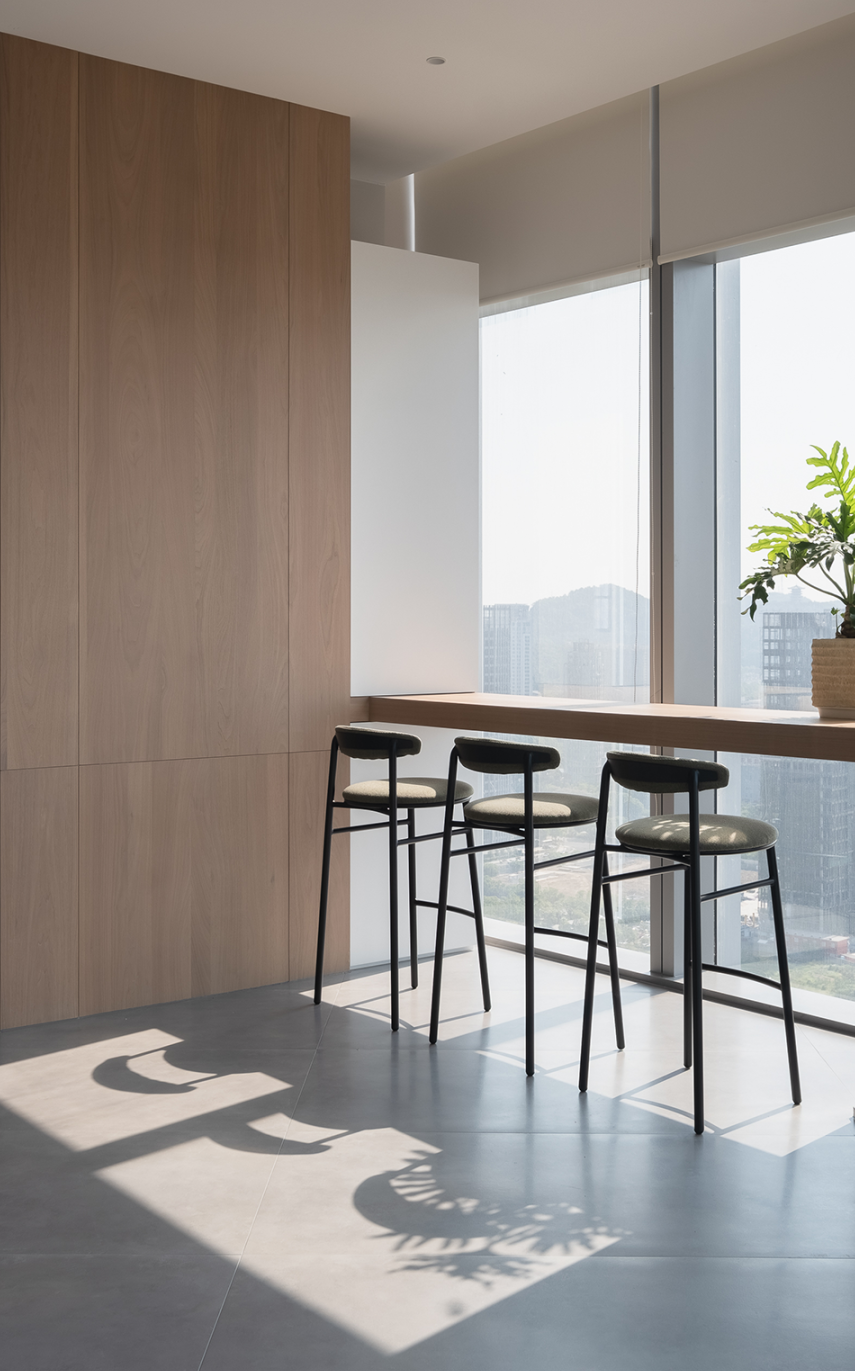 茶水间的墙壁仍以木白为主,而与会客厅之间的隔断则特别使用镂空处理,将三角形的开口从简单的形状转化为修饰手段。工作之余来到茶水间补给小憩,落地窗外城市的繁华与办公室内的安静互相映衬。细碎的光影洒进室内,赋予绿植一片生机,营造欢乐的午茶氛围。