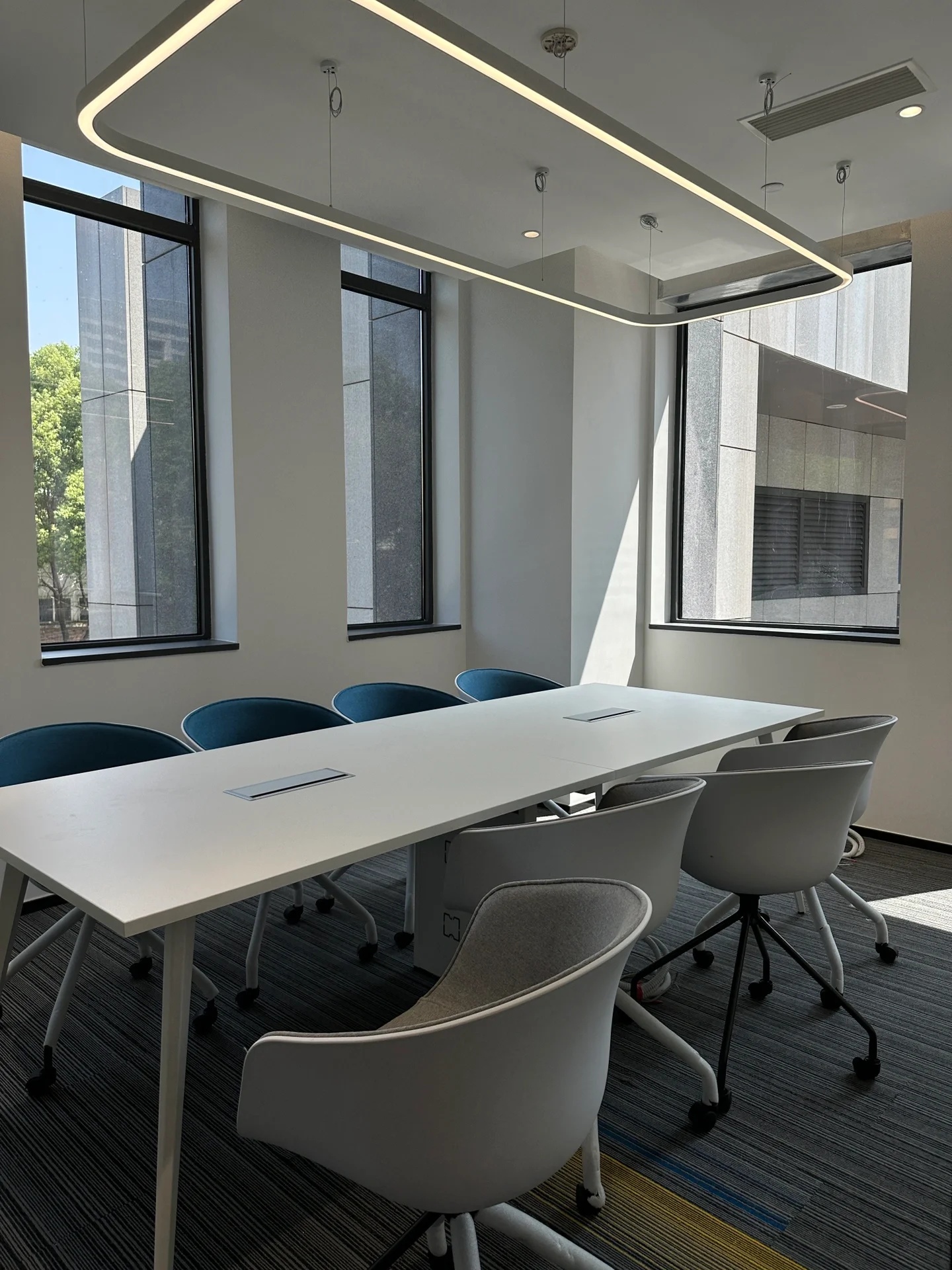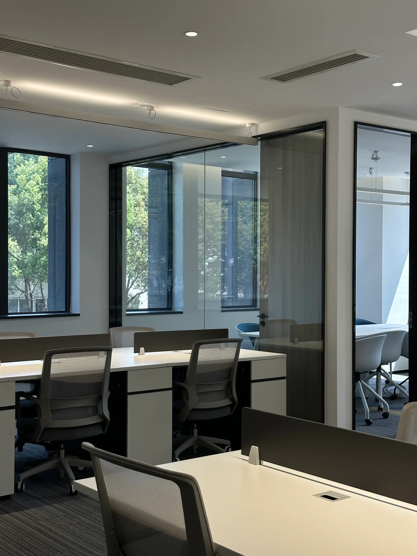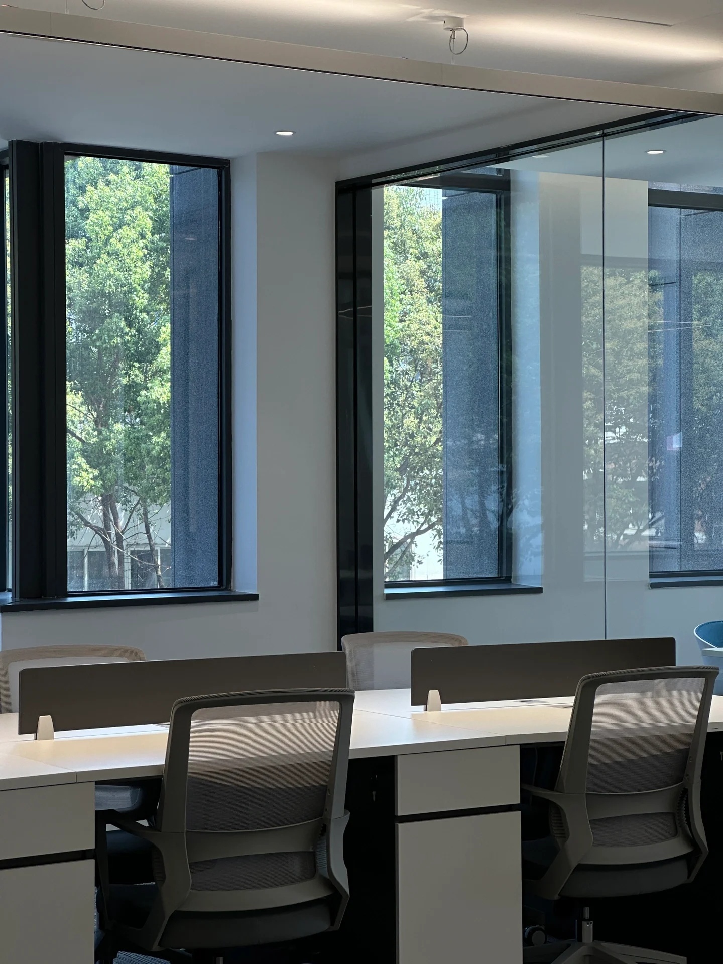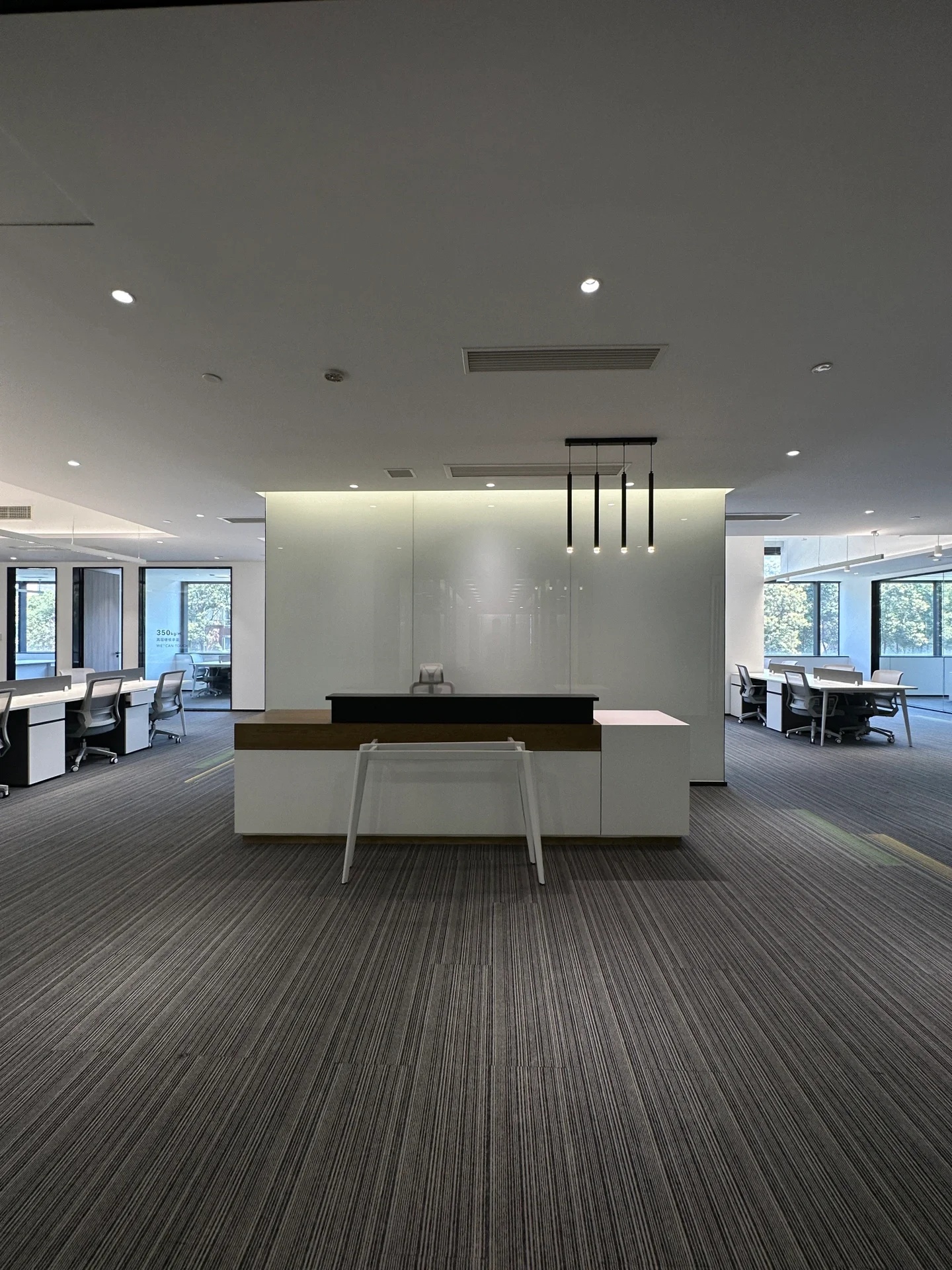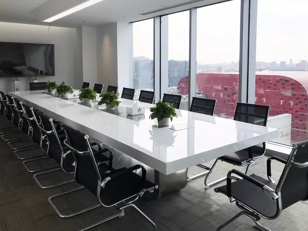 茶水间的墙壁仍以木白为主,而与会客厅之间的隔断则特别使用镂空处理,将三角形的开口从简单的形状转化为修饰手段。工作之余来到茶水间补给小憩,落地窗外城市的繁华与办公室内的安静互相映衬。细碎的光影洒进室内,赋予绿植一片生机,营造欢乐的午茶氛围。