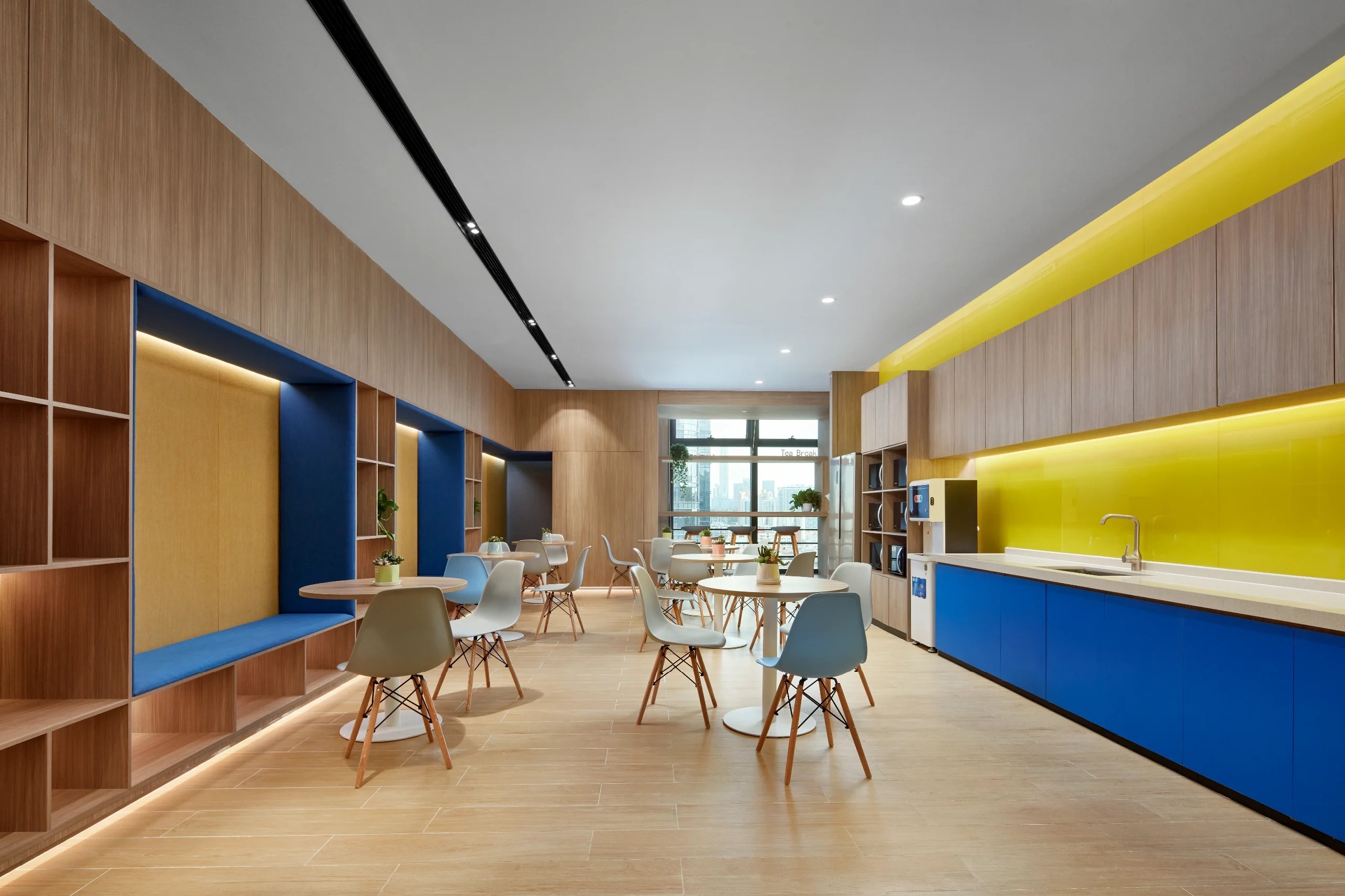 休闲区的设置改变了传统的办公布局,无近想要传递一种轻松不拘束的工作氛围,利用简单纯粹的色彩空间,创造类似社区式的体验。同时休闲区也可以充当会客区,相较传统的格子间,不会显得拘谨与束缚,可以更自由的表达内心的想法。