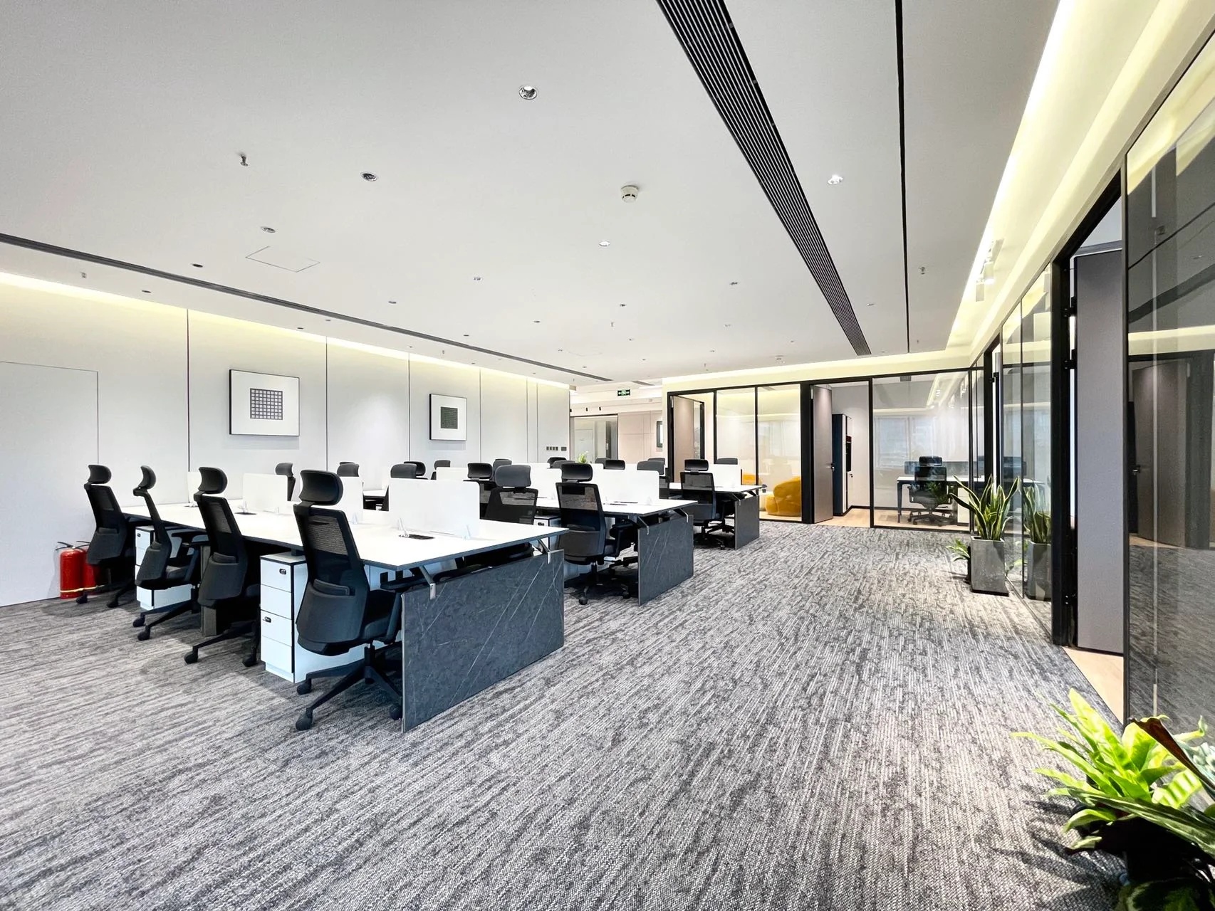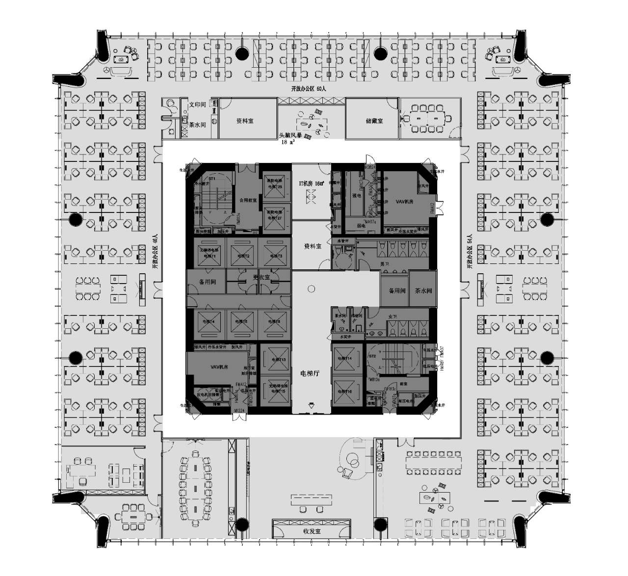 开放办公区舍去了稳重的墙,采用透明化的格局,缩短了人与人之间的距离。隔间墙以玻璃代替墙壁,在视觉上使空间有延伸放大的感觉。在布局上将受自然光线好的区域留给员工,办公室及会议室等区域靠近核心筒布置,最大程度上给予员工舒适的办公环境。