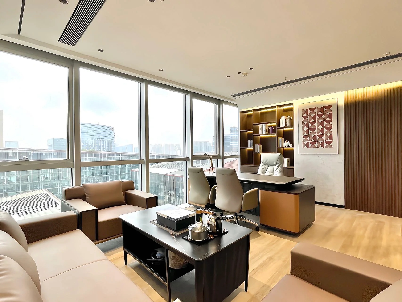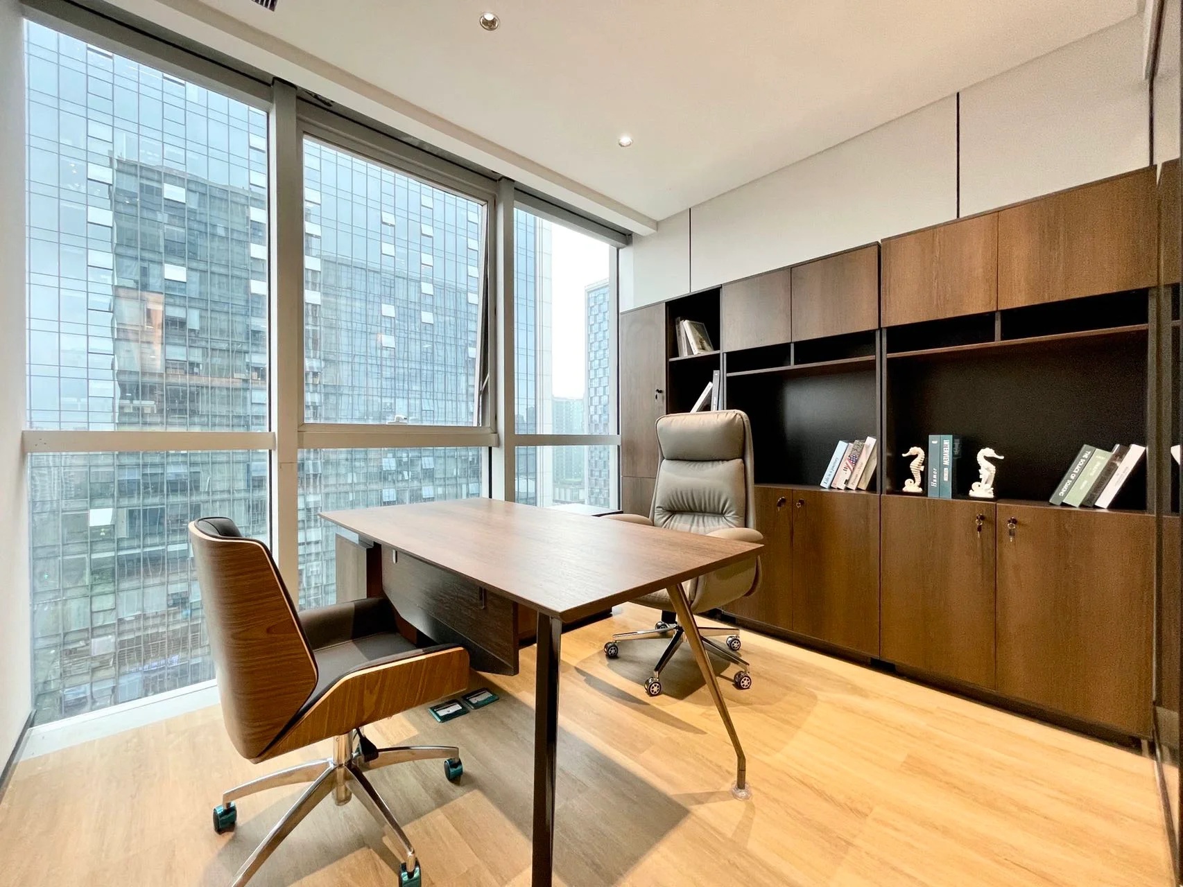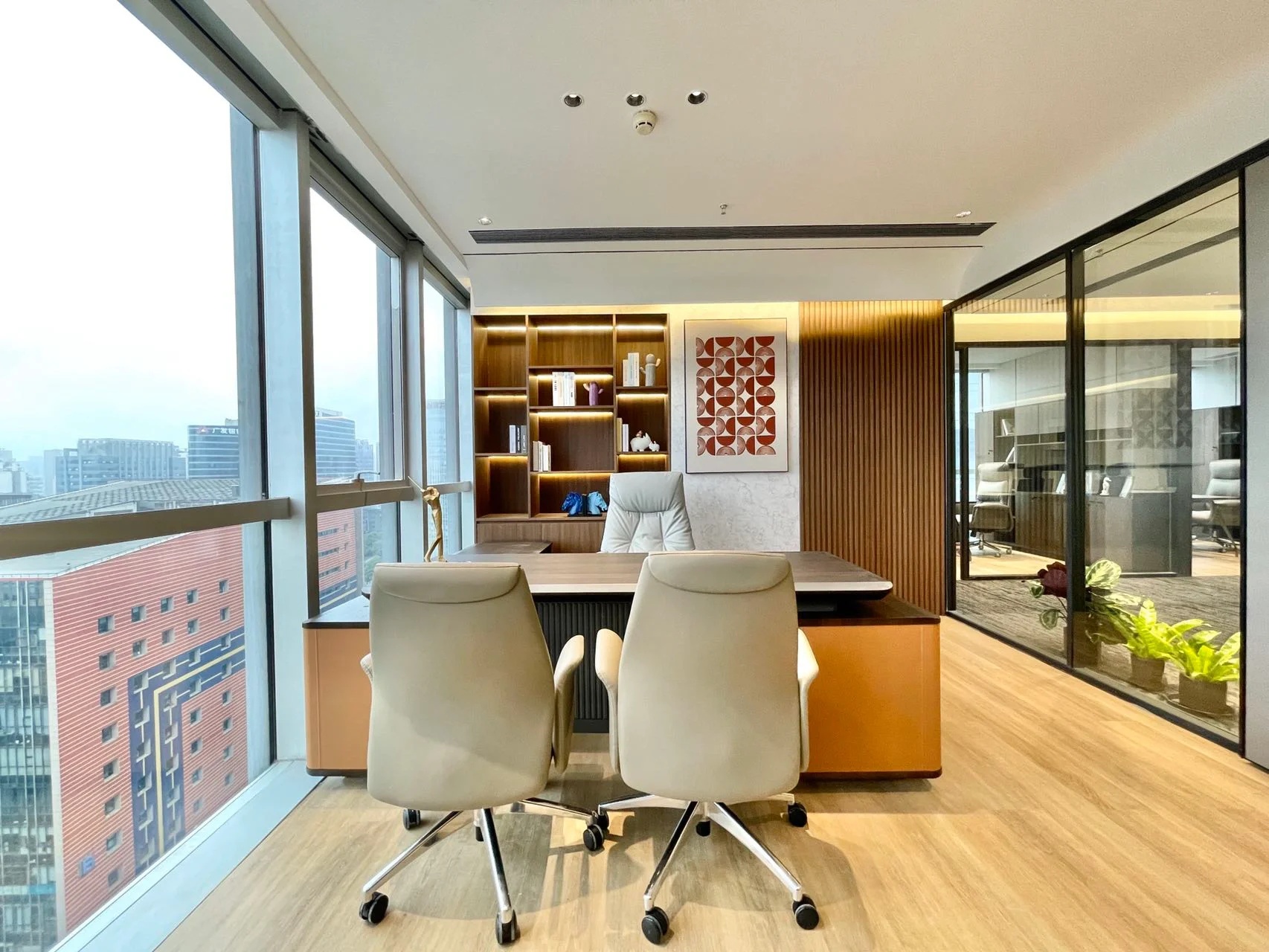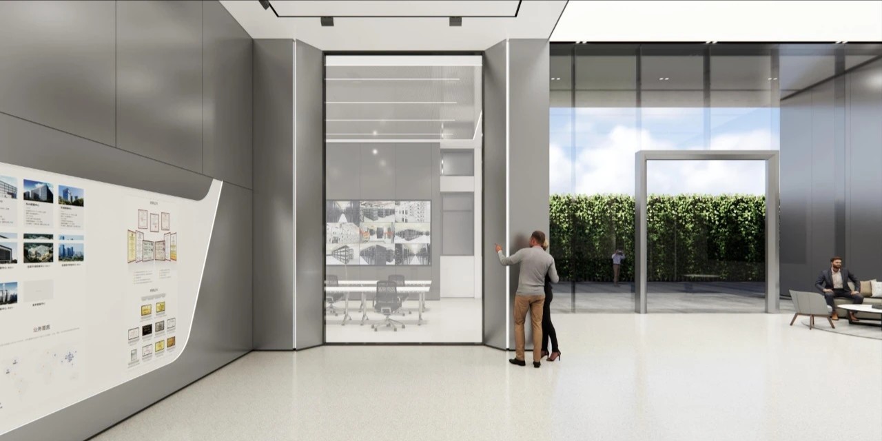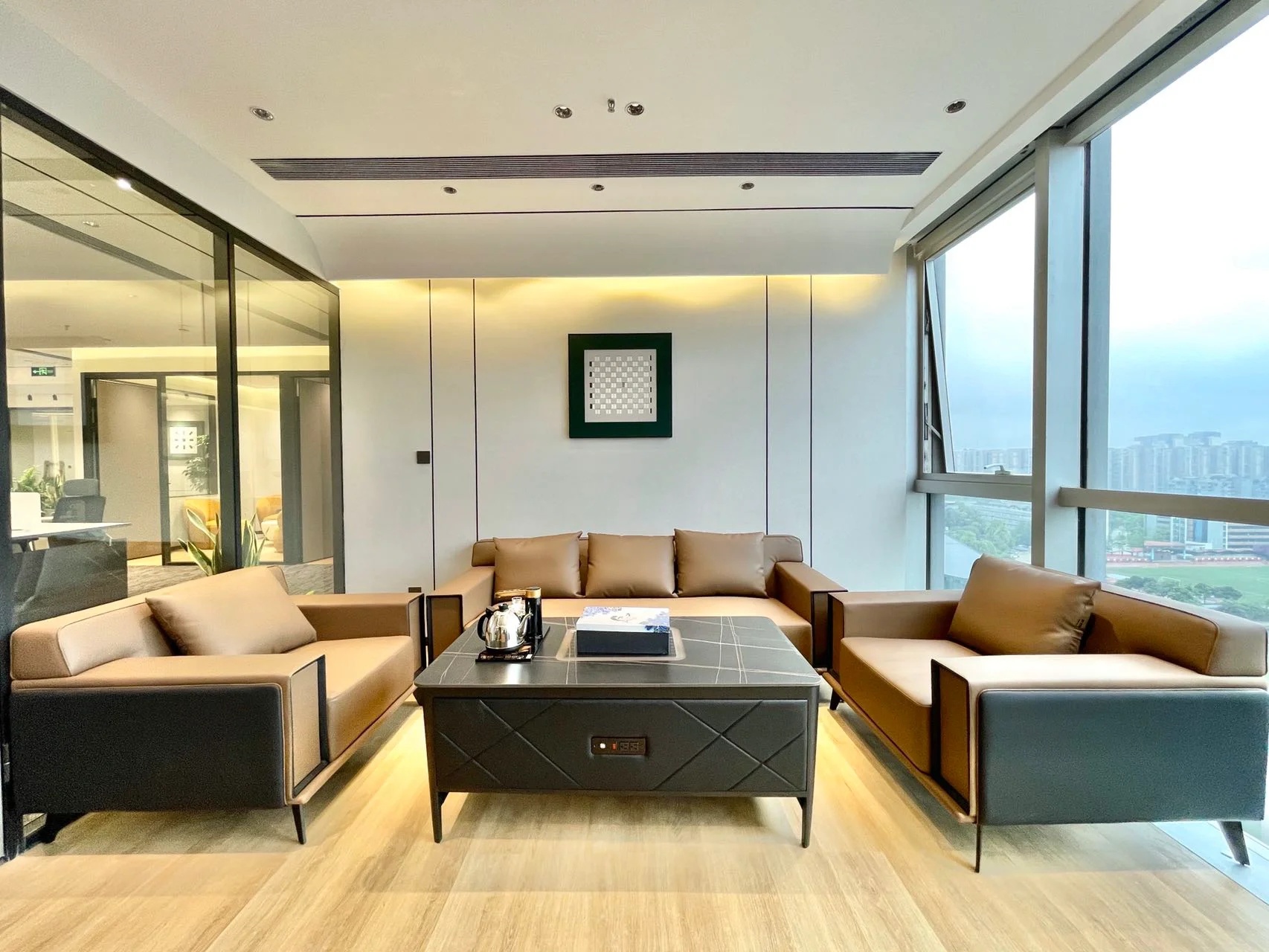 经理室采用大面积的落地窗,保证了充足的光照时间的同时让整个空间更加简洁明亮,透明的玻璃隔断代替了传统的非透明墙面,使整个空间视野更加开阔,打破了以往经理室封闭狭窄的空间。阳光穿透玻璃,照射到空间中去,可以在白天阳光充足的时候减少对人工照明设备的依赖。