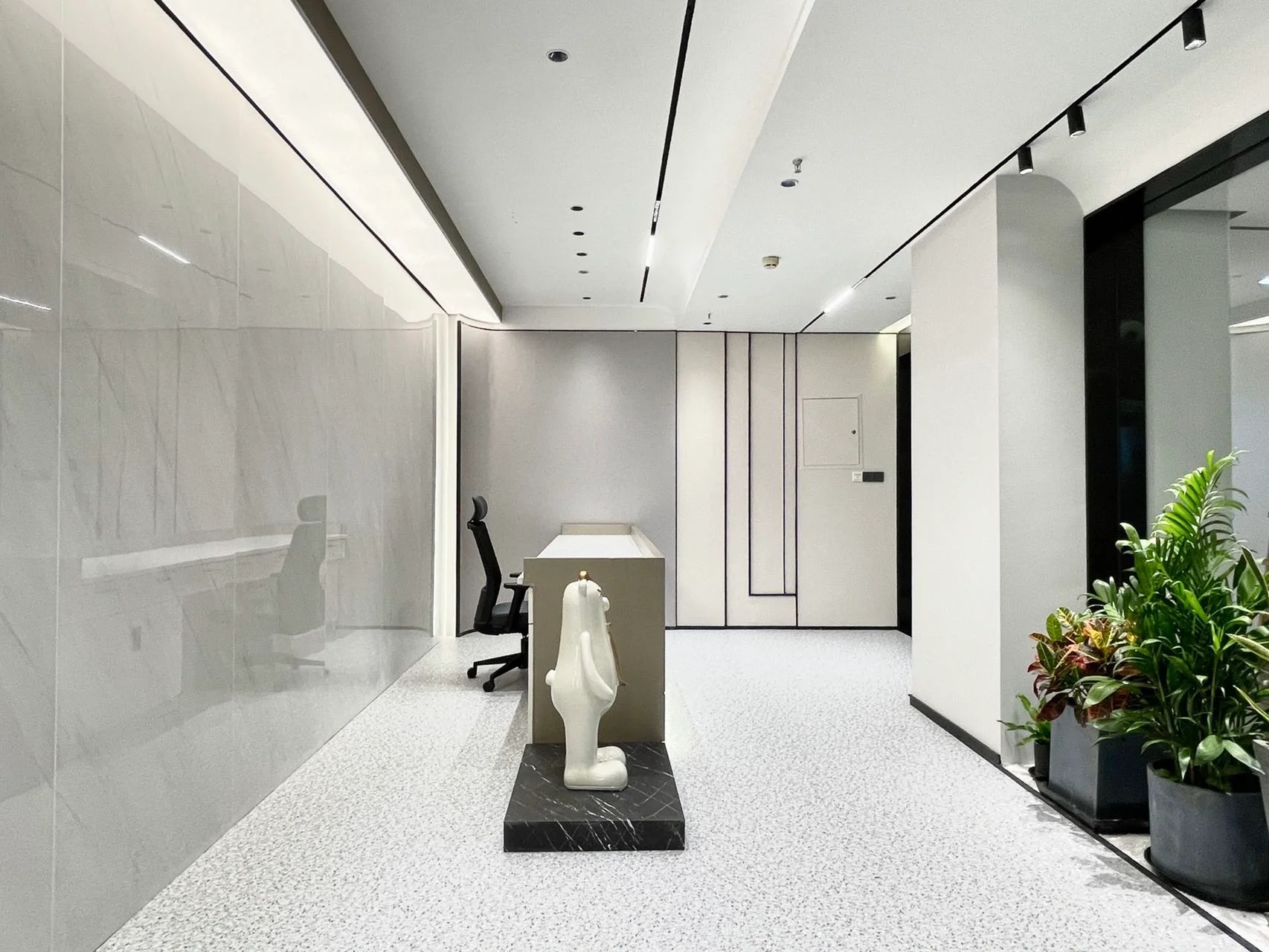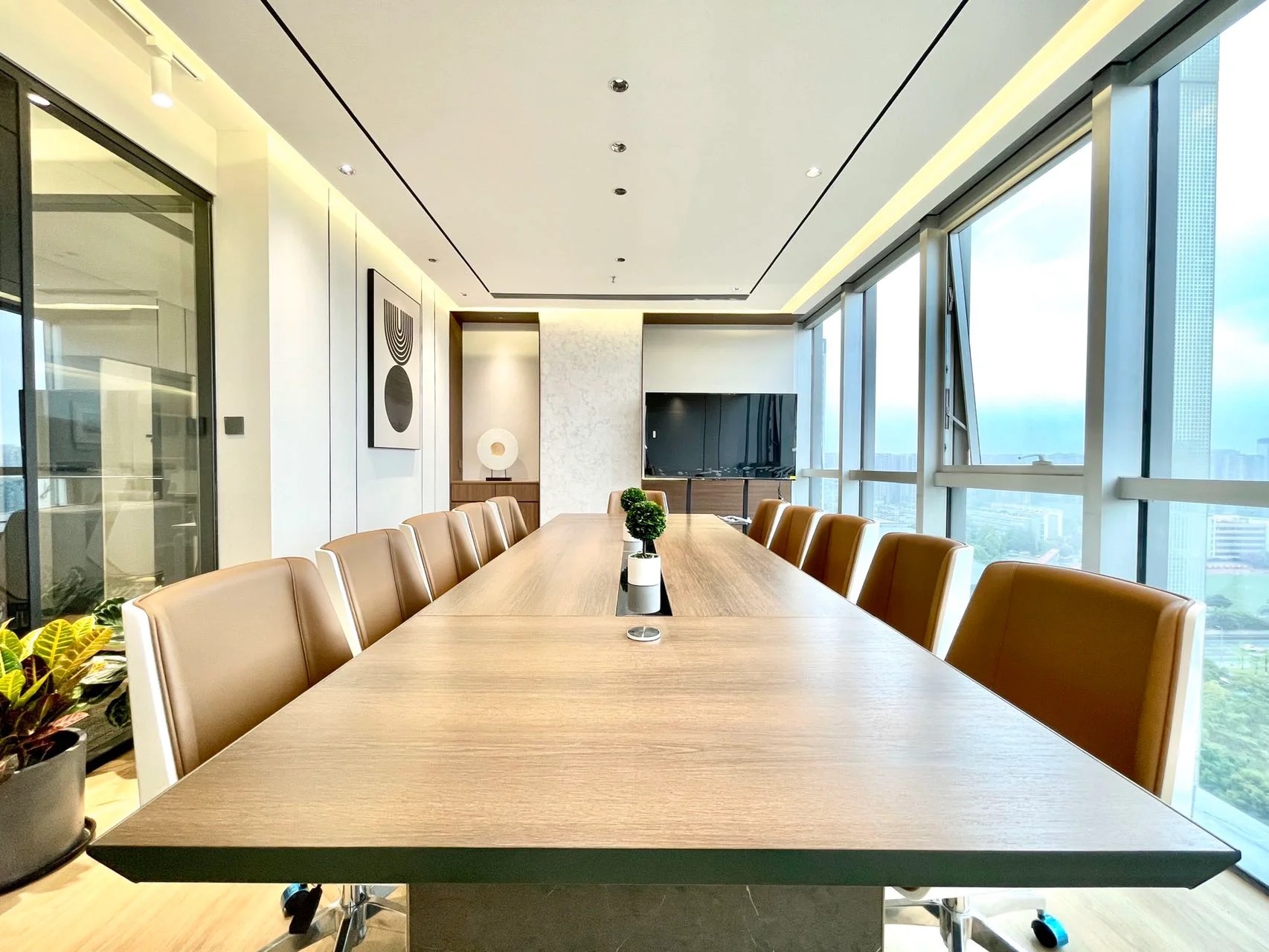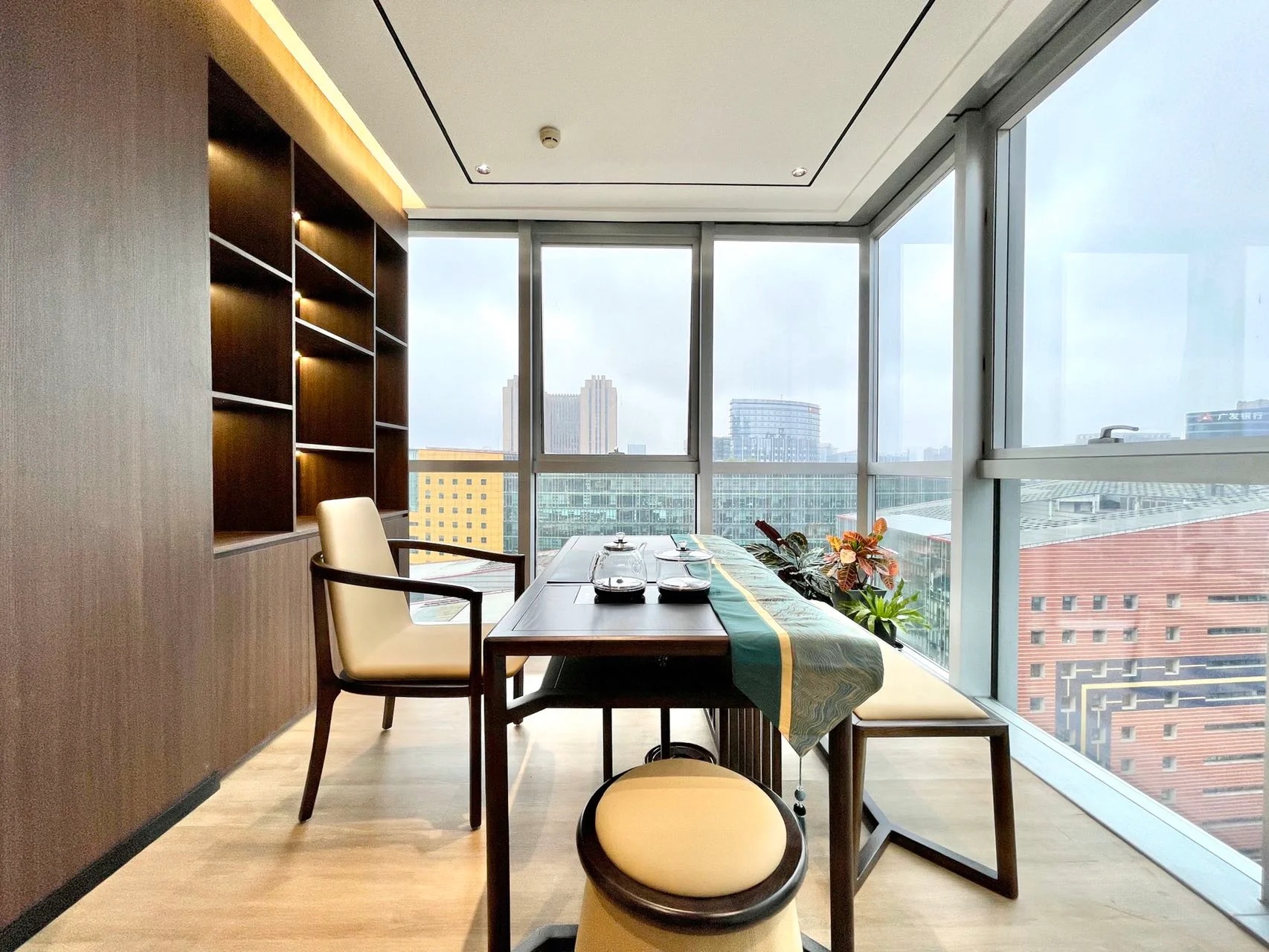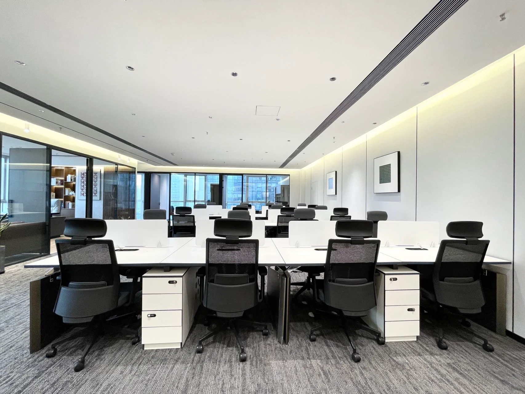 经理室采用大面积的落地窗,保证了充足的光照时间的同时让整个空间更加简洁明亮,透明的玻璃隔断代替了传统的非透明墙面,使整个空间视野更加开阔,打破了以往经理室封闭狭窄的空间。阳光穿透玻璃,照射到空间中去,可以在白天阳光充足的时候减少对人工照明设备的依赖。