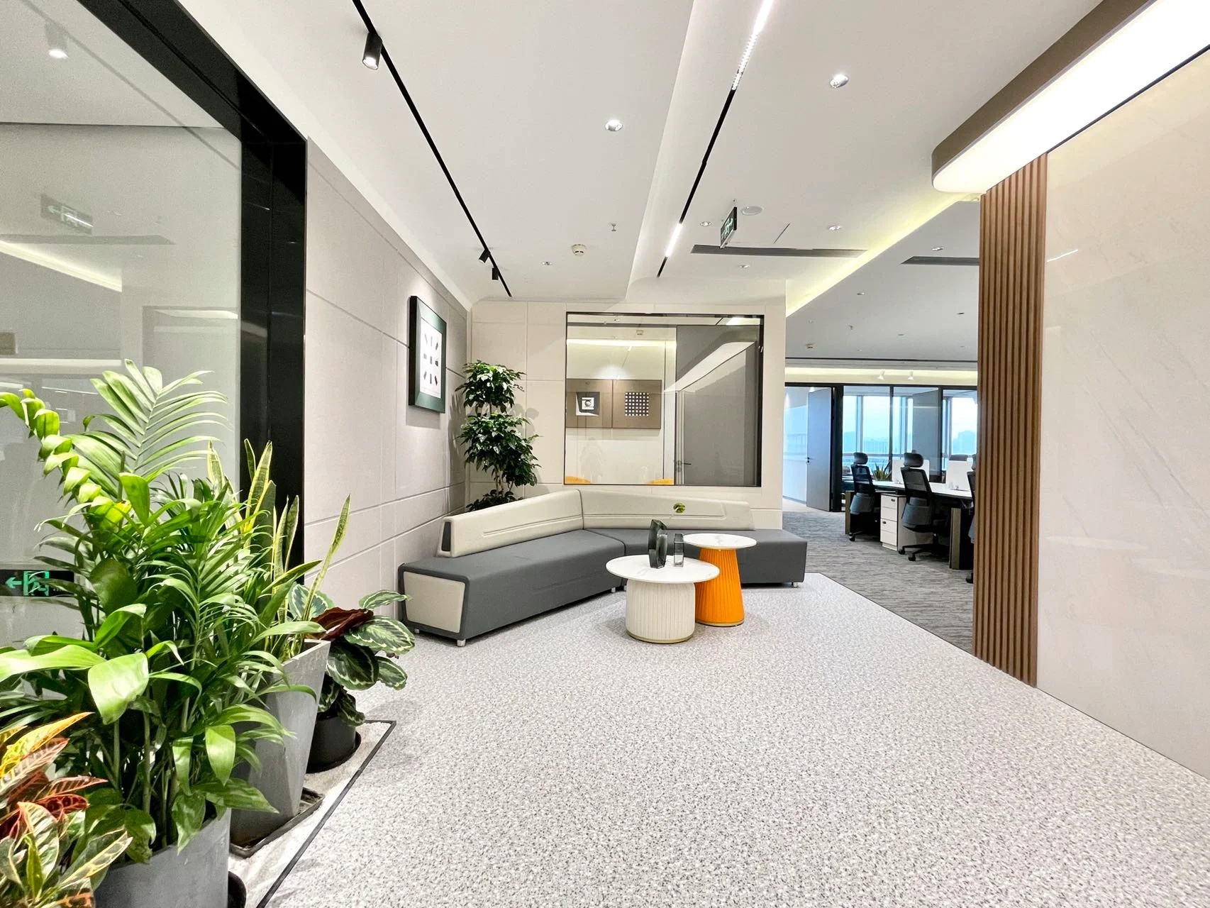 沿袭黑白灰的主色调,干净、简洁、沉稳,上档次,员工得以一心投入工作中。加入一些橙色挡板能适当打破单一色调,对视觉产生一定的冲击力。